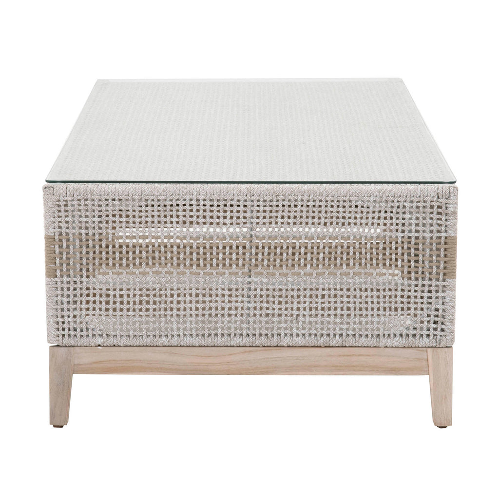 Enjoy a functional outdoor living space with the Essentials for Living outdoor coffee table. This coffee table features a tempered glass top with a powder-coated stainless steel frame and gray teak base. The steel frame is covered with a tightly woven taupe and white colored rope with an eye-catching solid taupe stripe interwoven at the center. Built to handle many weather conditions, the gray teak base also features horizontal bars that add support to the table. Paired with our outdoor end table, chairs and sofa, this coffee table lends a space to enjoy food, drinks and games while relaxing in your backyard or patio.