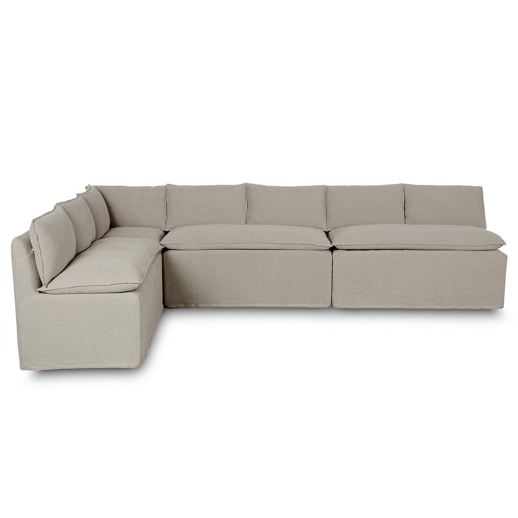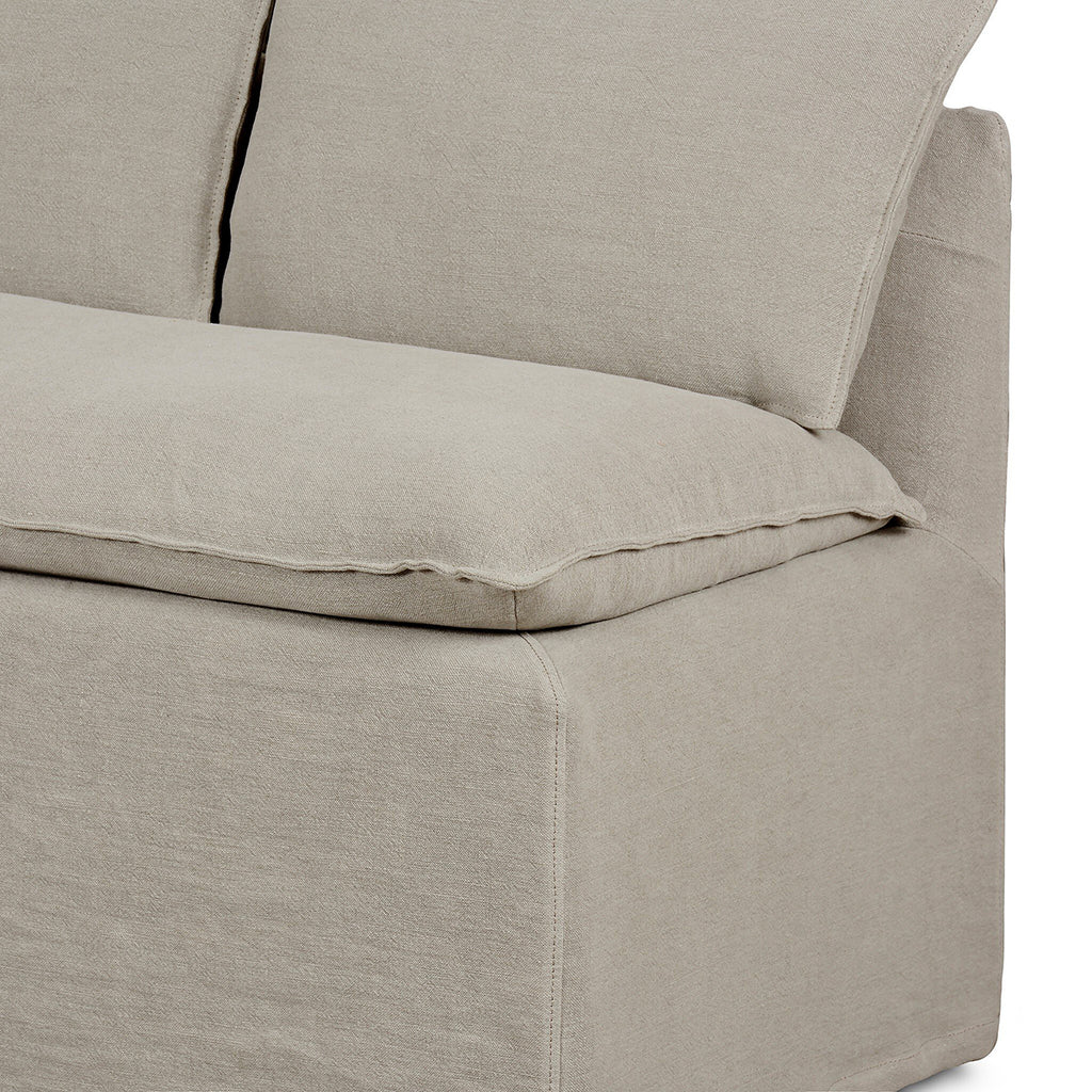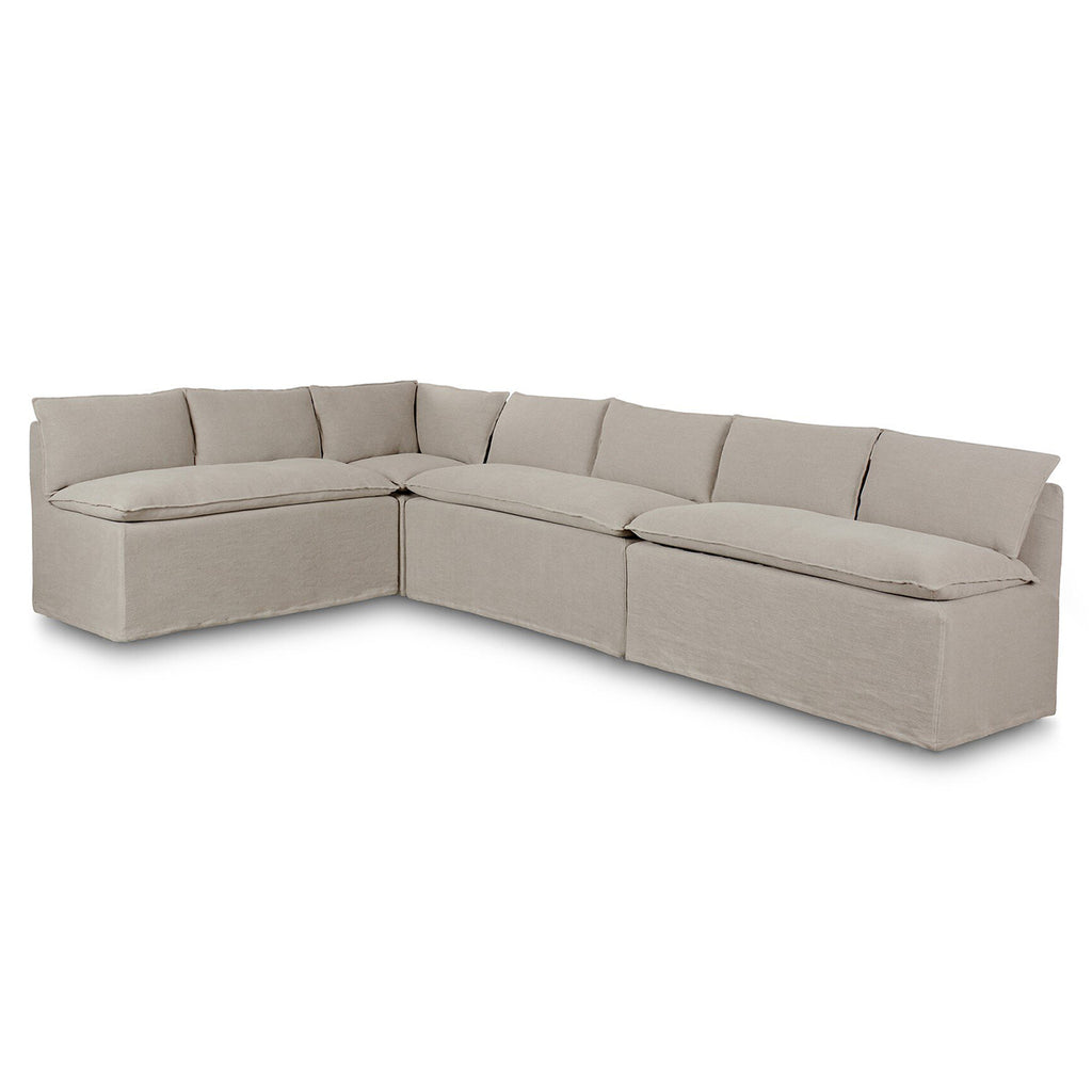A slipcovered modular banquette offers a clean, contemporary feel with casual flexibility. Feather-blend cushioning for sink-in comfort, plus flanged top seams for a tailored look. Fully removable slipcover is machine washable and handcrafted from 100% flax/linen, bringing a loose, relaxed look to the entire piece.