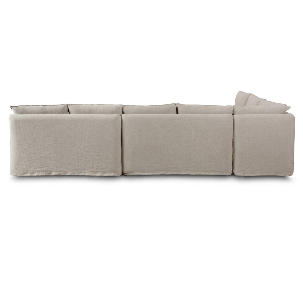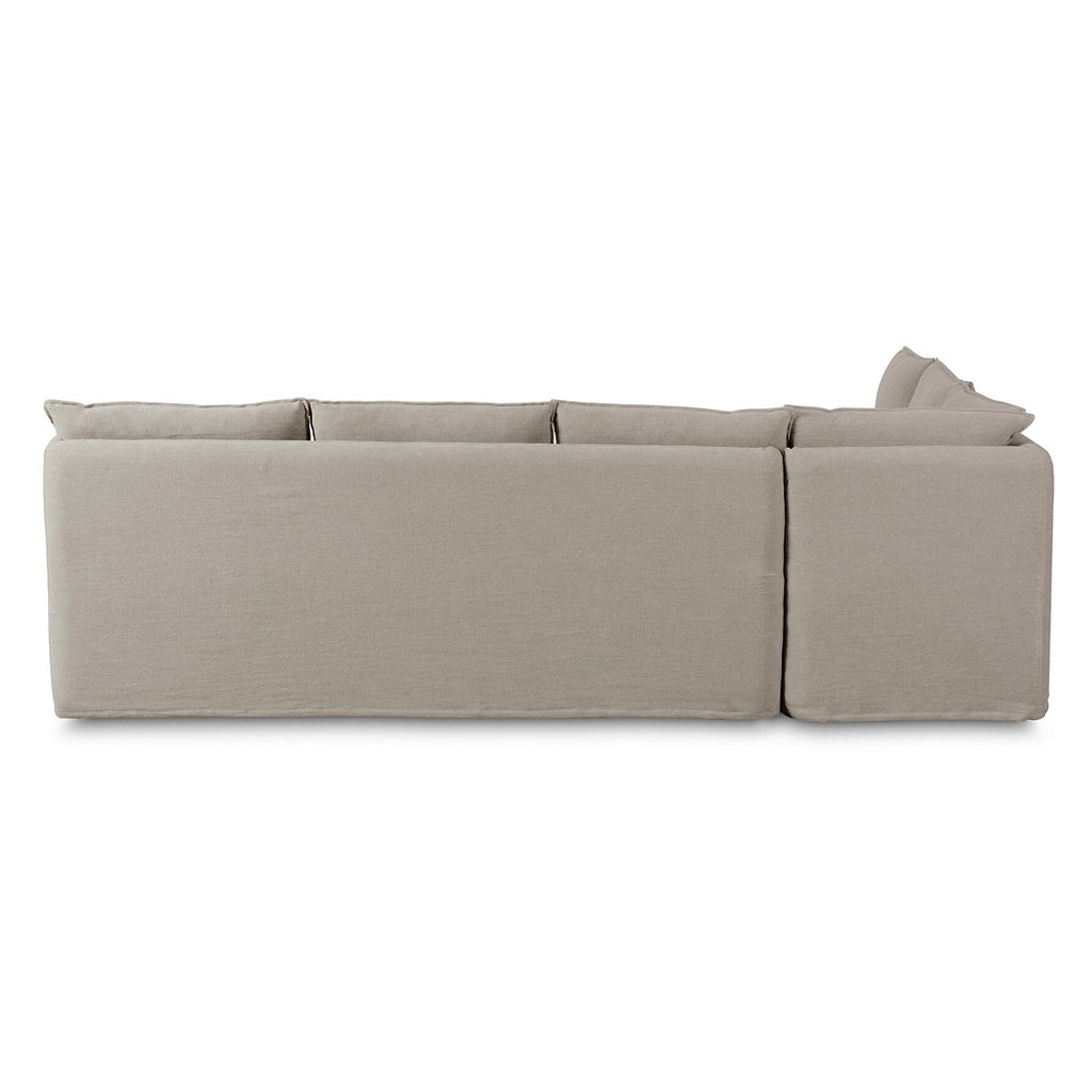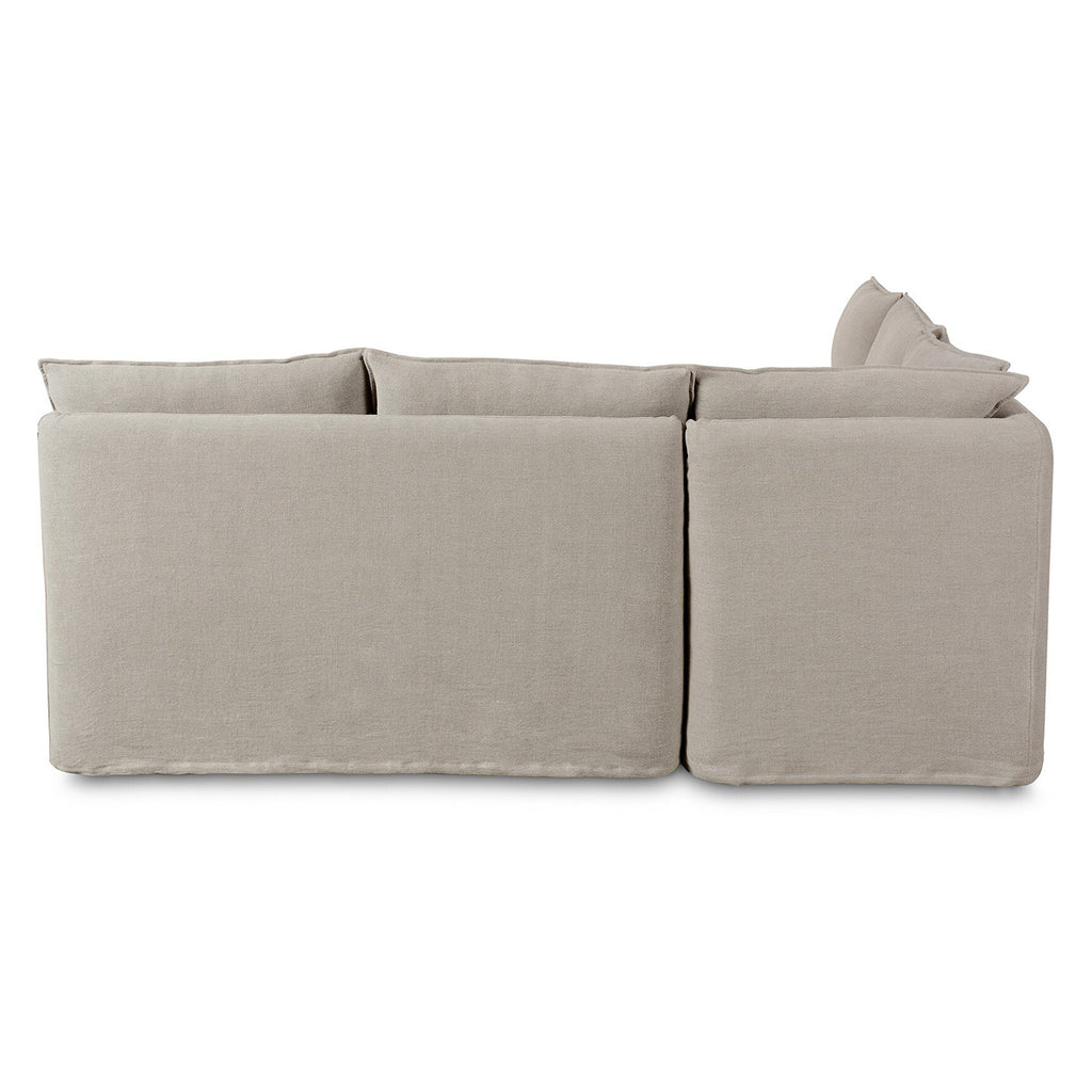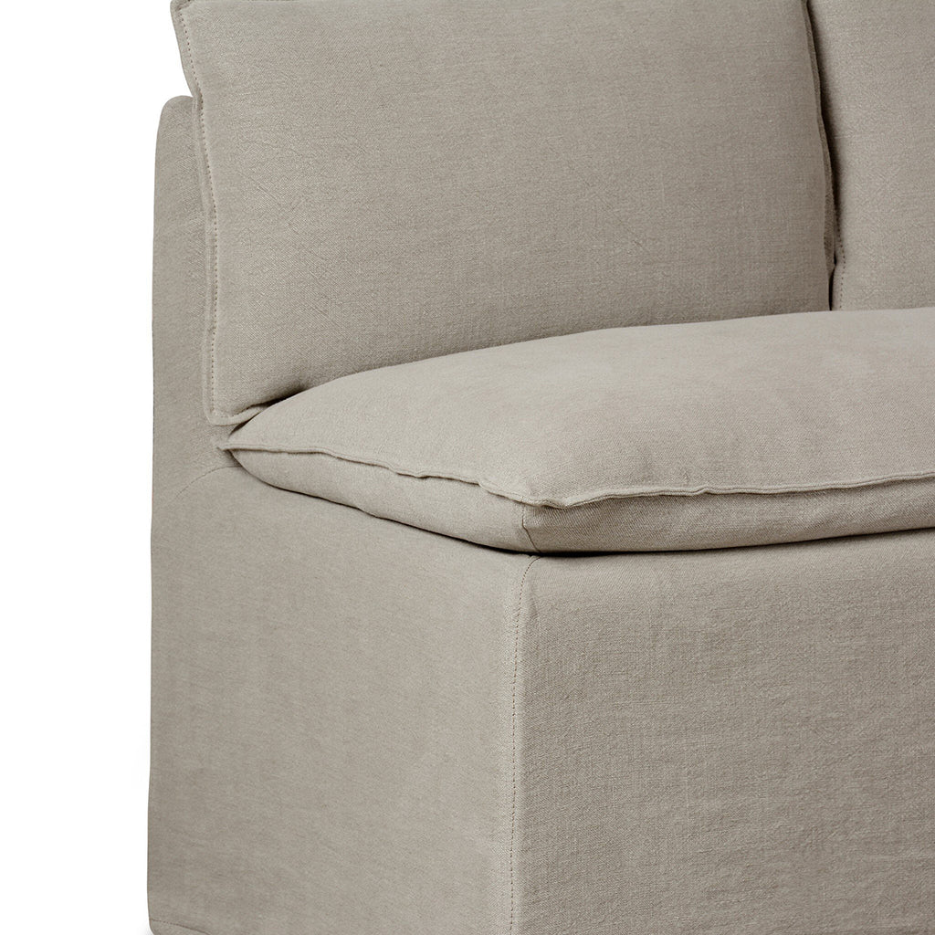 A slipcovered modular banquette offers a clean, contemporary feel with casual flexibility. Feather-blend cushioning for sink-in comfort, plus flanged top seams for a tailored look. Fully removable slipcover is machine washable and handcrafted from 100% flax/linen, bringing a loose, relaxed look to the entire piece.