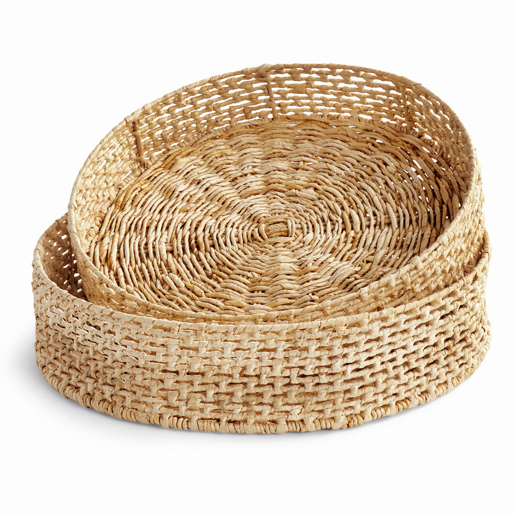 A species of banana, abaca is an upcycled, sustainable material. A very durable fiber, semi-bleached and varying in color, these baskets feature an open, criss cross weave, done by skilled artisans. Created to be overscale for wide open spaces, this set is perfect for ottoman, console or side table.