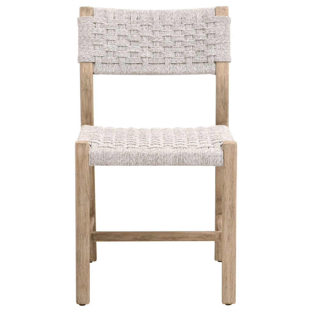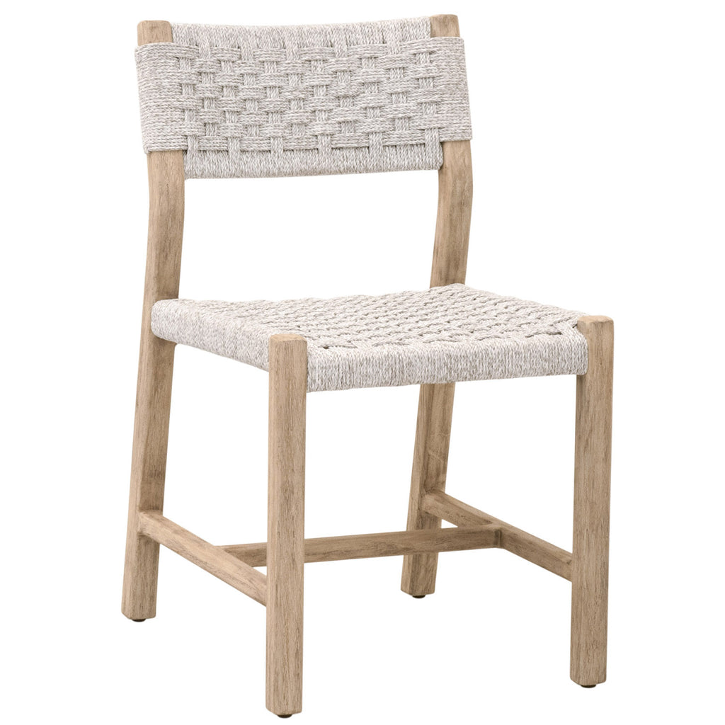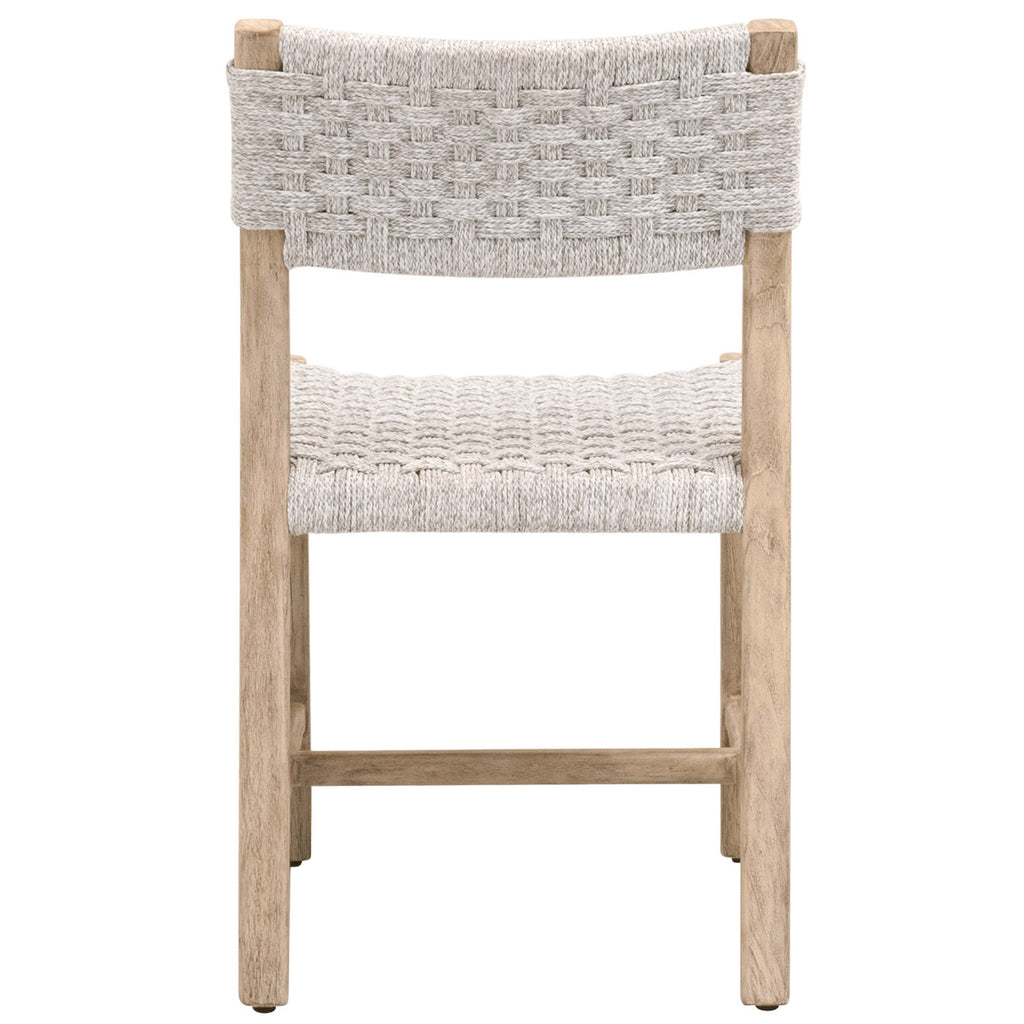 The Kitts Outdoor Dining Chair by Essentials For Living brings both coastal style and durability to any dining setup, indoors or out. Crafted with a solid teak wood frame in a Weathered Ever Teak finish, it measures 18.5" wide, 22.5" deep, and 32.25" high, with a comfortable seat height of 18.5". Its white speckle twist rope, made from resilient polyolefin, is meticulously handwoven to add texture and a beautiful weave design to the seat and back. The hand-applied teak coating helps to resist the natural aging process of teak, enhancing the longevity of the chair. The transitional design inspired by seaside styles ensures it blends seamlessly in various settings, delivering elegance with enduring quality.