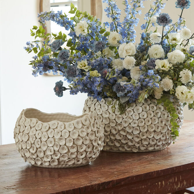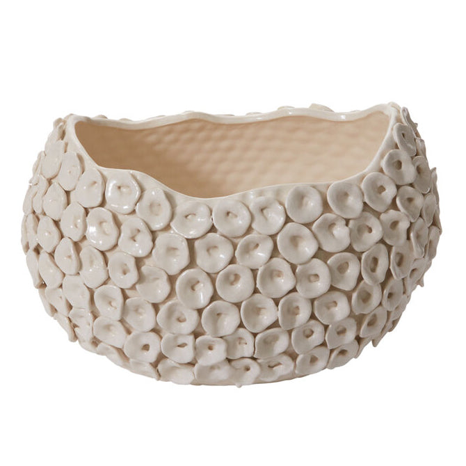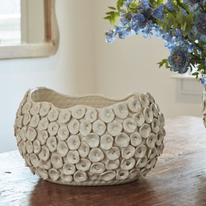 Create a captivating centerpiece that celebrates dimensionality, meticulous artistry, & sculptural design with the Luanda Bowl. This extra large, watertight, ceramic vessel features graceful curves & hand-sculpted & applied, dimensional, circular shapes across the exterior. Finished in an off-white, slightly glossy glaze, the shape is oblong with a wavy rim & offers a chic look to console or dining tables when filled with statement florals or an orchid.