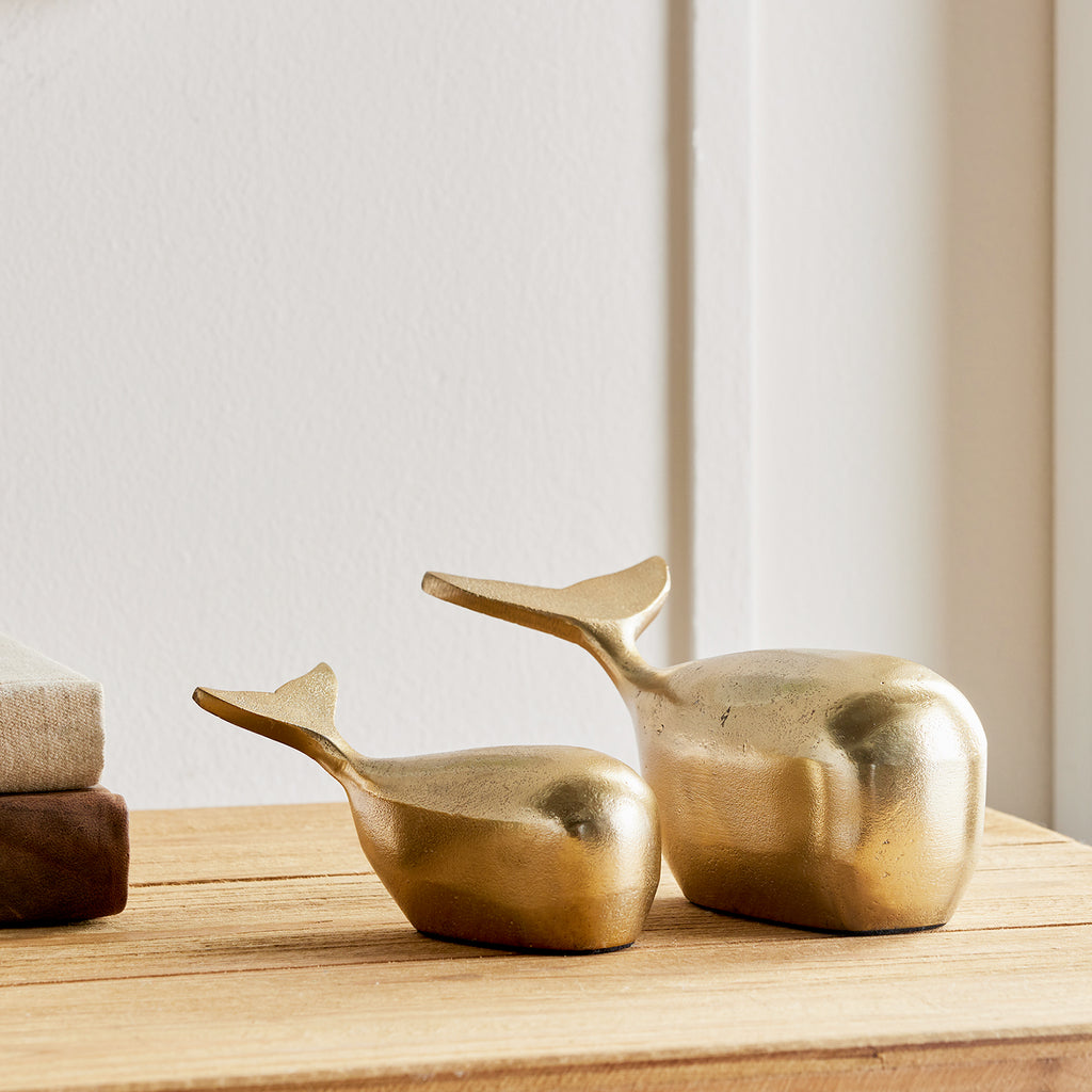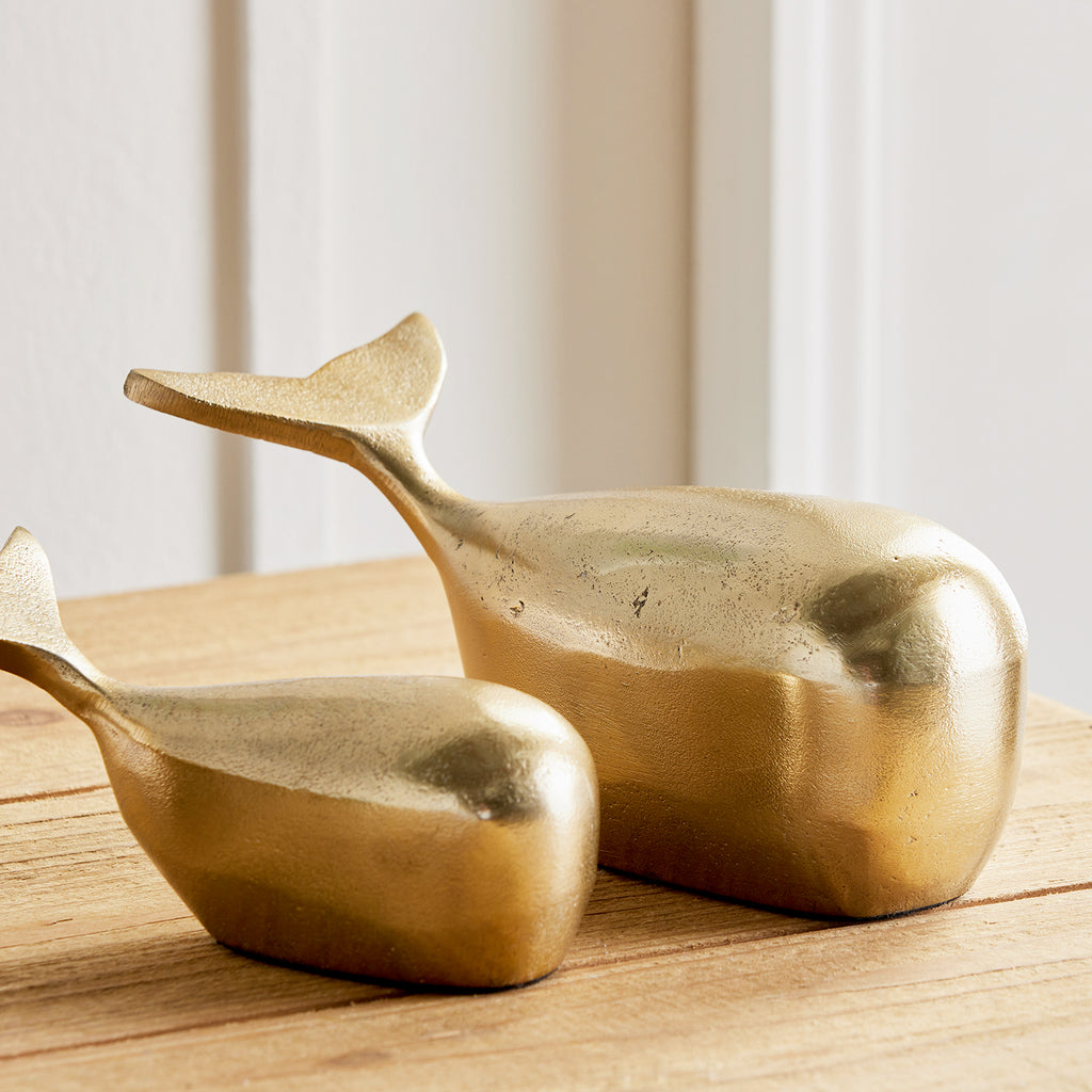 Quite a bit smaller than the real thing, these modern whale sculptures have just as much charm. Made of solid aluminum, this pair makes a great shelf accent for a coastal space, or anywhere to add a bit of character.