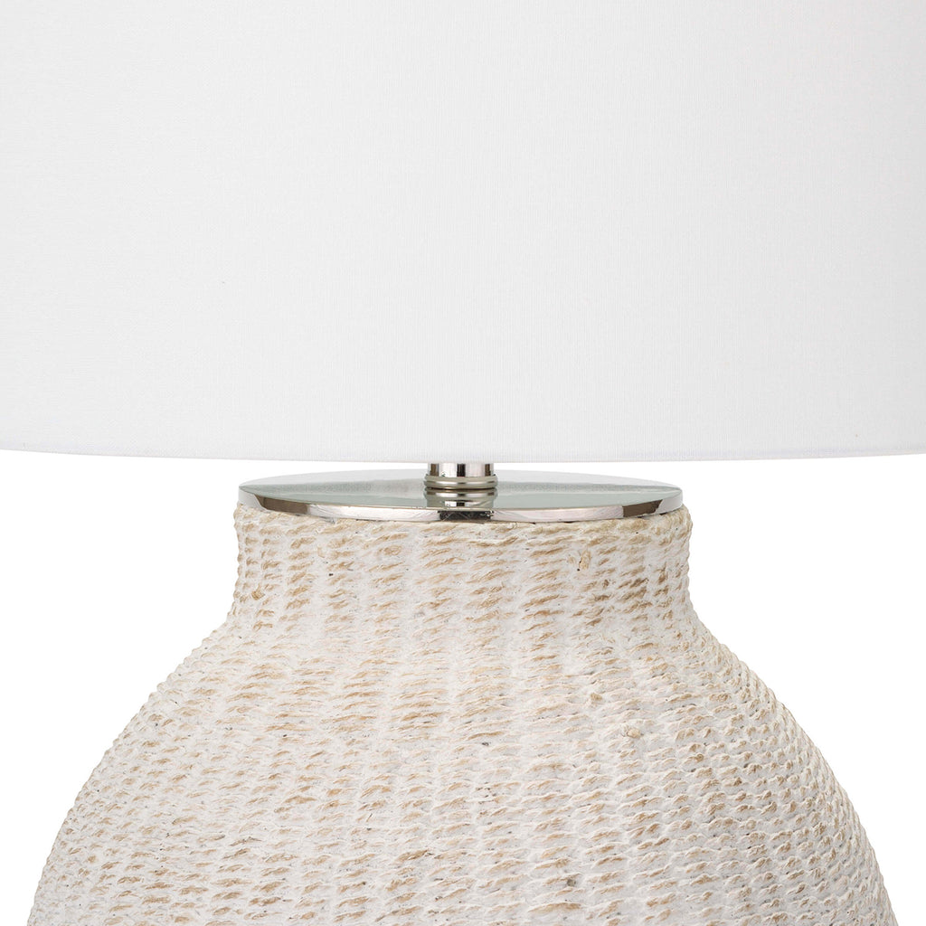 tA White-washed natural woven pattern highlights this lamp’s unique body shape. The Hobi’s perfect mix of organic charm and polished nickel detailing create a casual elegance perfect for a coastal retreat.