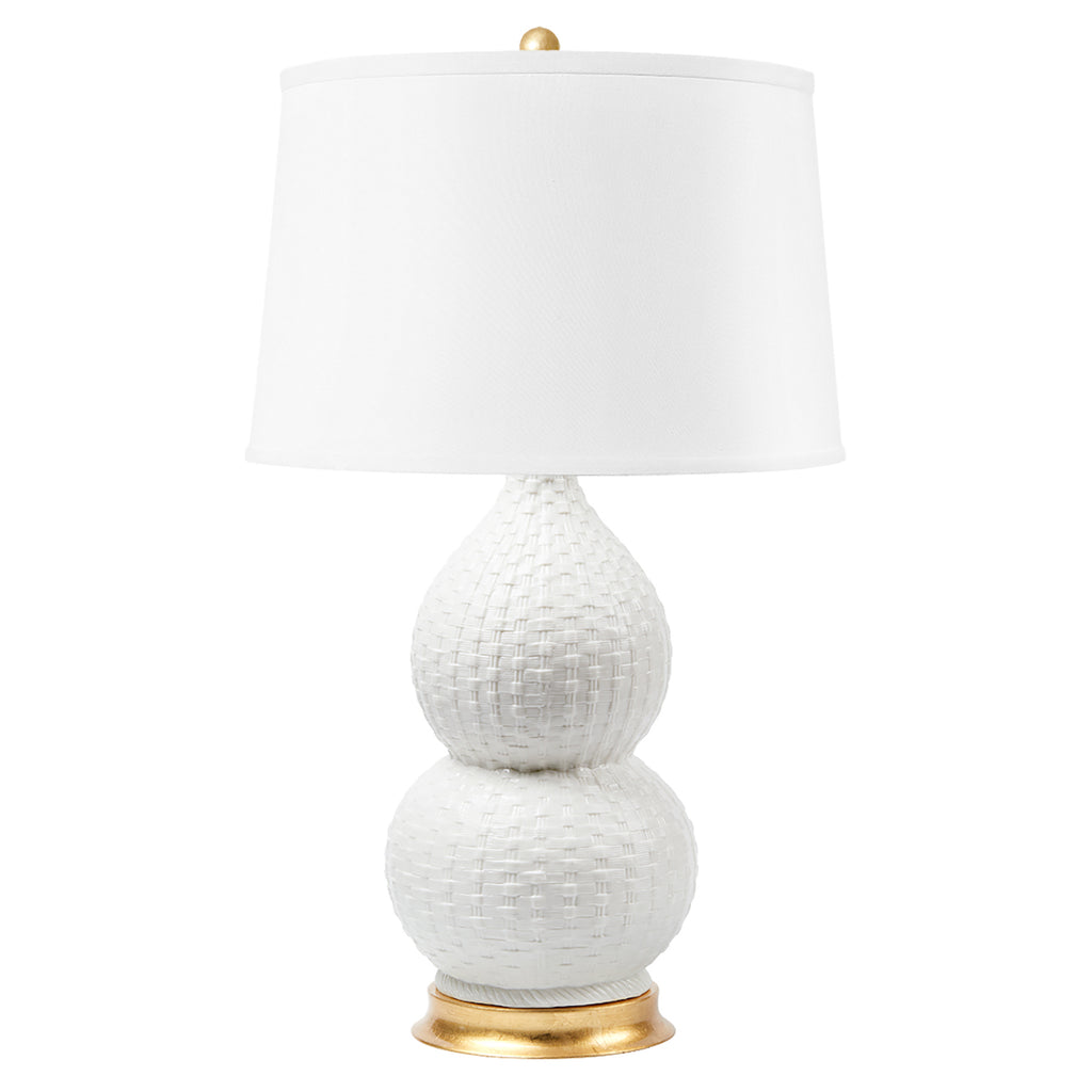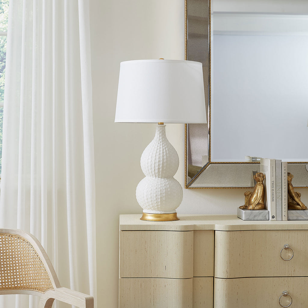 The V&H Charlotte Lamp showcases a refined blend of texture and form with its Blanc de Chine porcelain and intricate basket-weave pattern. It is a sculptural, eye-catching accent for any room.