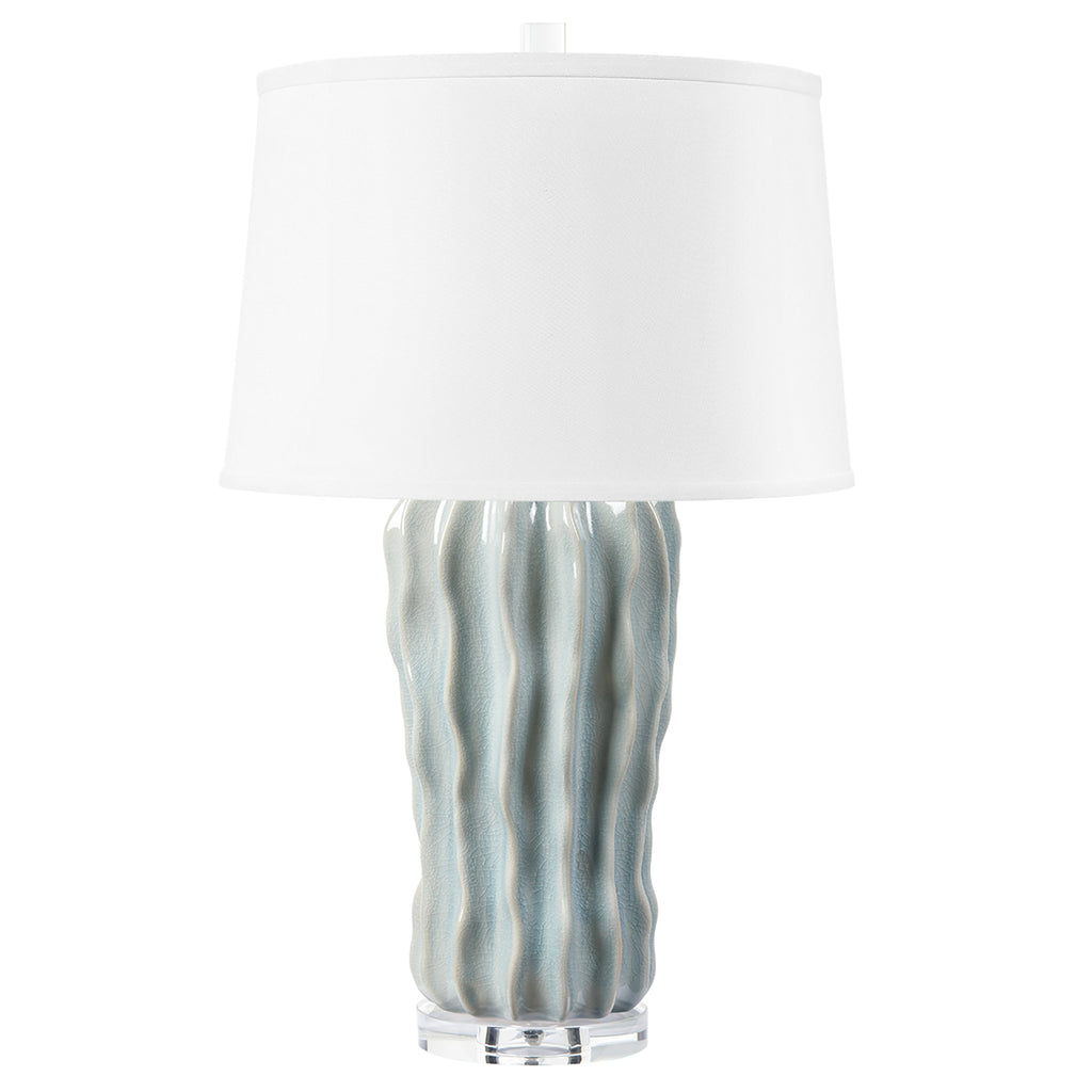 The Villa and House Malibu Lamp captivates with its cool, organic shape, reminiscent of the fluid forms found in sea life. Its wavy silhouette adds a sense of movement, a dynamism, wherever it is placed. The transparent crackled glaze reveals the bisque underneath, adding depth and dimension to its artistic design. Resting on a clear acrylic base and topped with a sleek column finial, the Malibu Lamp is a striking statement piece that effortlessly combines natural inspiration with modern sophistication.