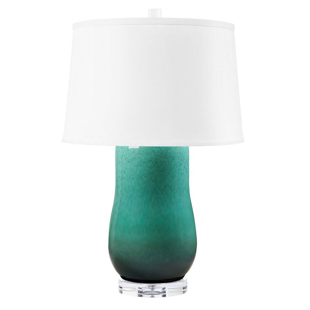 The Villa and House Savannah Lamp showcases a smooth bottle silhouette with a gracefully widened bottom, reminiscent of a butternut squash. Its ceramic body features a captivating ombré glaze effect, adding depth and vibrant interest to the design. Resting on a clear acrylic base and topped with a sleek column finial, this lamp blends organic elegance with modern style.