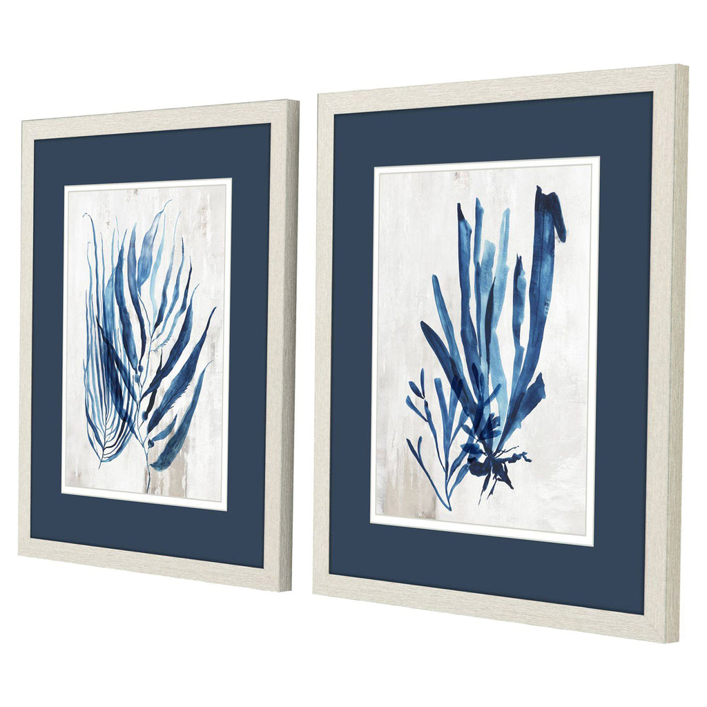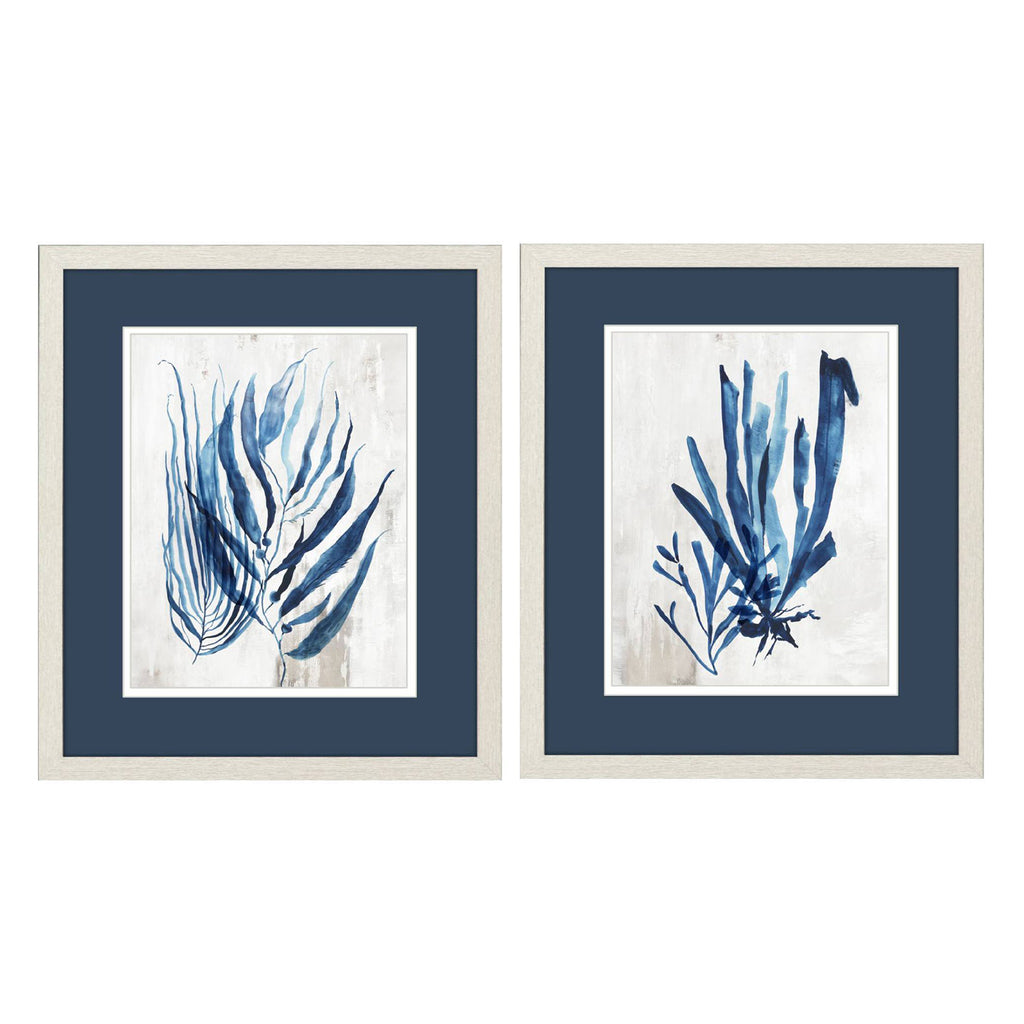 A set of two navy coral prints. The set is double matted and framed under glass with a complimenting distressed white wash frame.