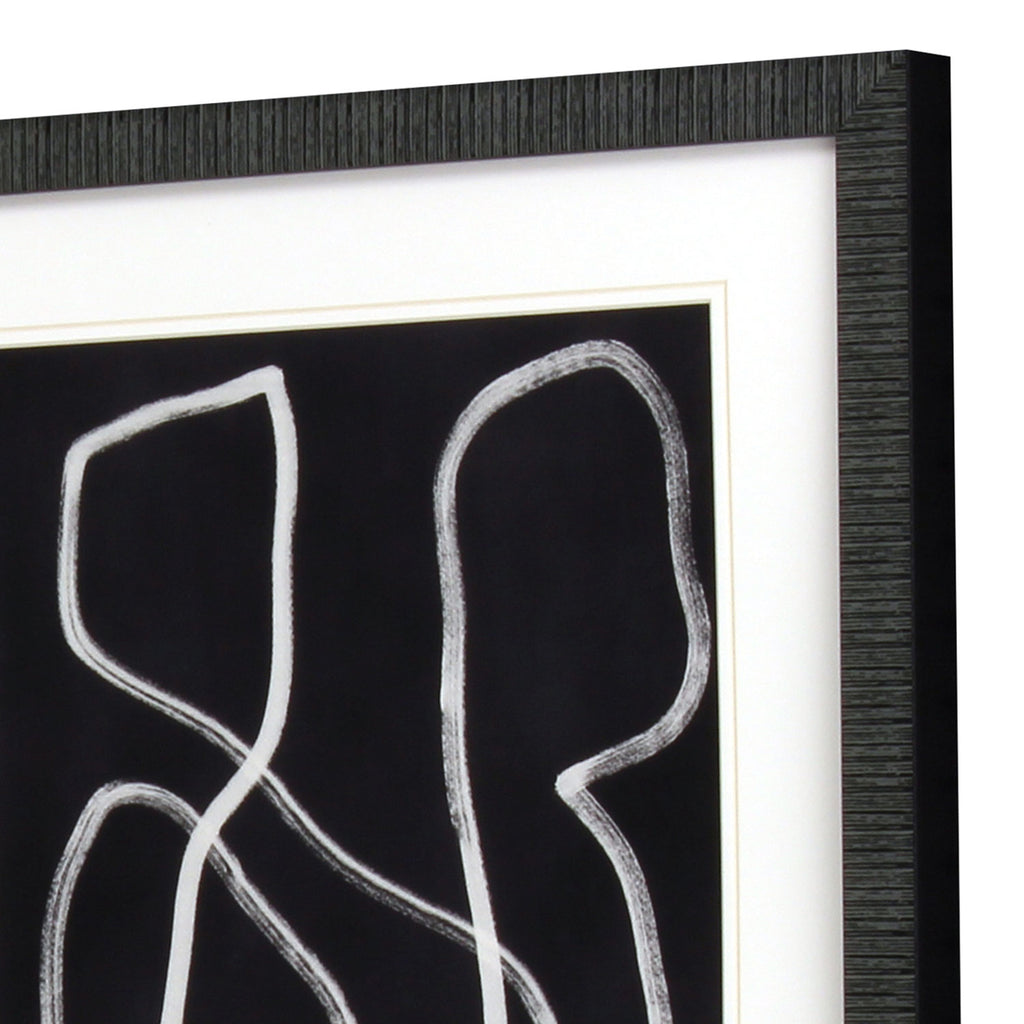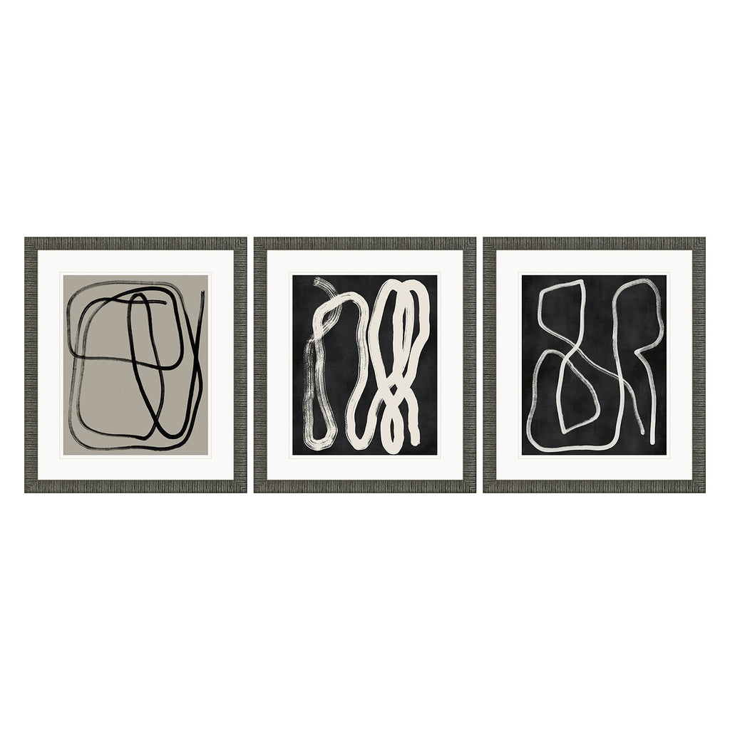An abstract series features twirling lines in geometric shapes. Matted in white and framed in a distressed black finish moulding with gray wash. Sold as set of three.