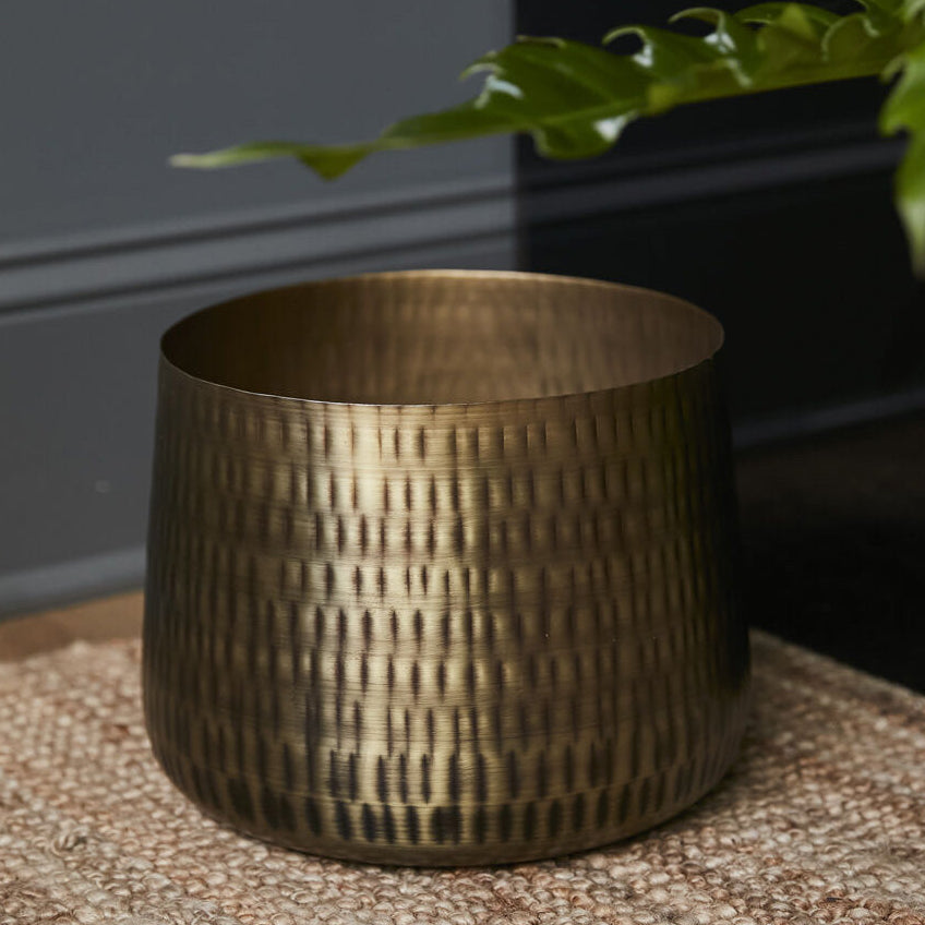 Made from distinctive, lightweight metal with hammered, tick mark detailing across the surface, the stunning metal Jardin Pot brings a timeless elegance to home decor. Featuring a simple silhouette, a warm antique gold finish, a circular base, & slight tapering from the bottom to the top, this watertight pot easily coordinates with any interior design style. Add florals or a 8-inch drop-in plant for a classic, elevated look.