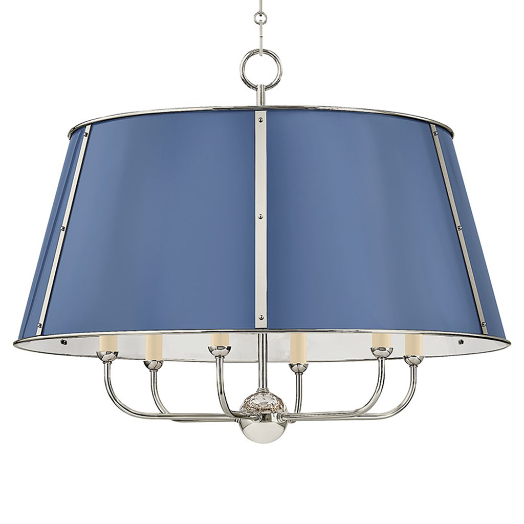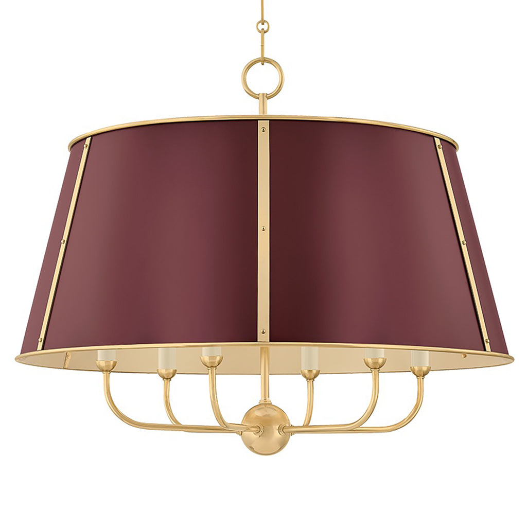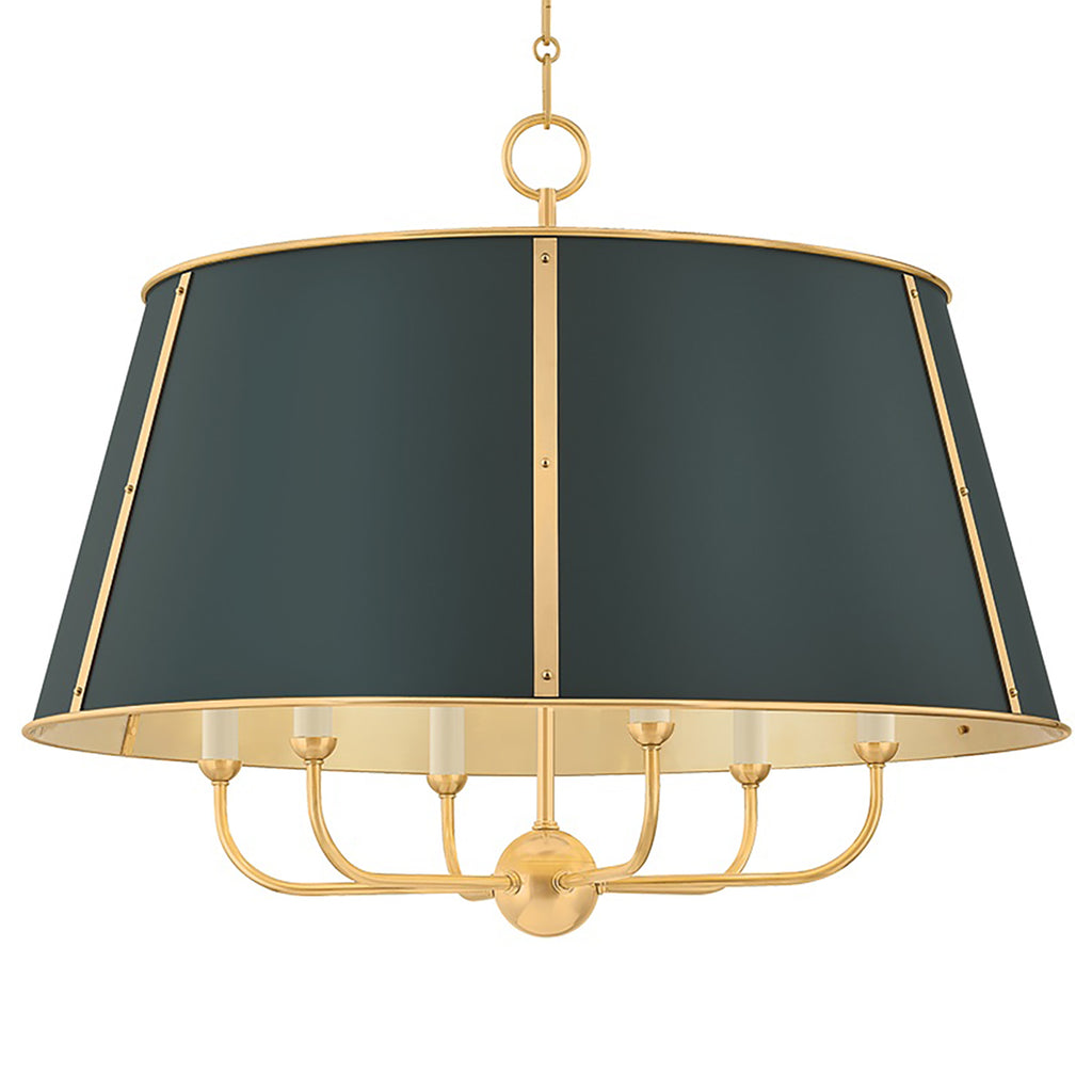 The Mark D. Sikes x Hudson Valley Lighting Cambridge family features refined, metal drum shades with sleek details. The brass interior of the chandeliers amplifies light when illuminated, creating a warm, atmospheric glow. Strips of metal with visible screws add a modern touch, giving each fixture a distinctive industrial flair. Available in 4 and 6-light formats, Cambridge is well-suited to a dining room or kitchen. Available in three finish options, Aged Brass and Soft Studio Green, Aged Brass and Soft Crimson and Polished Nickel and Soft French Blue.