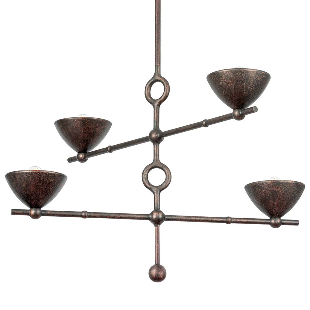 Inspired by the work of renowned Italian artist Alberto Giacometti, the Troy Lighting Vishal family makes an impact with its sculptural framework and heavily patinated finish. The shades resemble dishes filled with light while the spindly arms are accented by ornamental circular motifs. The allover Black Patina Gold finish continues the art historical reference, adding an organic, hand-applied, and weathered effect. Vishal is available as a 1-light sconce and 4 or 6-light chandelier.