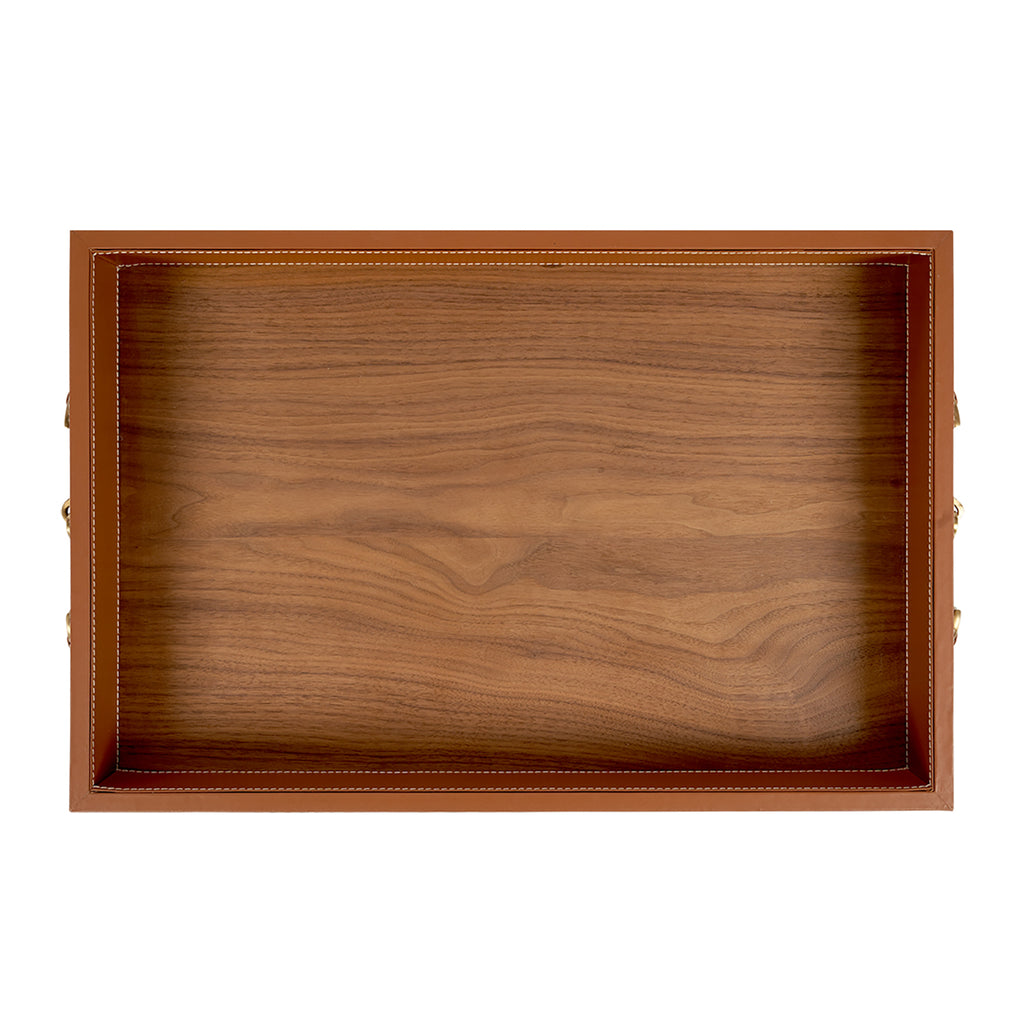 The Villa and House Buckley Rectangular Serving Tray exudes equestrian charm with its refined and sophisticated design. The frame is meticulously finished in top-stitched leather, bordered by a matching leather ribbon for a a cohesive and polished look. Two antique brass horse bit details add an elegant touch, enhancing its timeless appeal. The tray bottom is safeguarded with a clear lacquered veneer to protect the leather from spills, while a felted underside ensures it is gentle on any surface. Perfect for entertaining or as a decorative accent, this tray seamlessly complements both modern and traditional interiors.