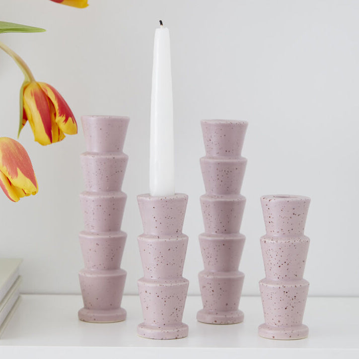 Bring modern, playful style & trendy color to event centerpieces or home decor with the the ceramic Bryce Candleholder. It holds a standard size taper candle & fits under a 2.5-inch glass sleeve. Featuring stacked ceramic shapes, a smooth, speckled & a sturdy, circular base, this piece makes a fun & contemporary addition to wedding & event design or home & gift retail.