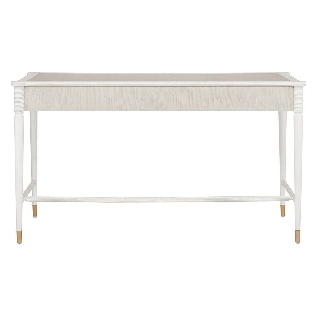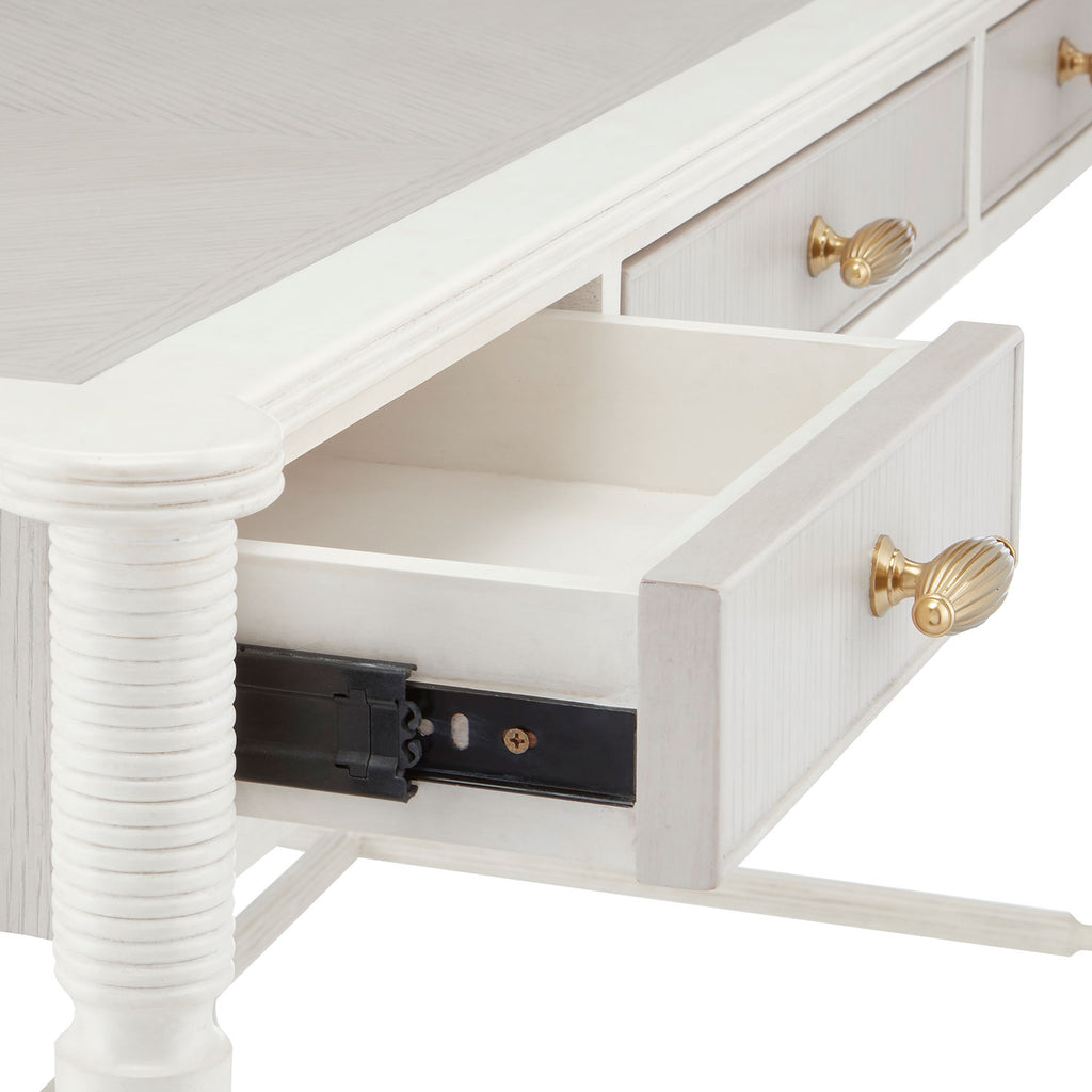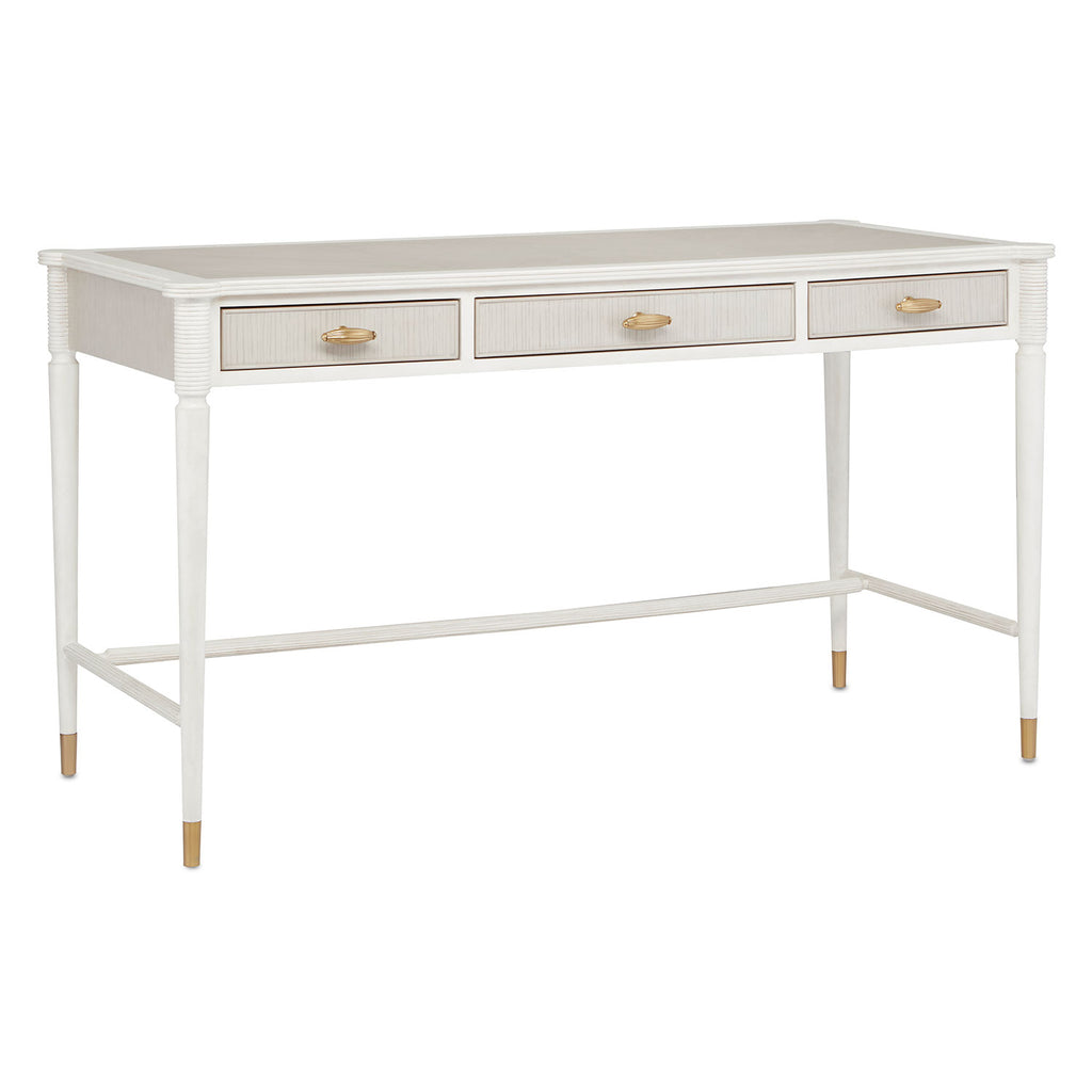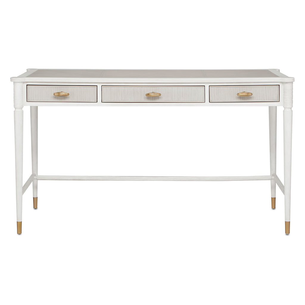 Made of mahogany and oak in a mix of Off White and Fog finishes, the Currey & Co Aster Desk was inspired by an antique from the Winterthur Museum. The gray and white desk has three drawers on which the brass pulls are warm accents in a brass finish. Also available as a nightstand.