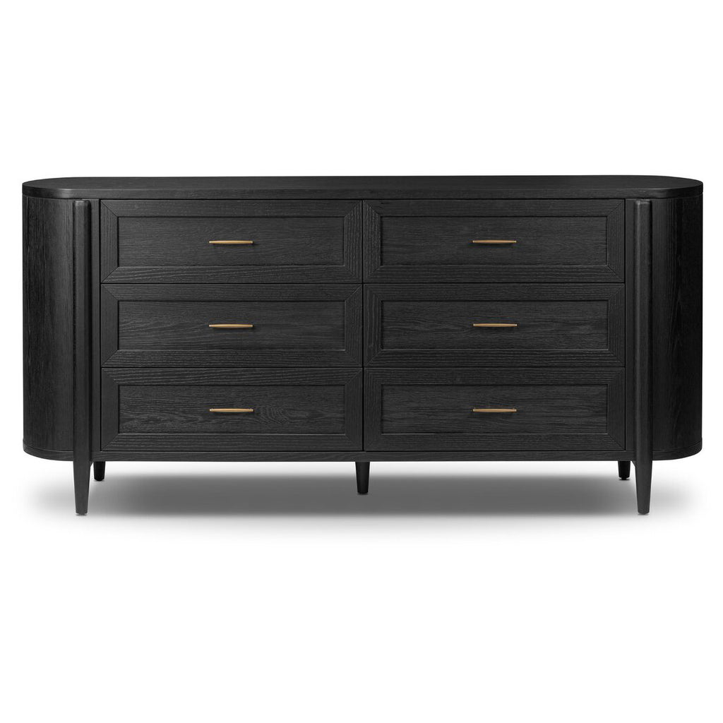 Infuse your collection with timeless midcentury design. Crafted from oak and parawood, a six-drawer dresser is finished in a matte black, with simple brass hardware.