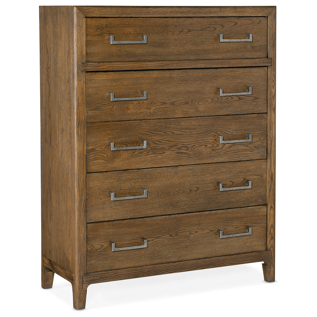 Craftsman style gets a modern twist with the Chapman Five-Drawer Chest, made of White Oak Veneers in a warm brown Sorrel finish that reveals the authentic woodgrain. Custom hardware in a forged pewter finish offers an appealing accent to the silhouette. The top drawer has a removable gray felt liner and the bottom drawer is cedar-lined.