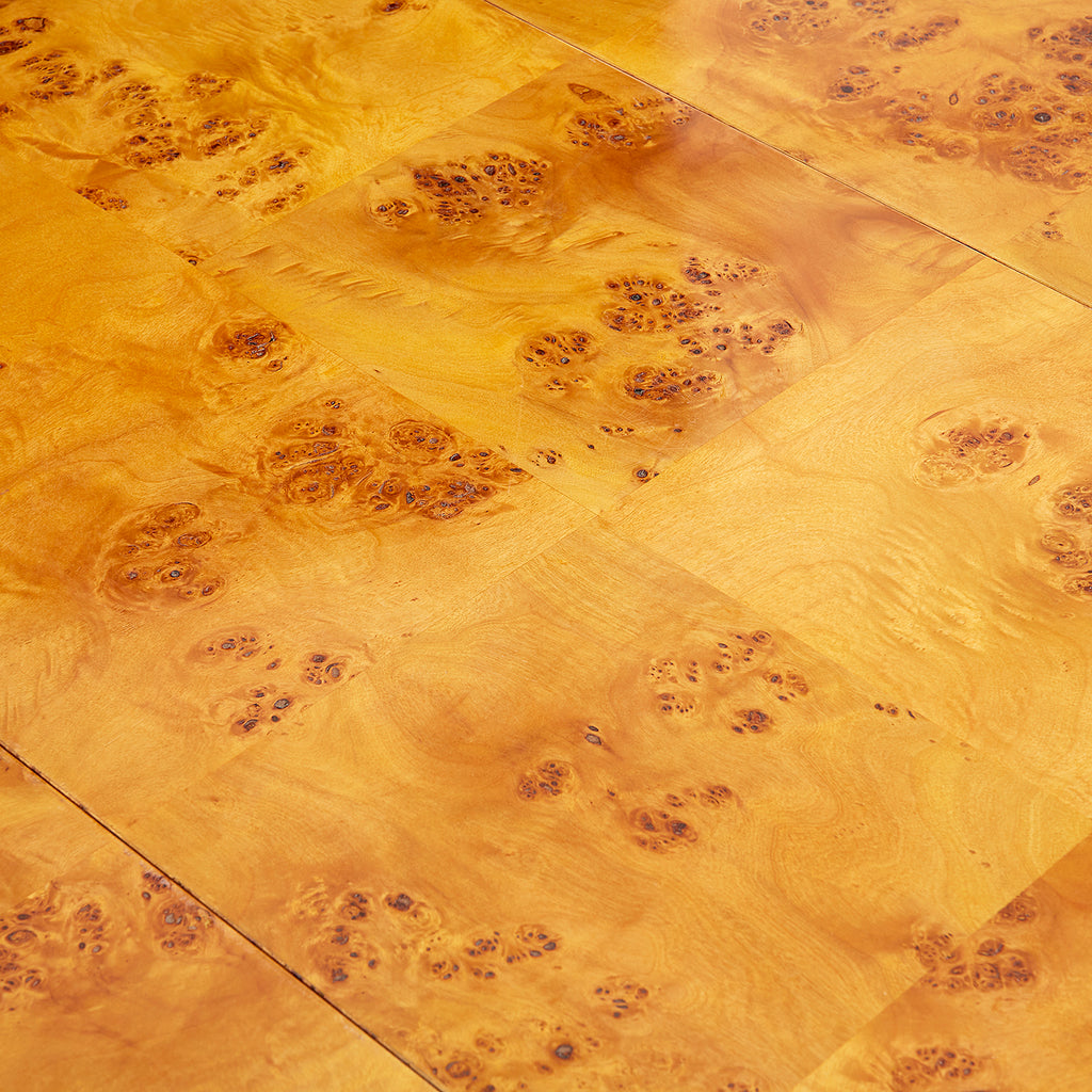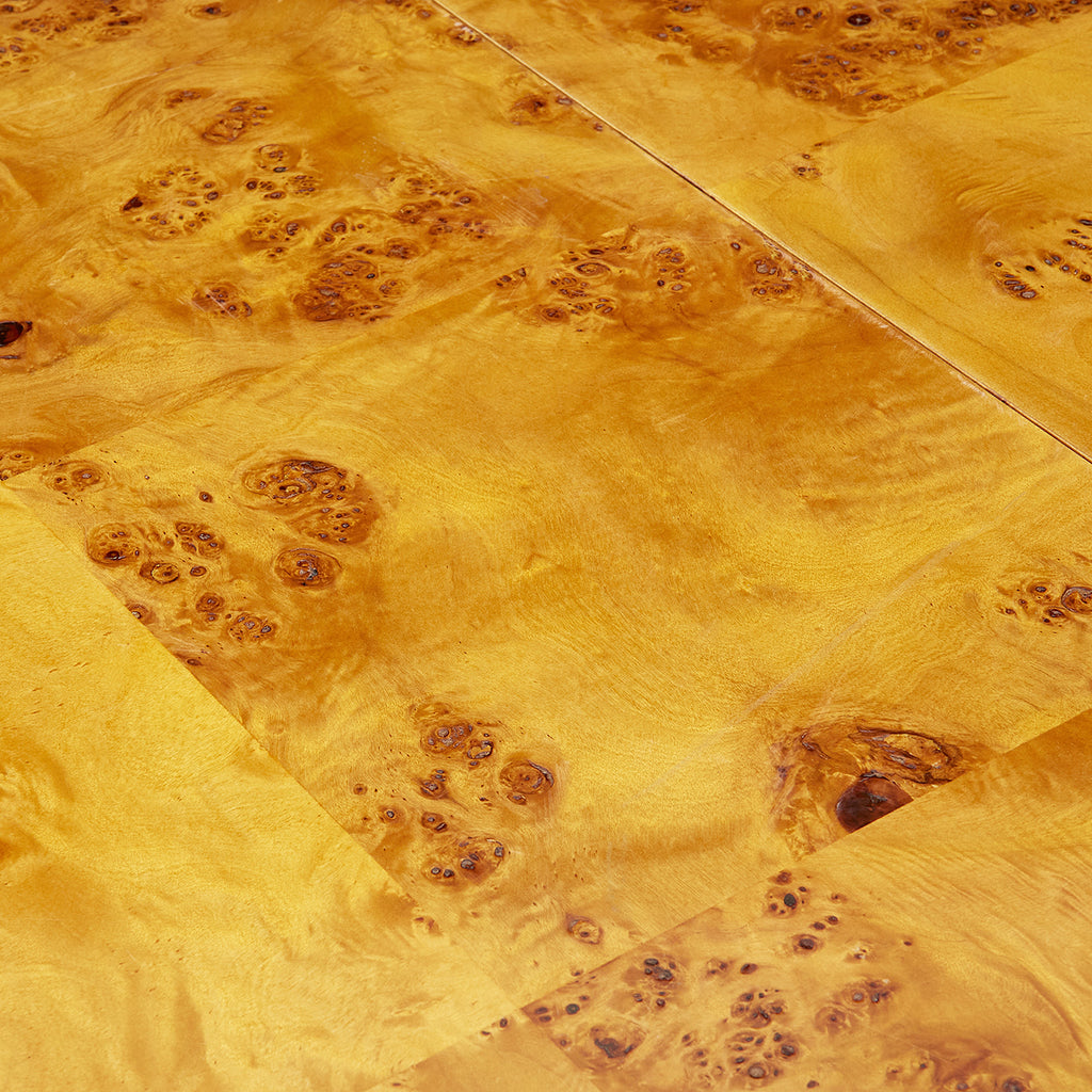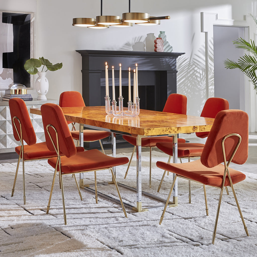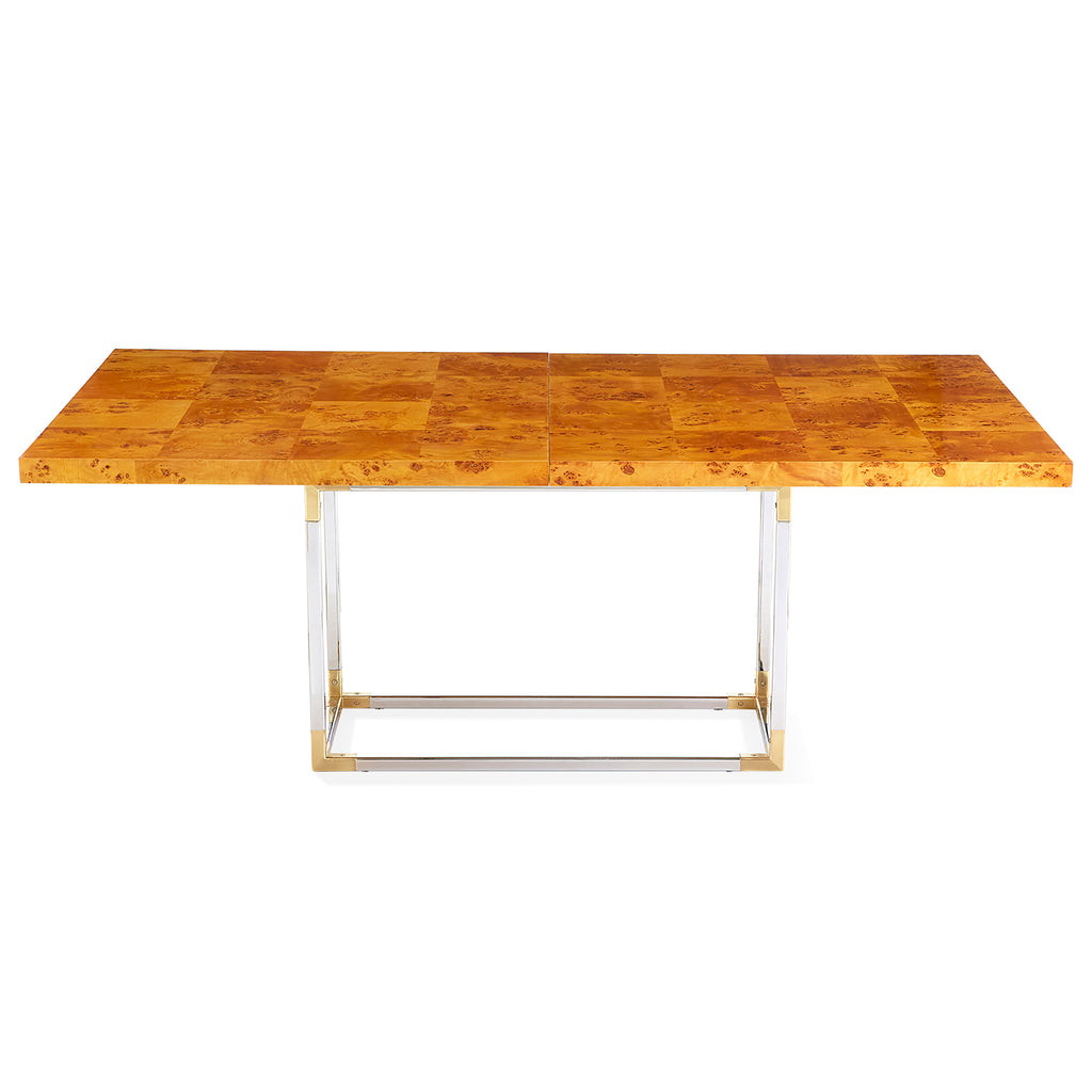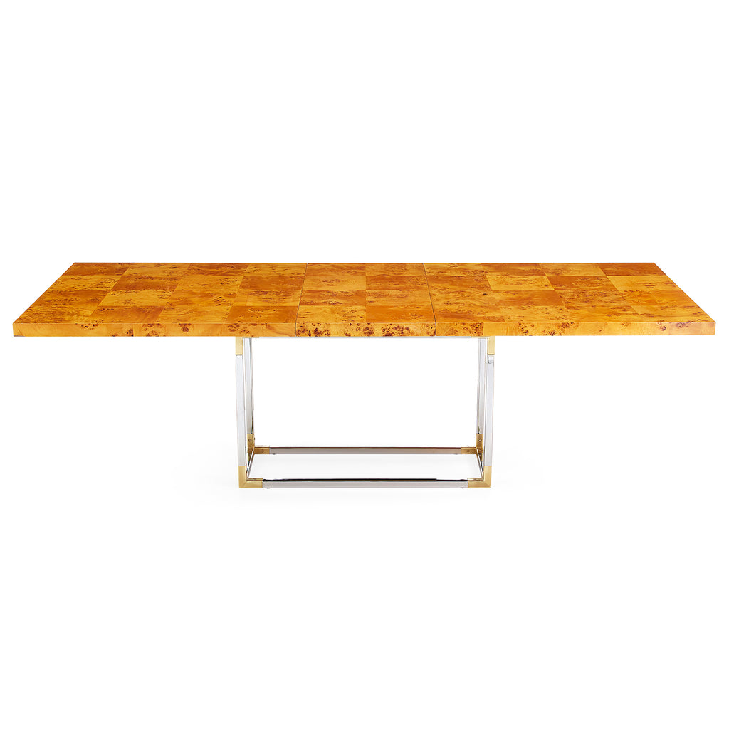 Architectural rigor meets the warmth of burled wood in the Jonathan Adler Bond collection. Finally—a minimalist dining table that feels organic, worldly, and wonderfully warm. Naturally honey-hued, pieced mappa wood is treated to a durable satin matte finish and set atop a polished nickel base featuring matte brass campaign corners. A removable 20" leaf extends the table to comfortably seat up to 10. Perfect for a posh Park Avenue penthouse or a louche Tribeca loft.