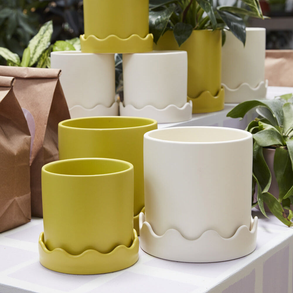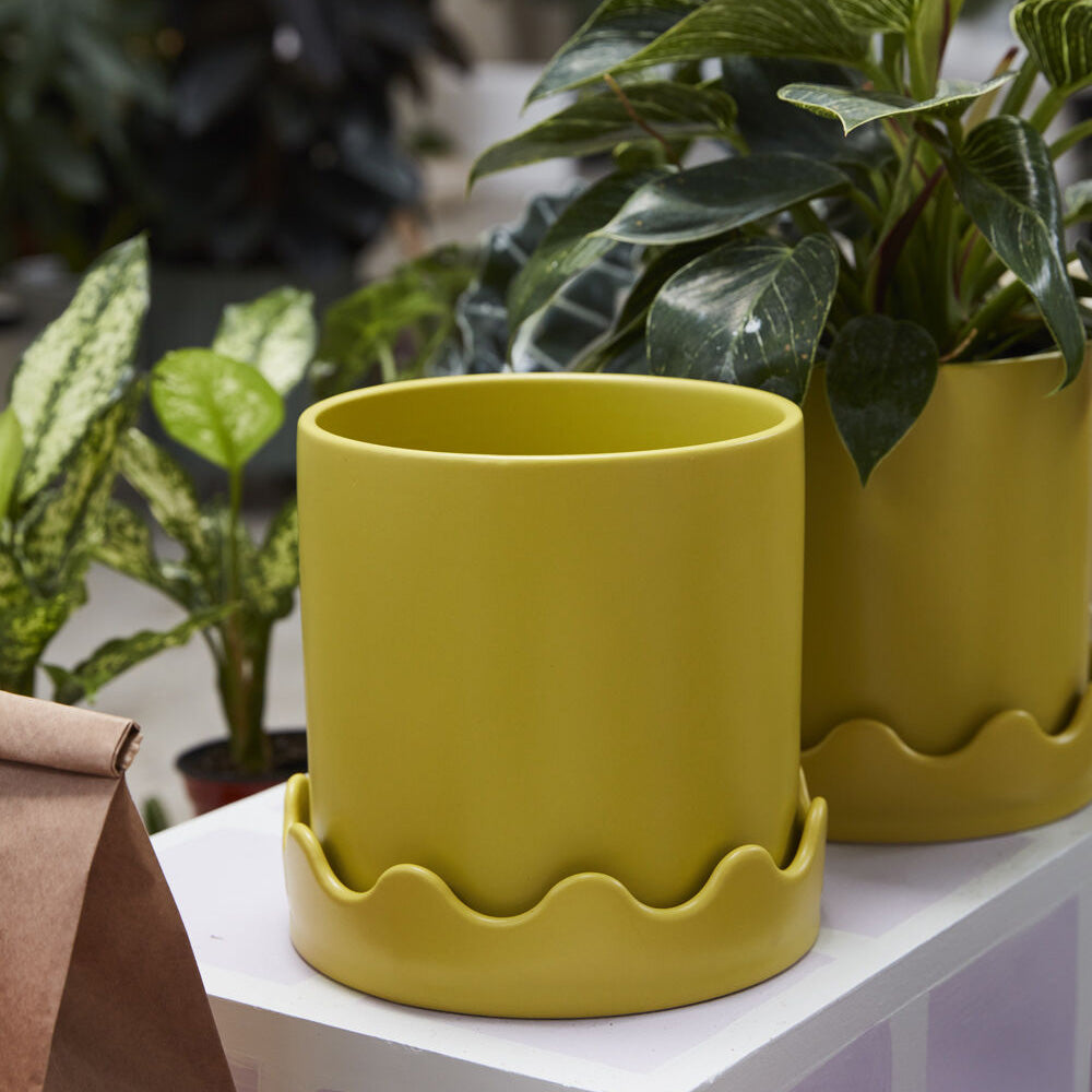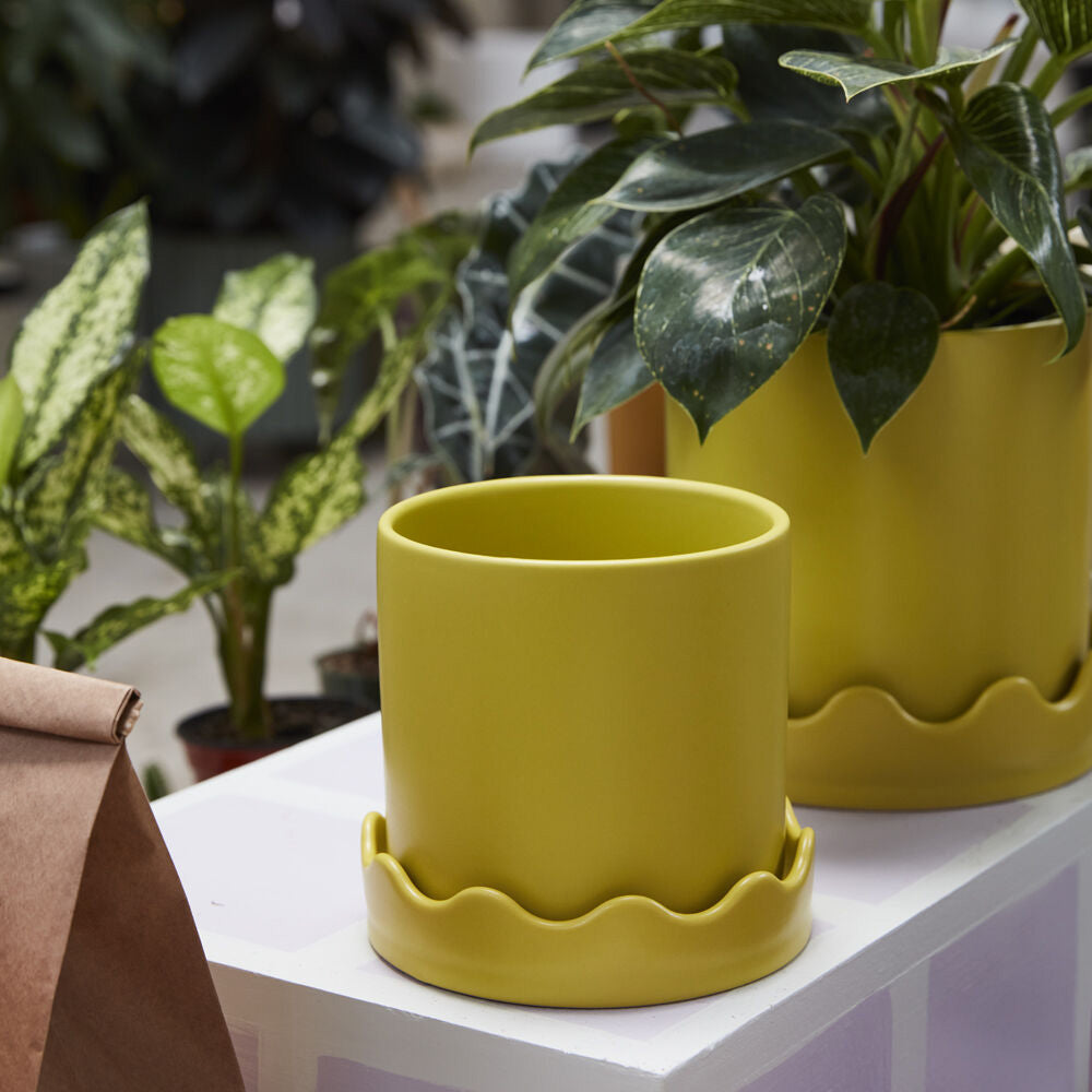 Meet the Pissaro Pot, featuring a classic design up top & squiggle party on the bottom. This smooth matte citron green ceramic pot features a drainage hole with a wavy-rimmed saucer for a tonal decorative detail & a playful take on the standard pot & saucer combo.