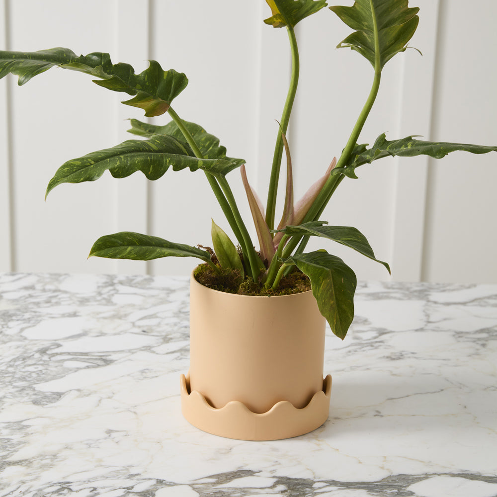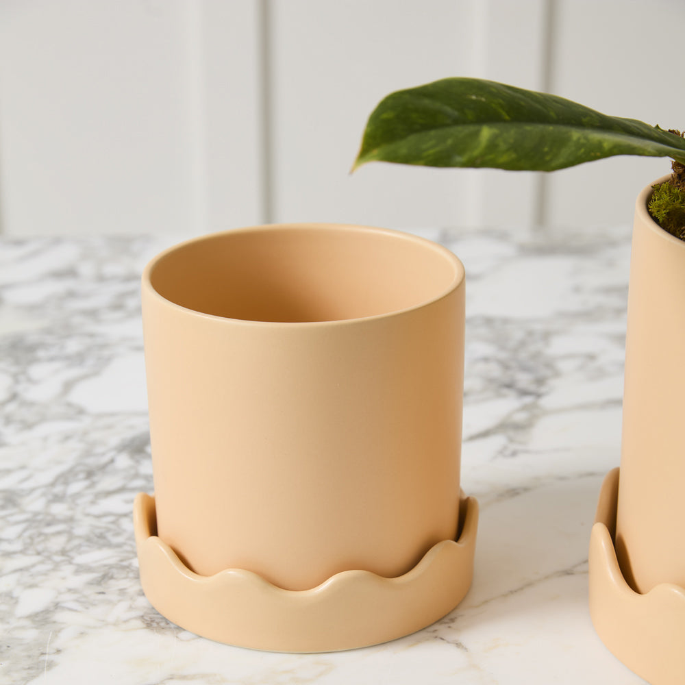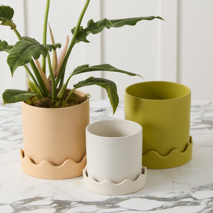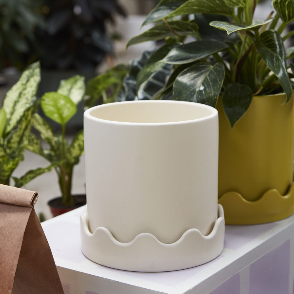 Meet the Pissaro Pot, featuring a classic design up top & squiggle party on the bottom. This smooth matte citron green ceramic pot features a drainage hole with a wavy-rimmed saucer for a tonal decorative detail & a playful take on the standard pot & saucer combo.