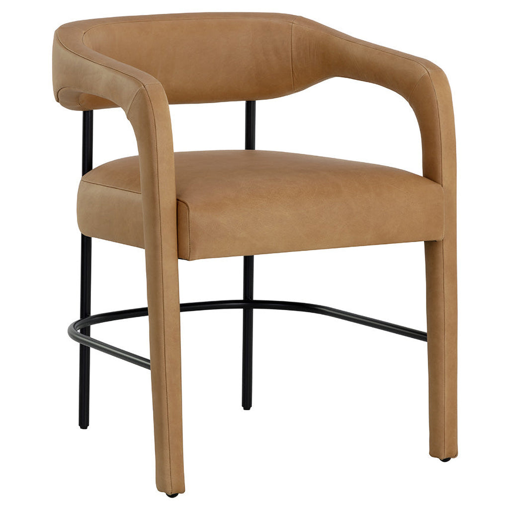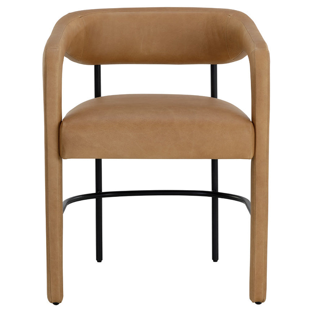 Perfectly poised, the Mavia Dining Armchair brings a cool modern edge to any dining area. Our stunning ludlow sesame leather is wrapped around the seat, armrests and front legs while the rest of the black powder-coated frame remains exposed. Handle with Care: This design has been crafted with 100% leather. Leather is a natural material; as such, color variations, markings, wrinkles, grooves and light scratches are acceptable and appreciated characteristics. No two pieces are alike.