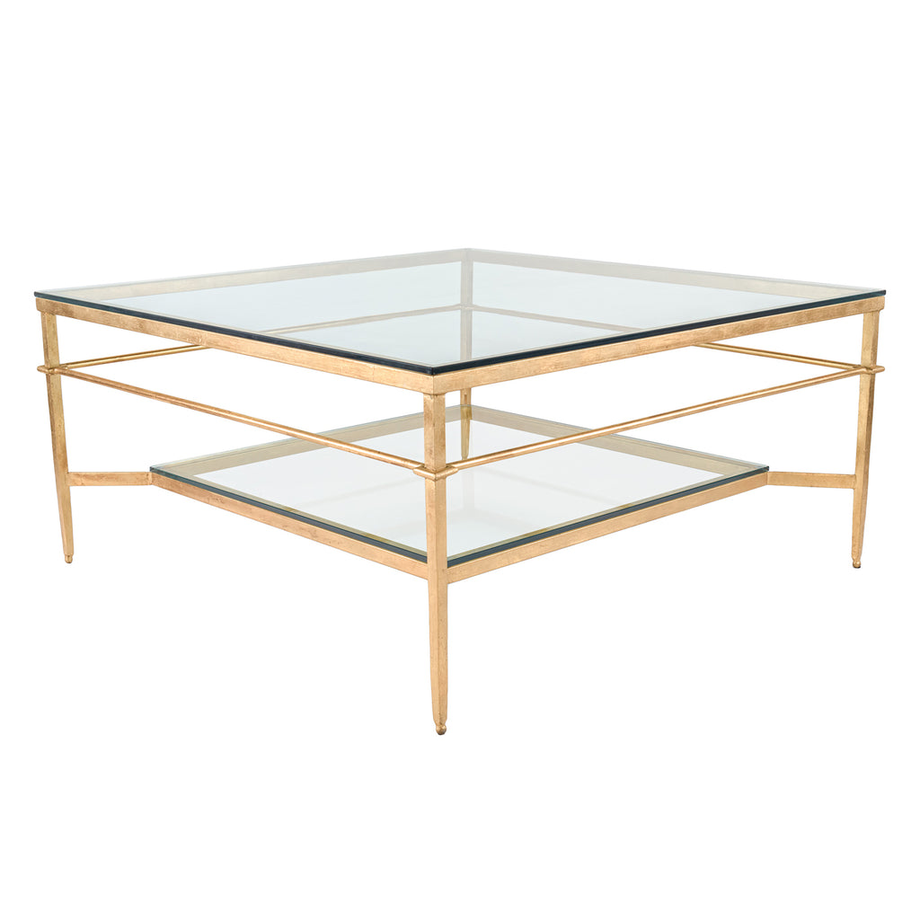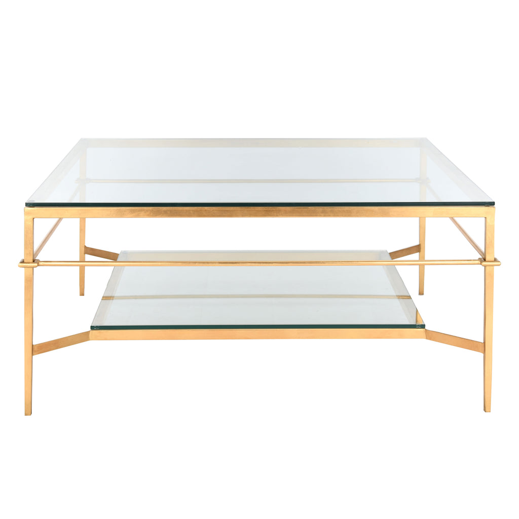 The luxurious Annes gold leaf cocktail table is designed for elegant entertaining in transitional living rooms. Its see-through glass shelves give it the appearance of sculpture, while providing a practical, easy care surface for drinks and canapés.