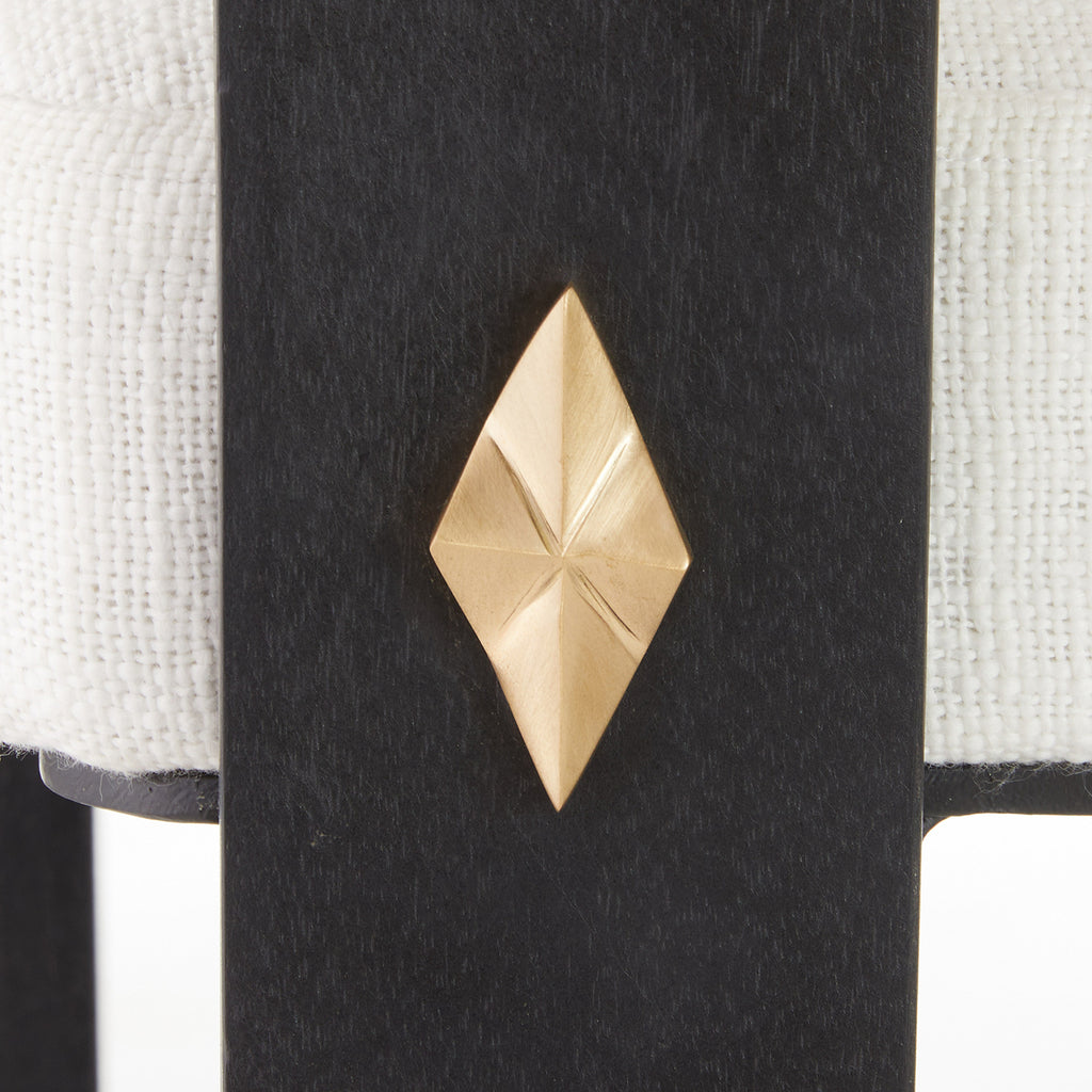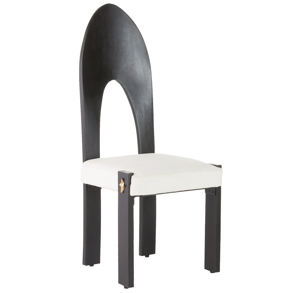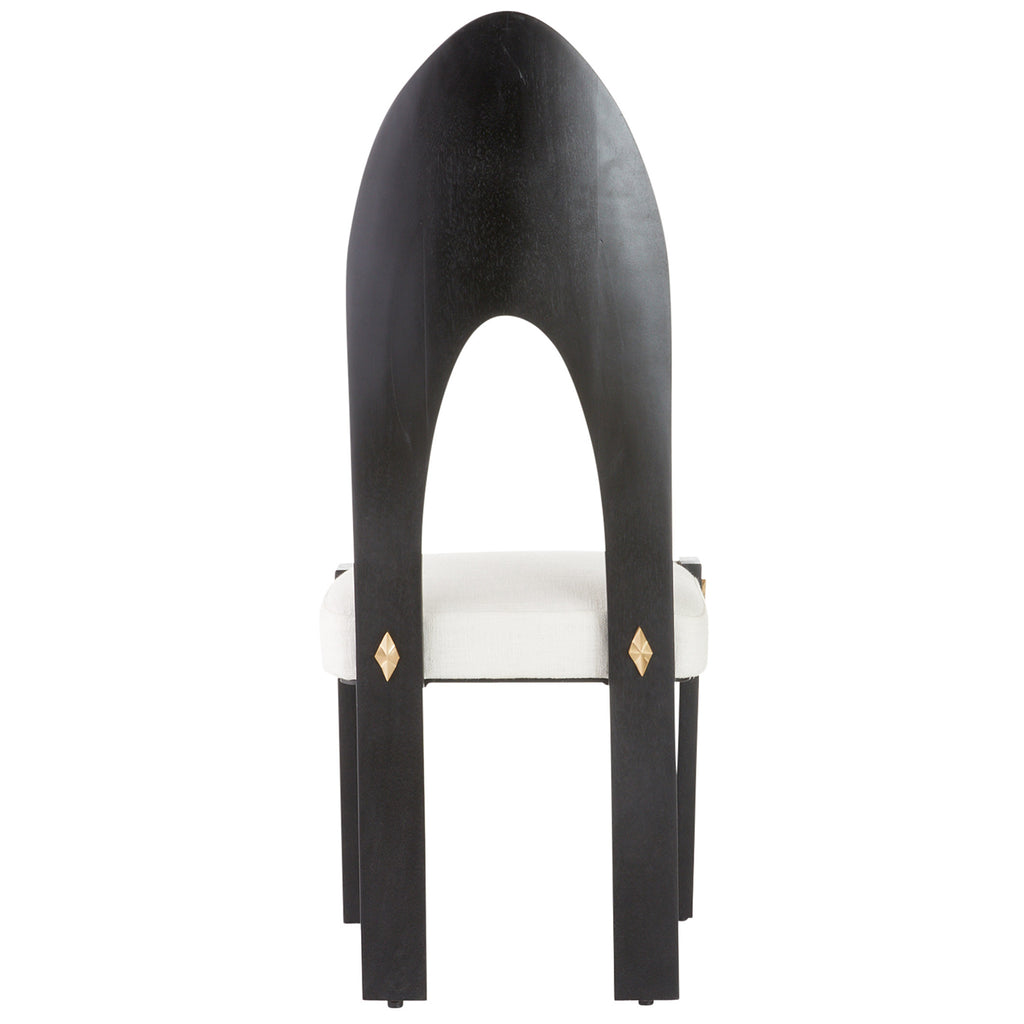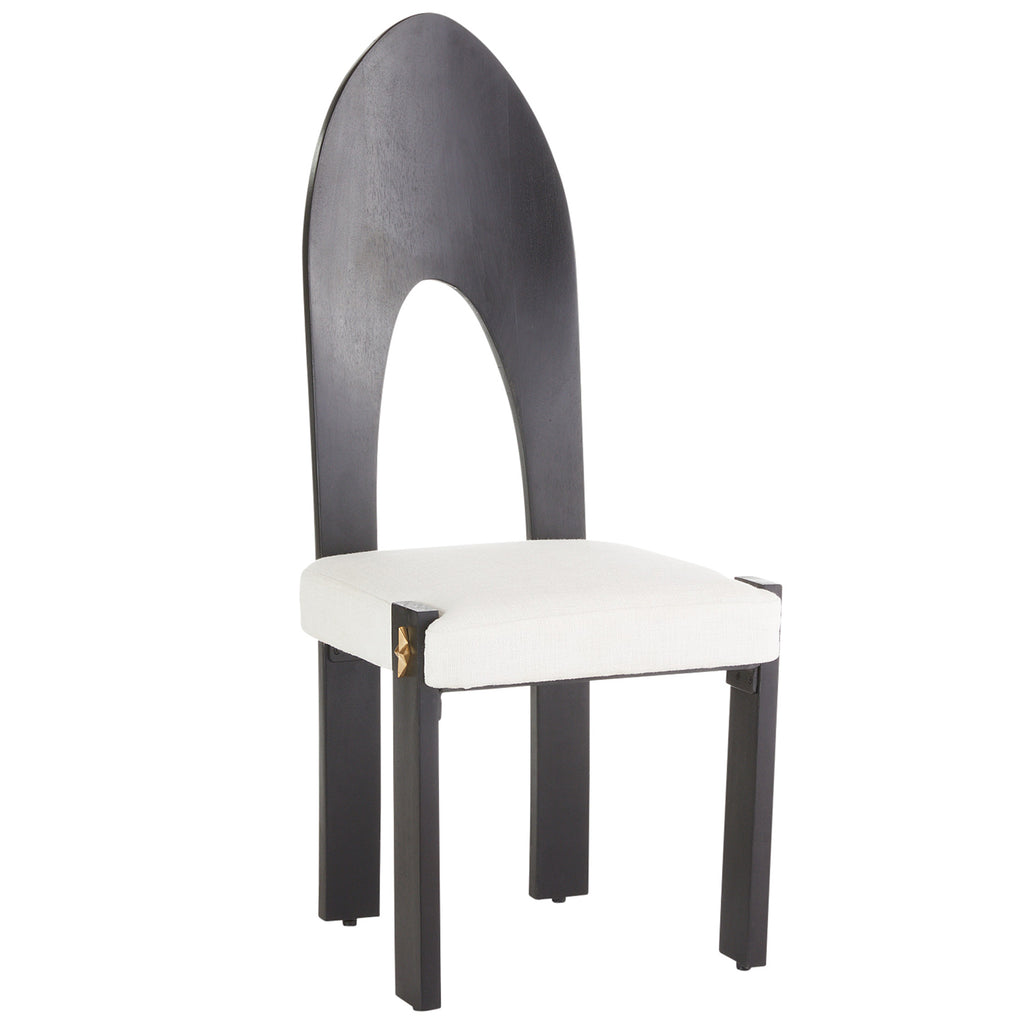 Inspired by tribal art, the confident aztec arch back of the Arteriors Durango adds a touch of drama to the dining room. Accented with abstract brass diamond detailing on each front leg, this mango wood essential is stained in a deep ebony hue. Finished with textural chantilly texture seating that is padded for comfort. Finish will vary.