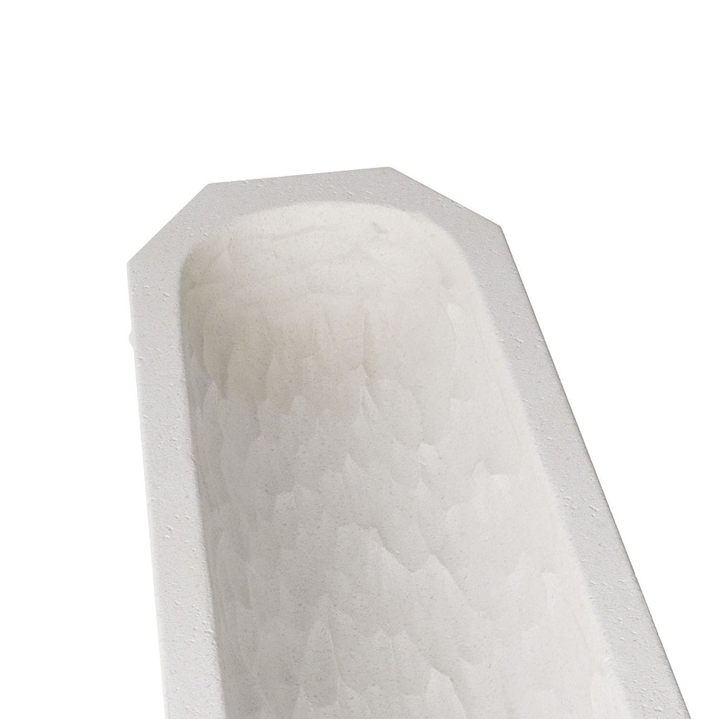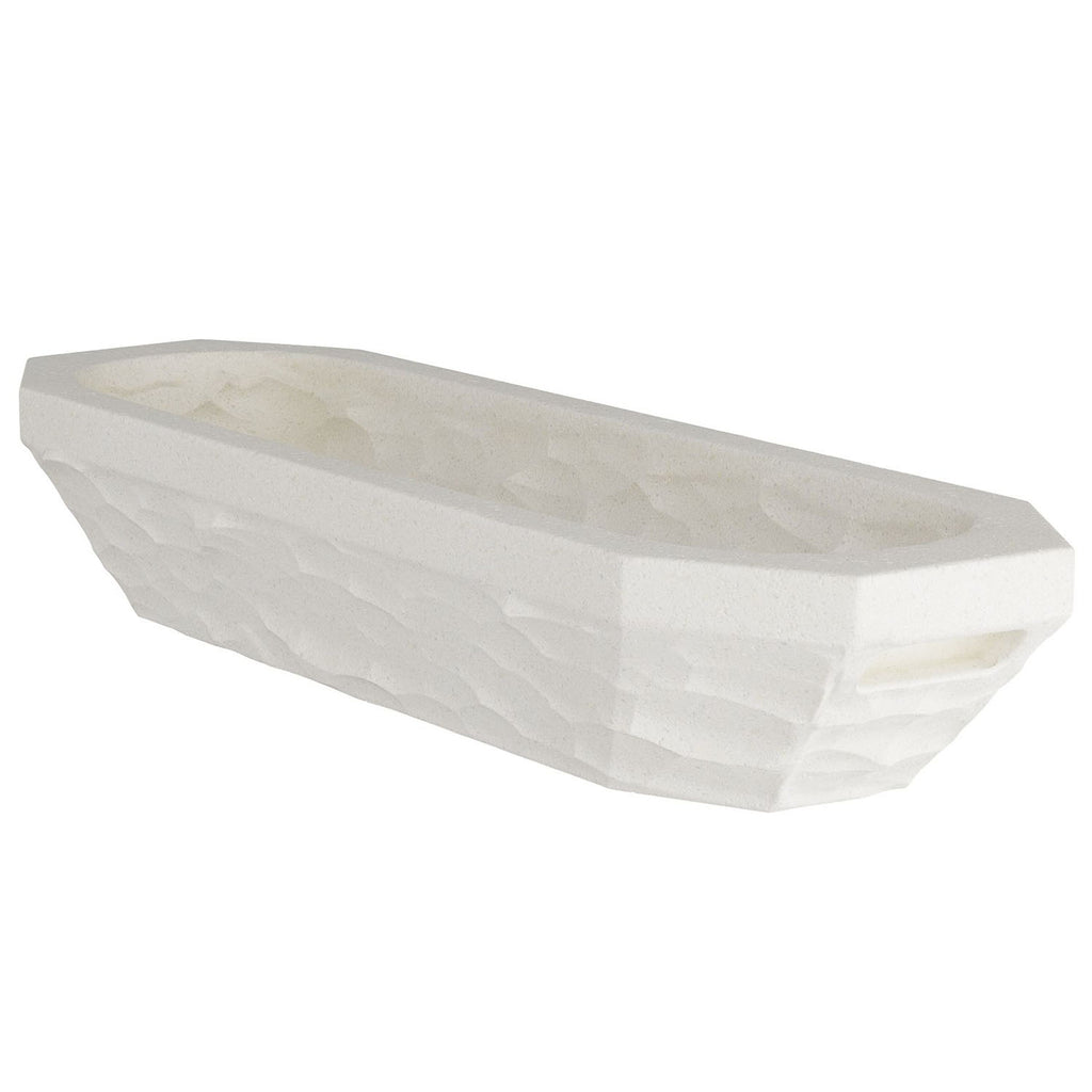 A shallow vessel of ivory ricestone composite is an impactful accent for any tabletop. Carved with a pleasing texture, its simplistic silhouette is reminiscent of a classic wooden bread bowl. Finish will vary.