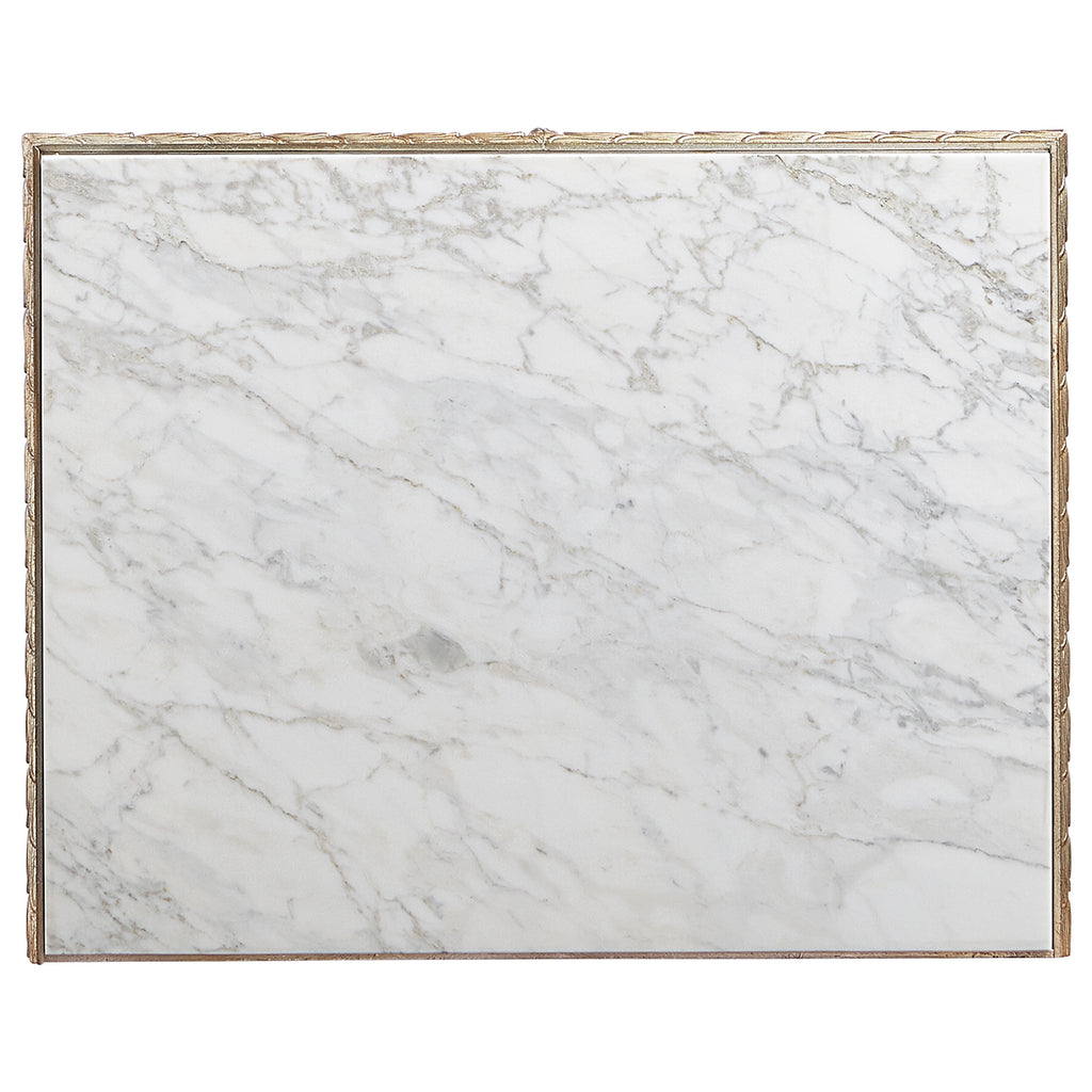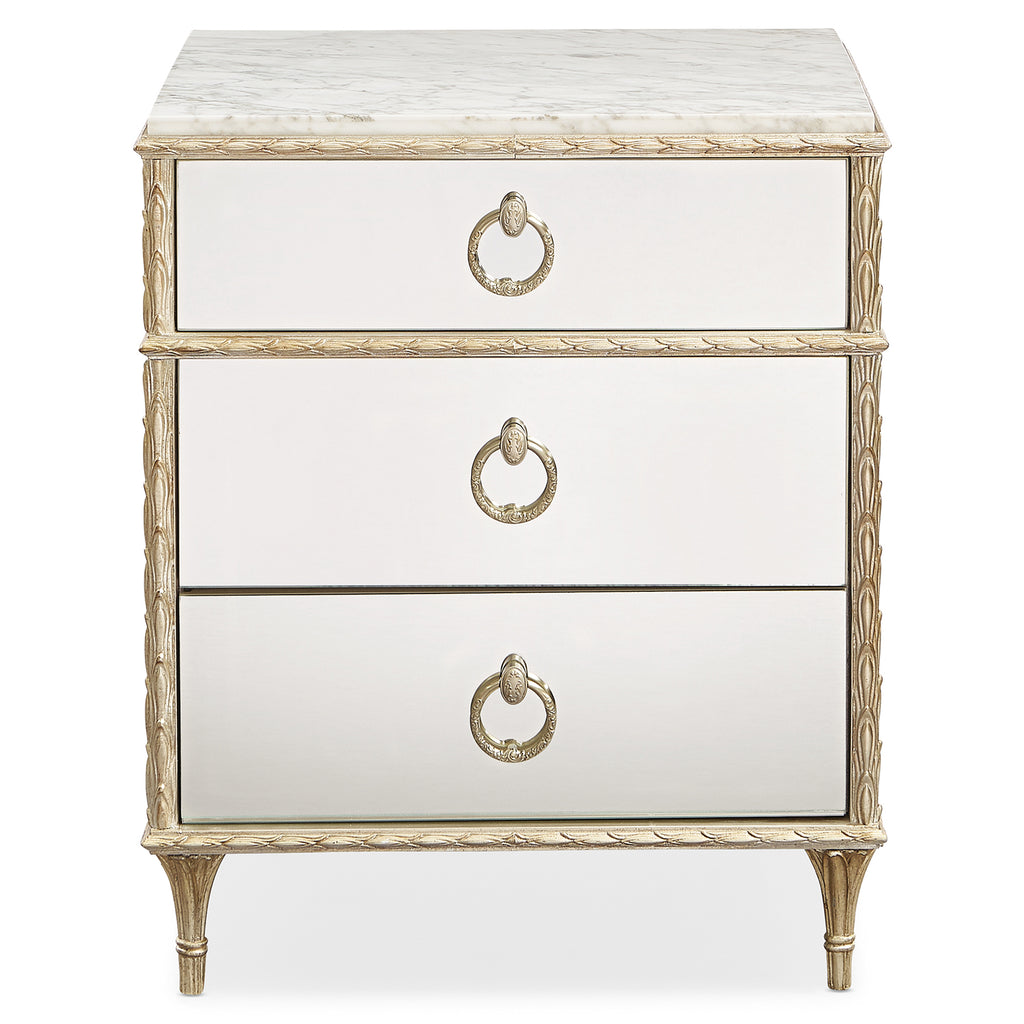 An elegant reflection of all things Baroque, this extraordinary three-drawer nightstand will add light and glamour to any bedroom. Exquisitely crafted with a mirrored front and sides, it features laurel leaf carvings inspired by an antique Baroque picture frame and finished in Aglow. You needn’t worry about bringing a beverage or snack to bed, this beautiful nightstand features a ¾-inch Carrara white marble top that adds durable functionality to its timeless appeal. Look closely and you’ll see custom-designed ring pulls adorned with vintage cameo buttons reflected in its drawer fronts.