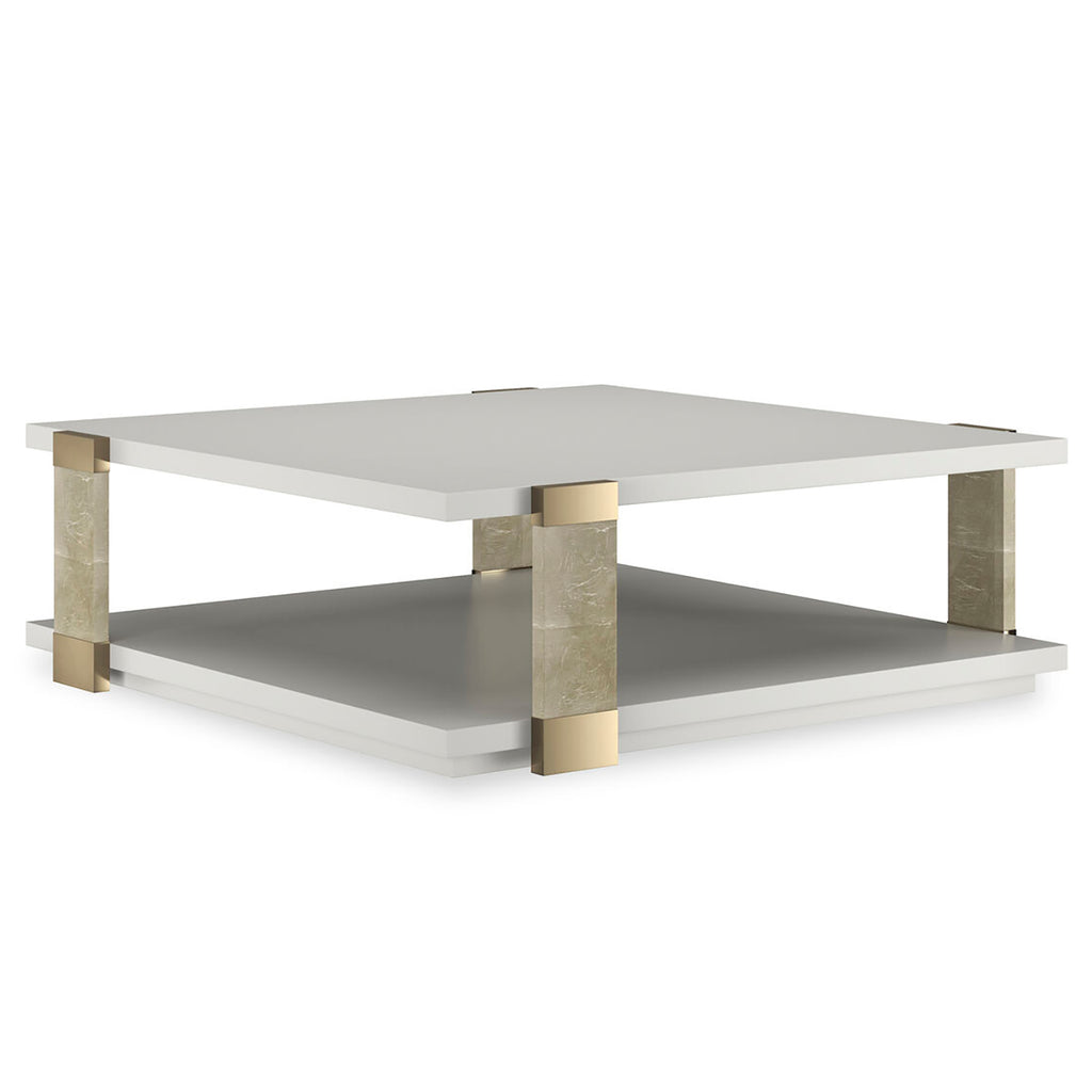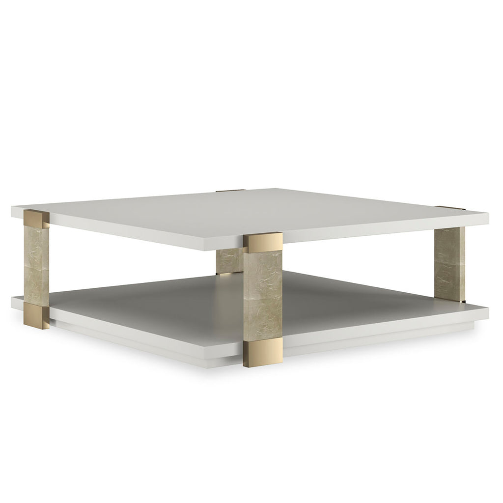 This square coffee table presents a beautiful balance of linear forms and light. Its Almond Milk tabletop and shelf appear to float within Oracle hand-applied leaf wood posts. Whisper of Gold metal accents trim the top and bottom of each post, adding a dressed up touch to this piece.