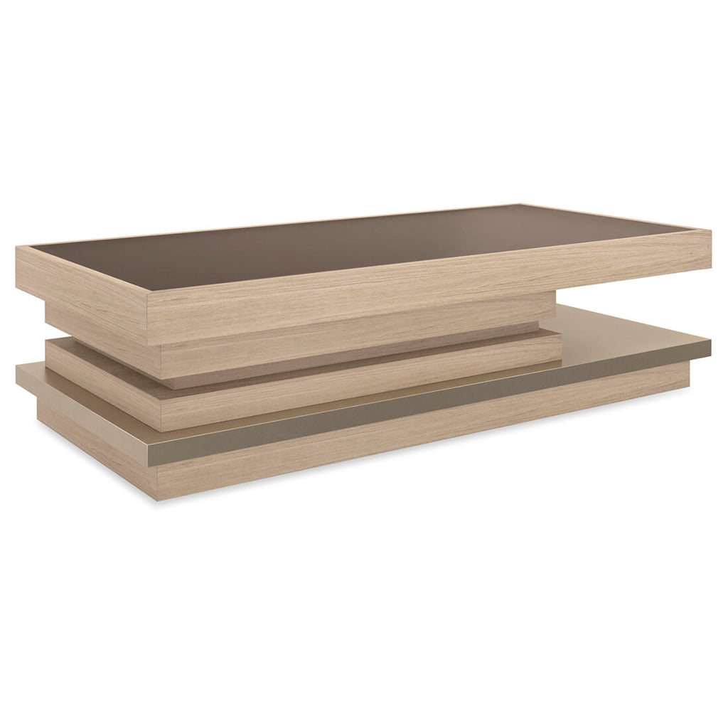 A smaller version of our La Moda Cocktail Table, this piece is distinguished by the architectural offset stacking of mixed materials. The top frame showcases Koto wood finished in Dry Martini and inset with Smoked Bronze mirrored glass. The table tiers are Koto in Dry Martini with a Neutral Metallic finish. The plinth base is finished in Neutral Metallic paint. Features hidden casters for ease of movement.