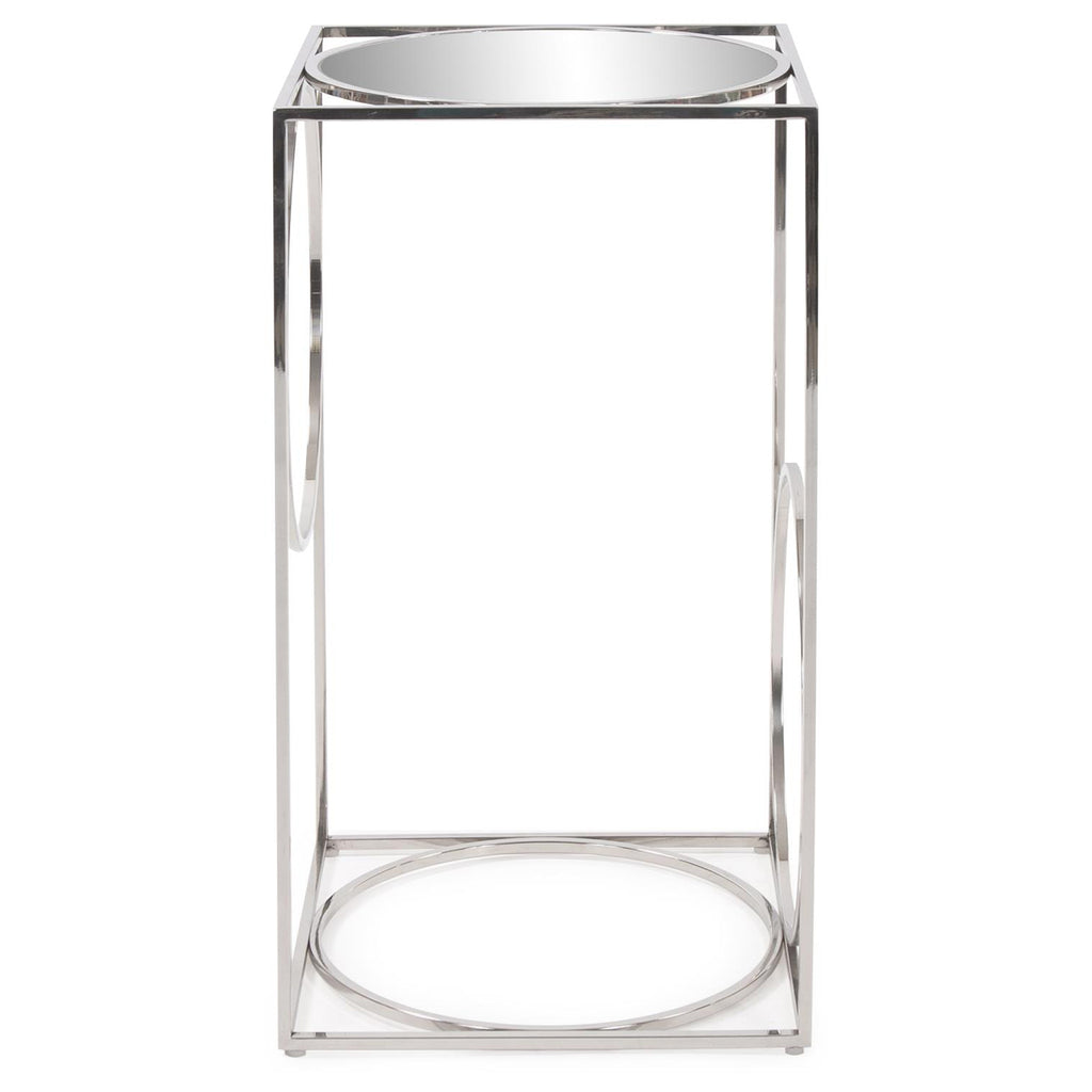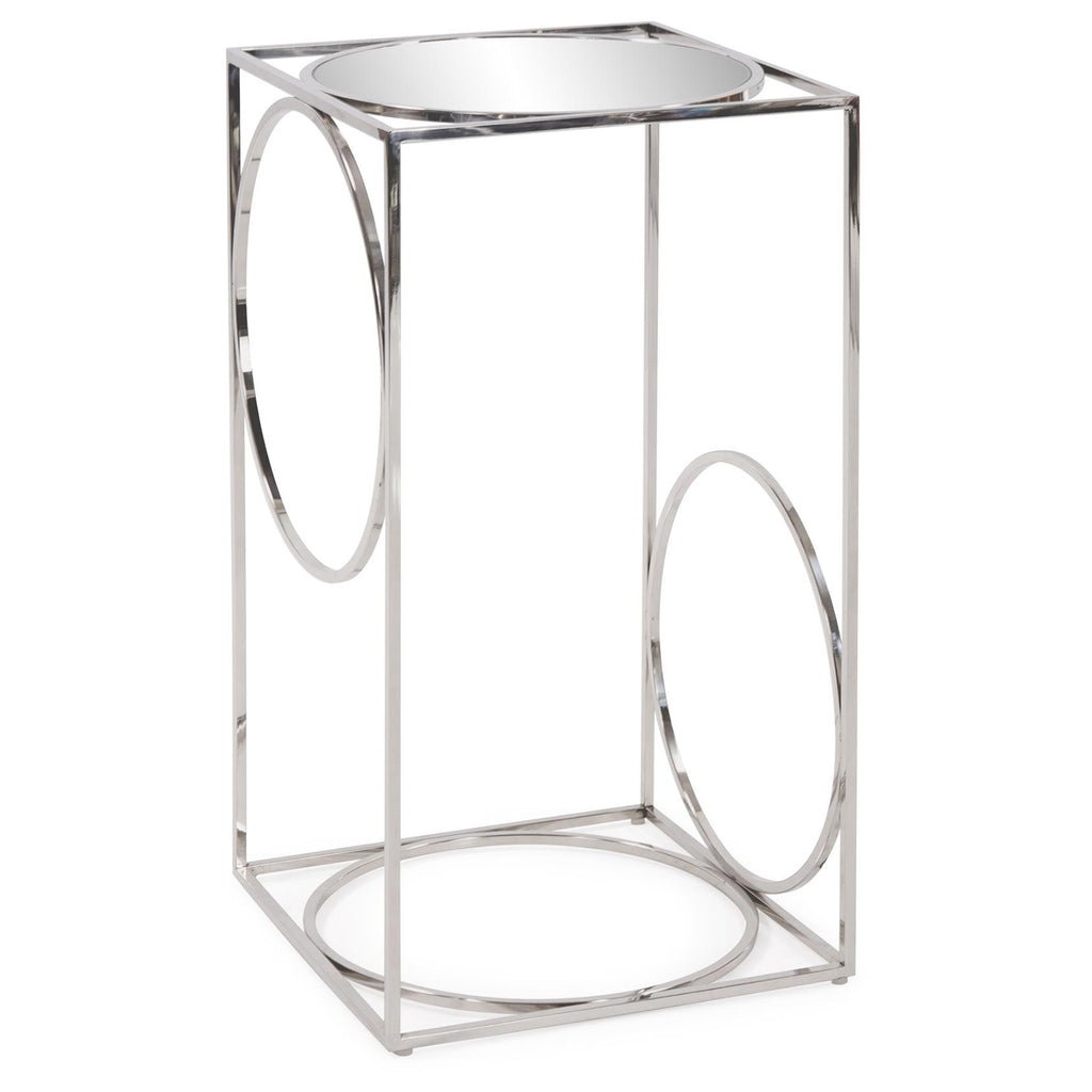 A fun play on geometry, the Circa Pedestal Table is a sleek addition to any room. Vertical lines of polished stainless steel hold circles of the same to create the base that holds a round mirrored top.