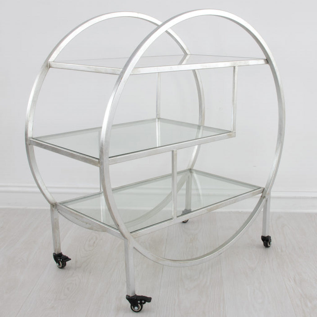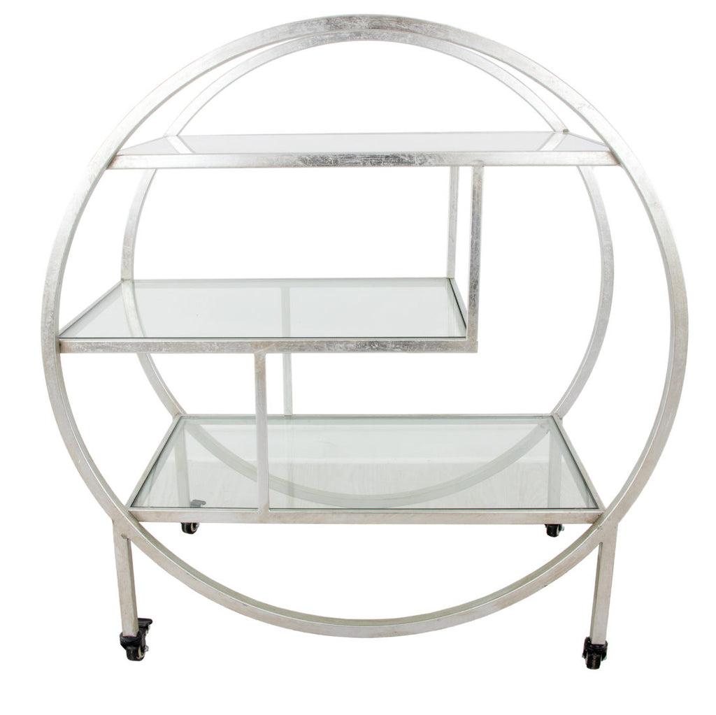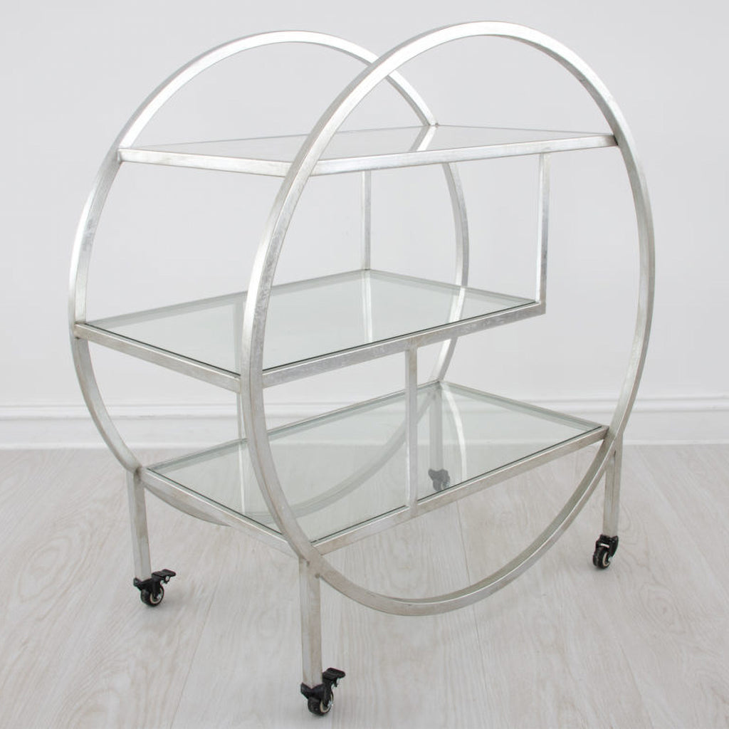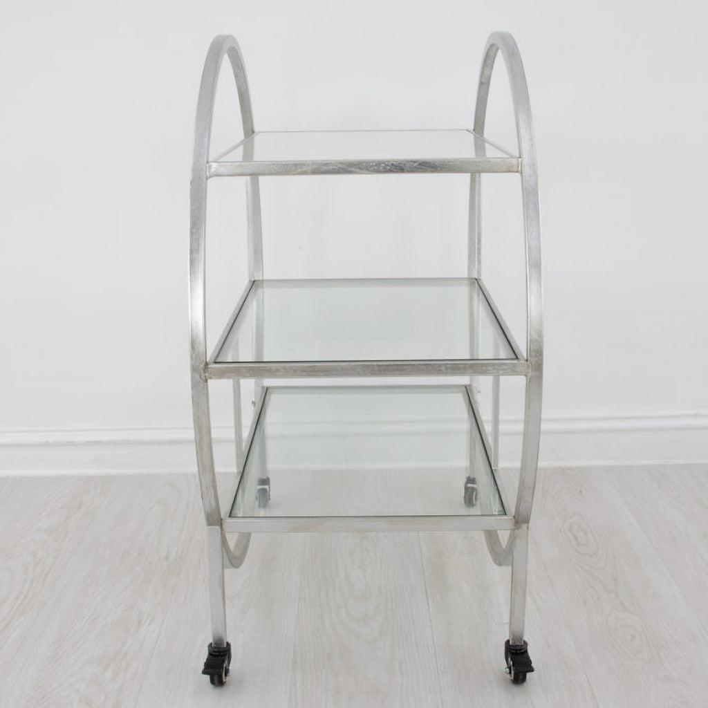 This serving cart stands at the extreme of sophistication and with its fashionable platforms, meals and drinks can better be served. Its antiqued silver leaf frame highlight beautifully the whole design to give it an inspiring profile. This masterpiece features four elegant caster wheels and grips for easy mobility. The serving cart comes with a stone top shelf and tempered glass bottom shelf that provide ample space for trays, plates and other serving details.