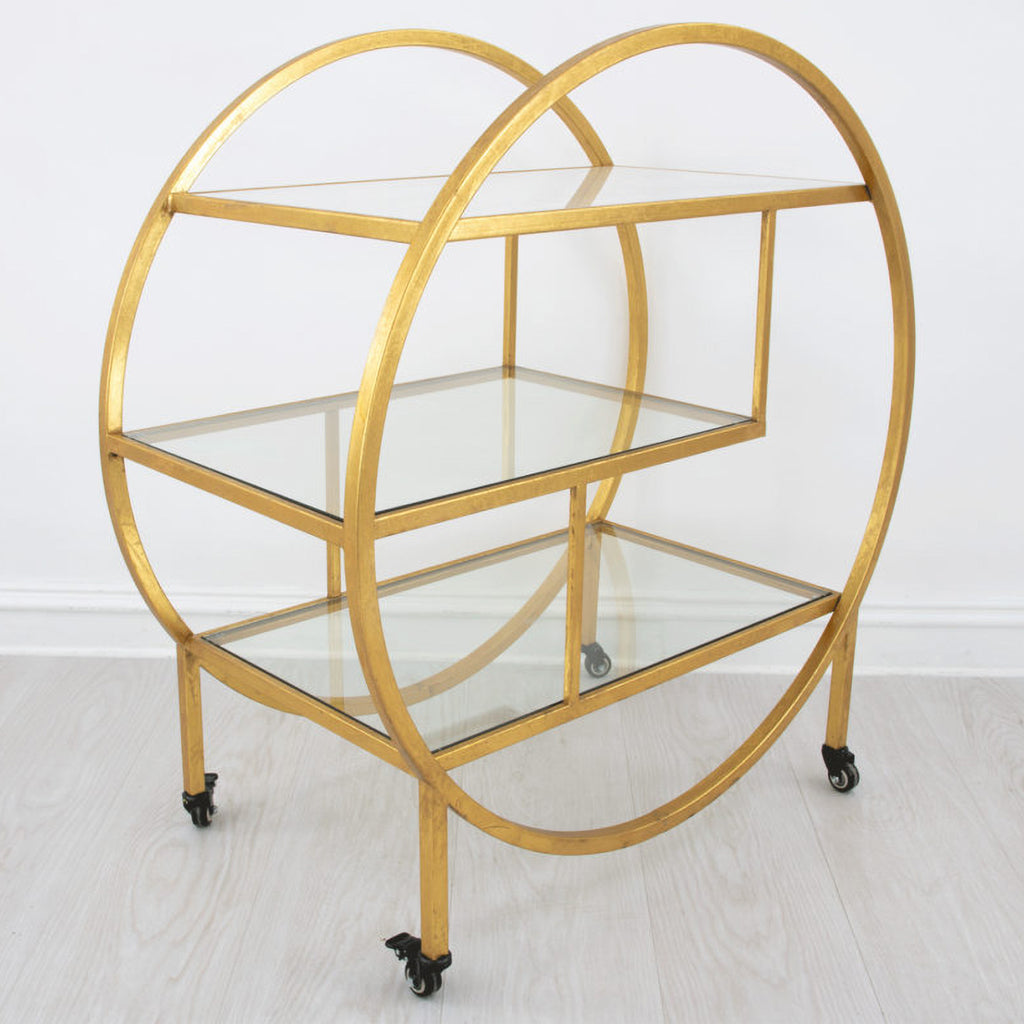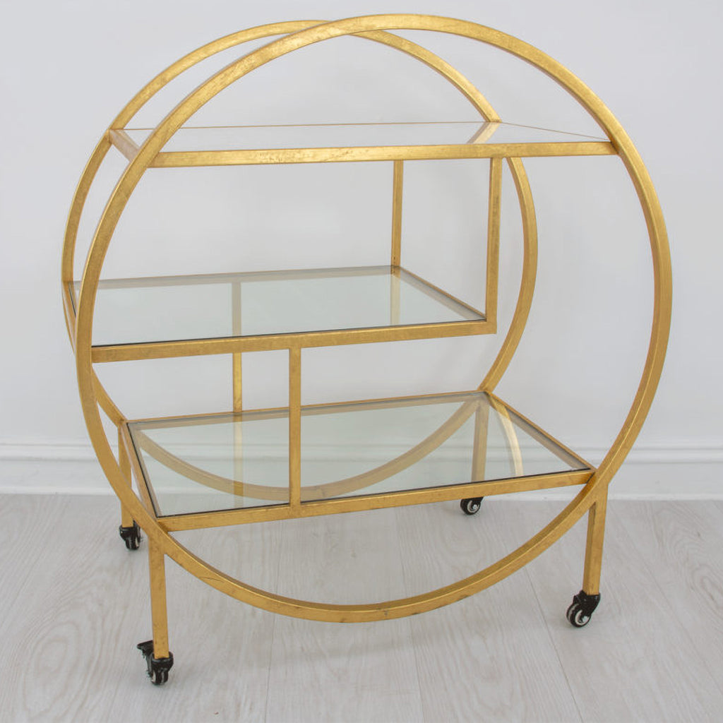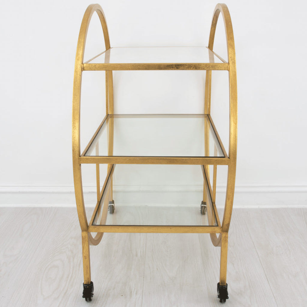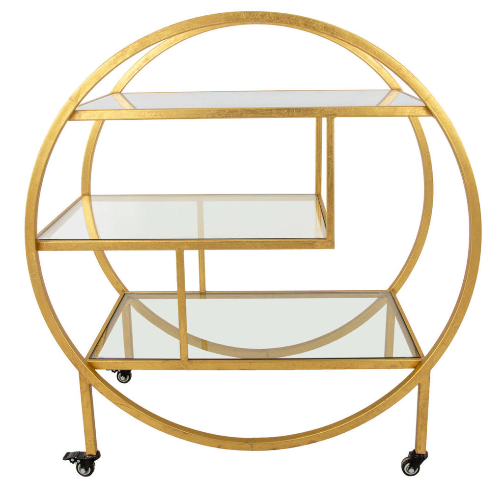 This serving cart stands at the extreme of sophistication and with its fashionable platforms, meals and drinks can better be served. Its antiqued silver leaf frame highlight beautifully the whole design to give it an inspiring profile. This masterpiece features four elegant caster wheels and grips for easy mobility. The serving cart comes with a stone top shelf and tempered glass bottom shelf that provide ample space for trays, plates and other serving details.