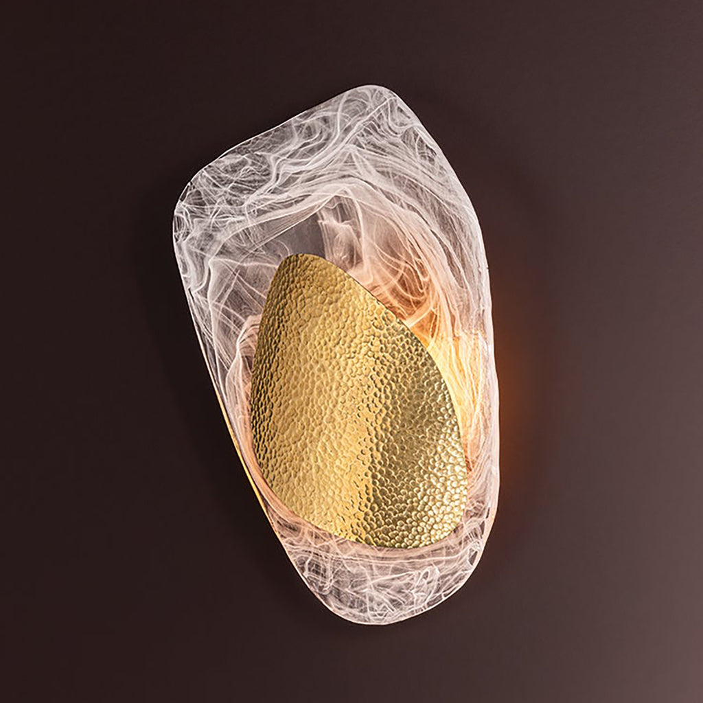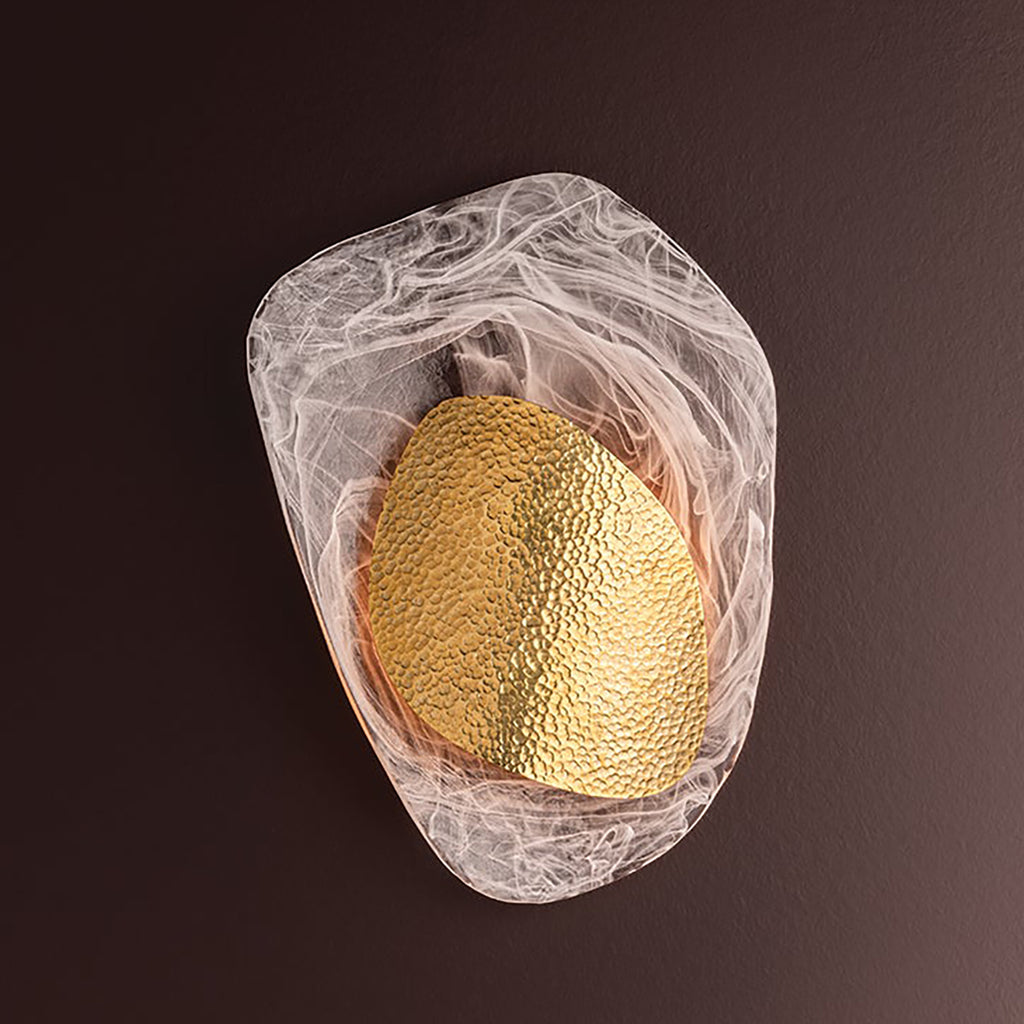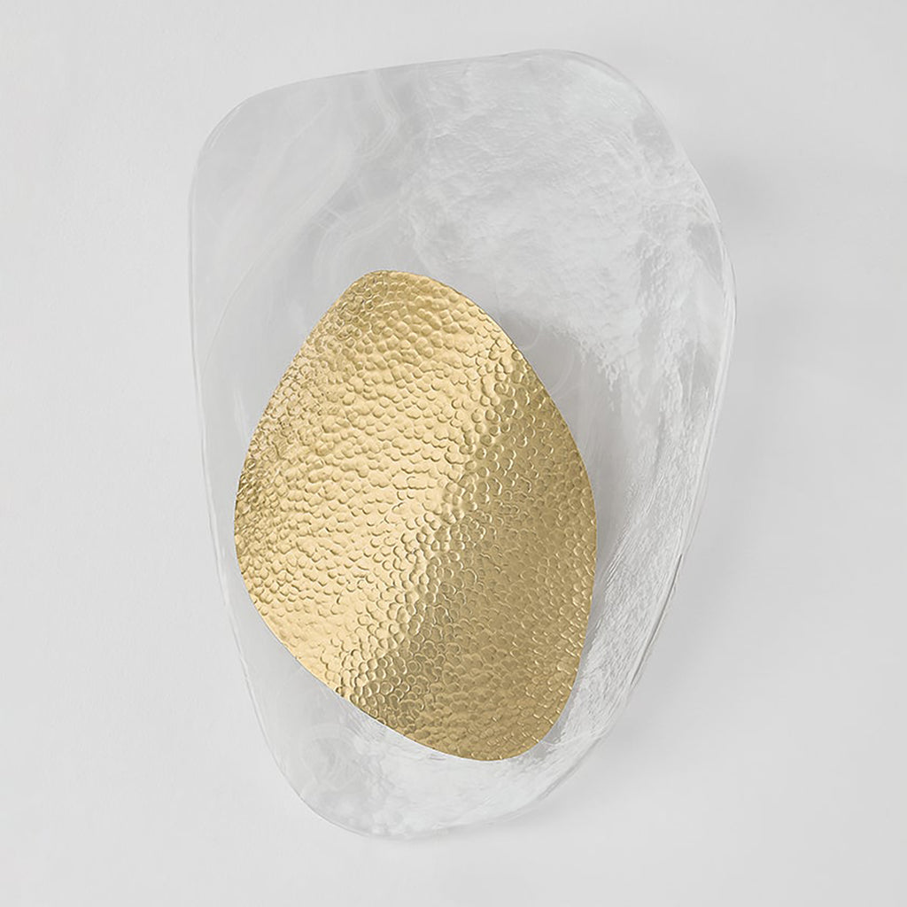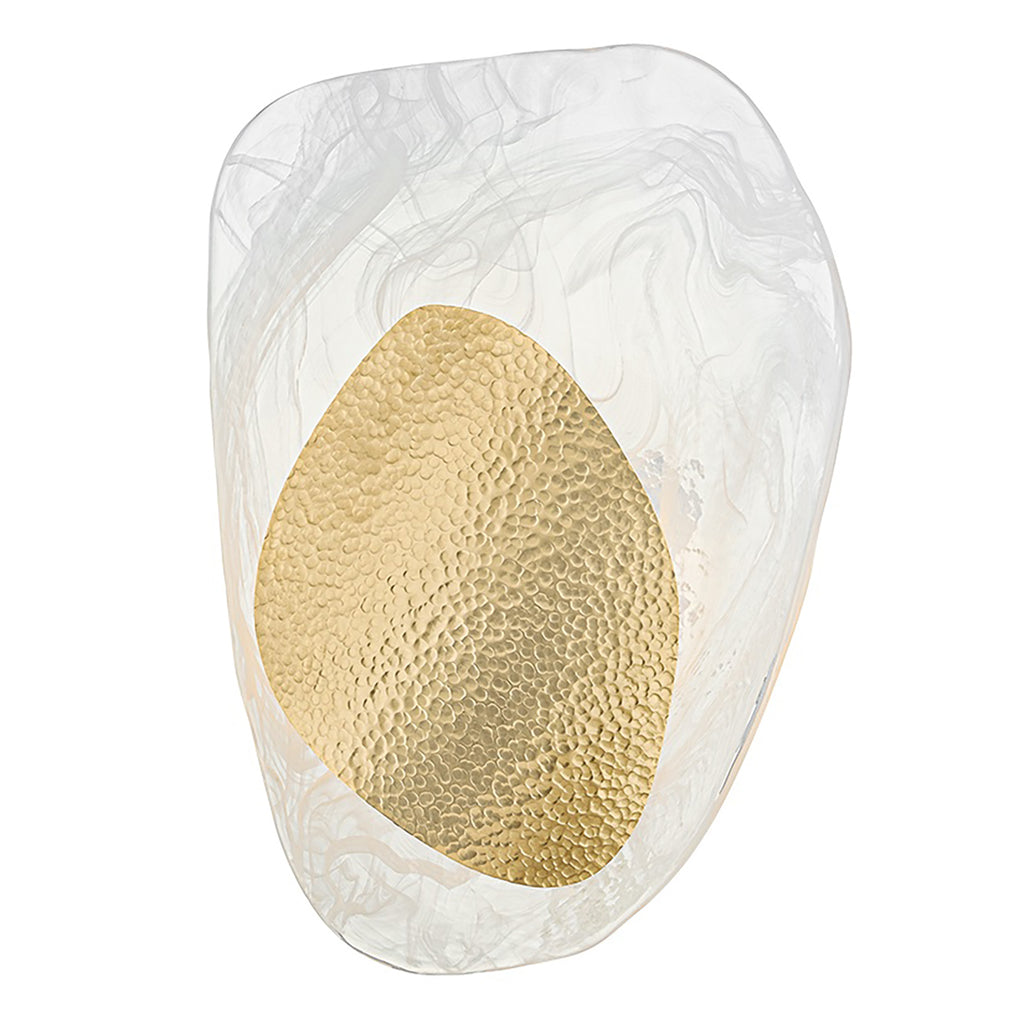 Dynamic design lines and layered materials combine in the eye-catching composition of Corbett Lighting Bilbao. This artful sconce pairs delicate cast Piastra glass with a hammered Vintage Brass abstract form, creating a luxurious contrast. As it gently curves away from the wall, Bilbao breathes life into a space with its vaguely botanical beauty.