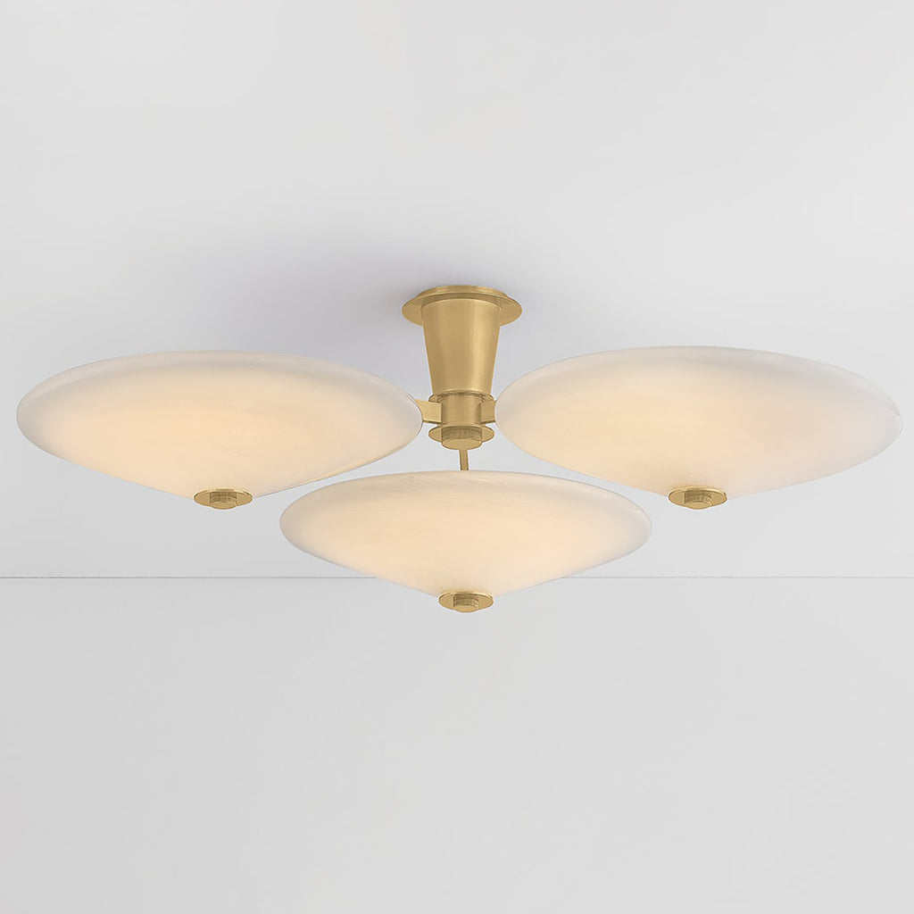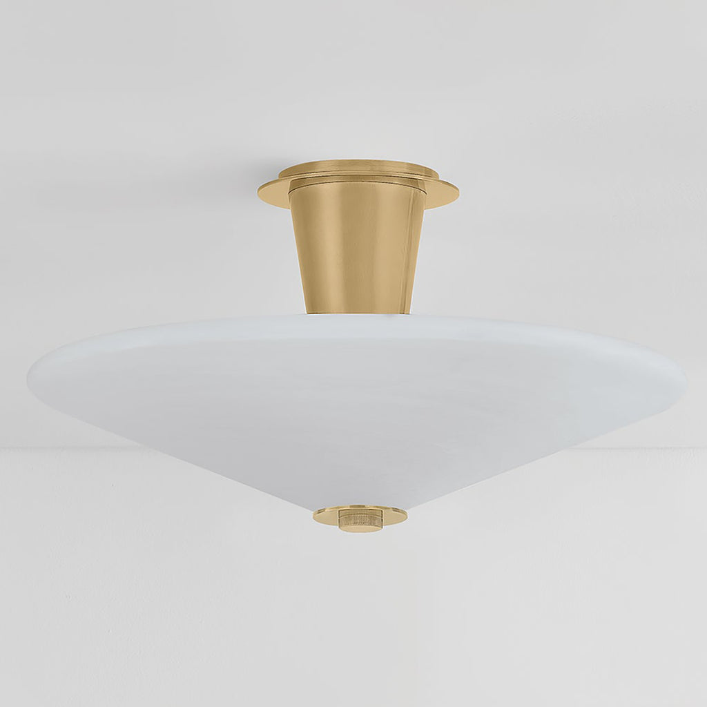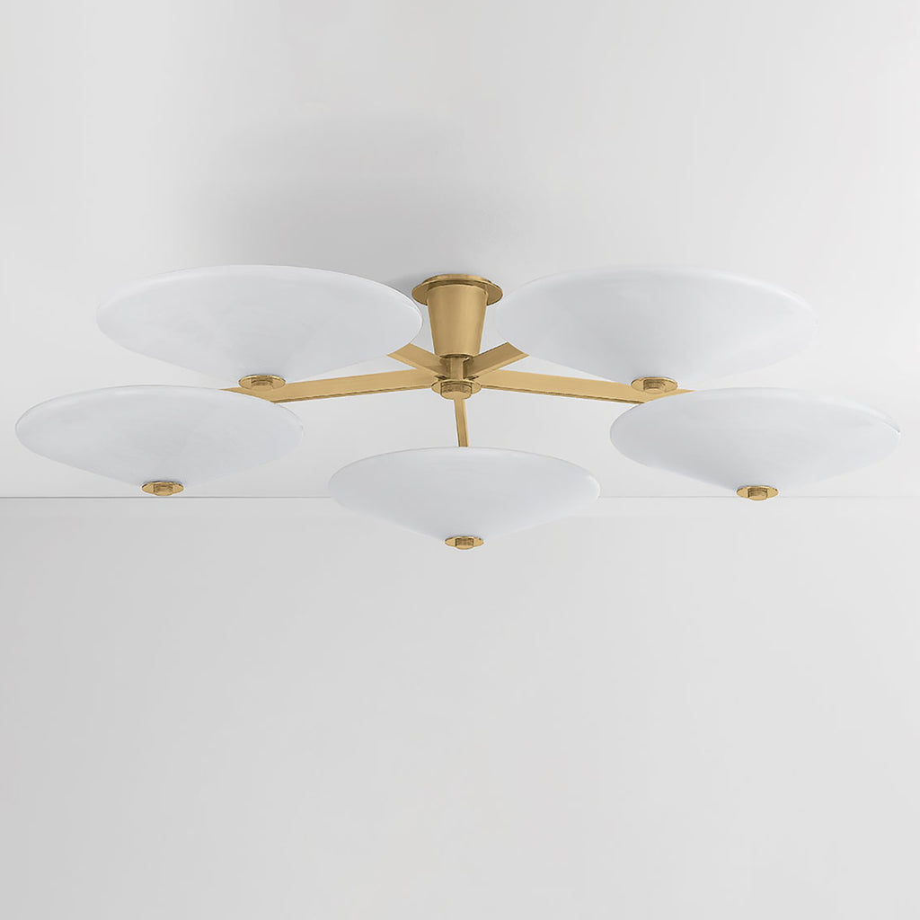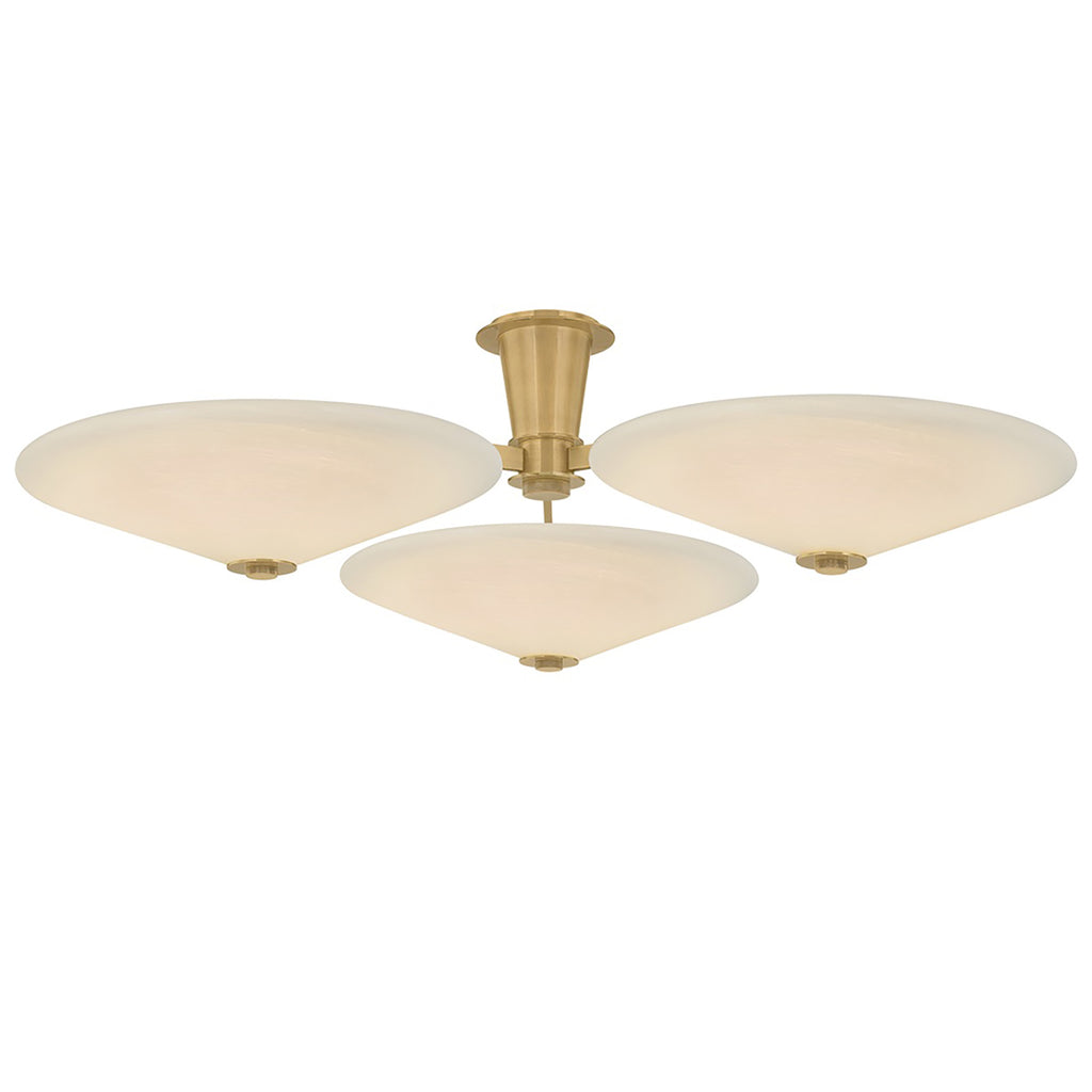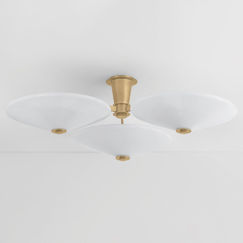 Modern and sophisticated, the Corbett Lighting Cologne semi-flush mount features sleek metalwork and wide tapered cloud glass shades. Finished in Vintage Brass, the frame complements and supports the disc-like shape of the shades without detracting from them. Available with 1, 3, or 5 lights, Cologne makes an architectural statement on the ceiling.