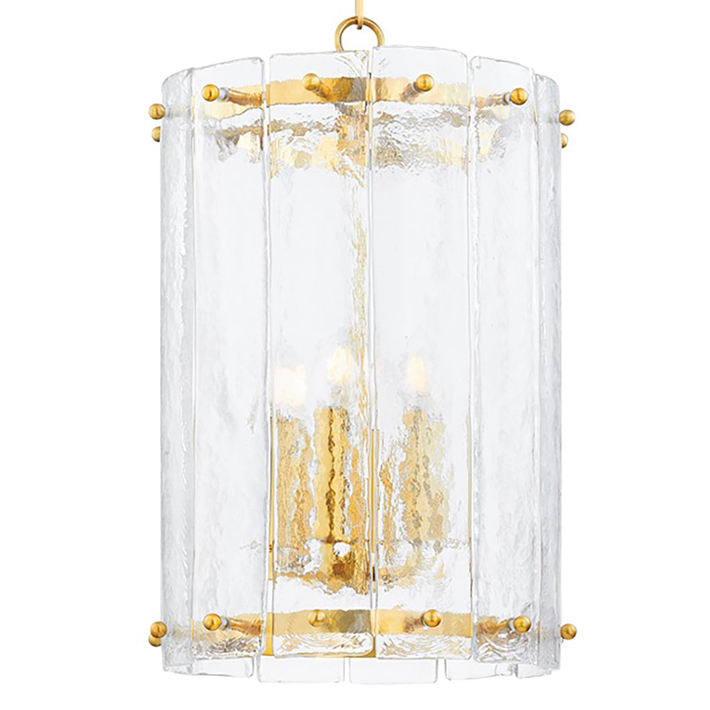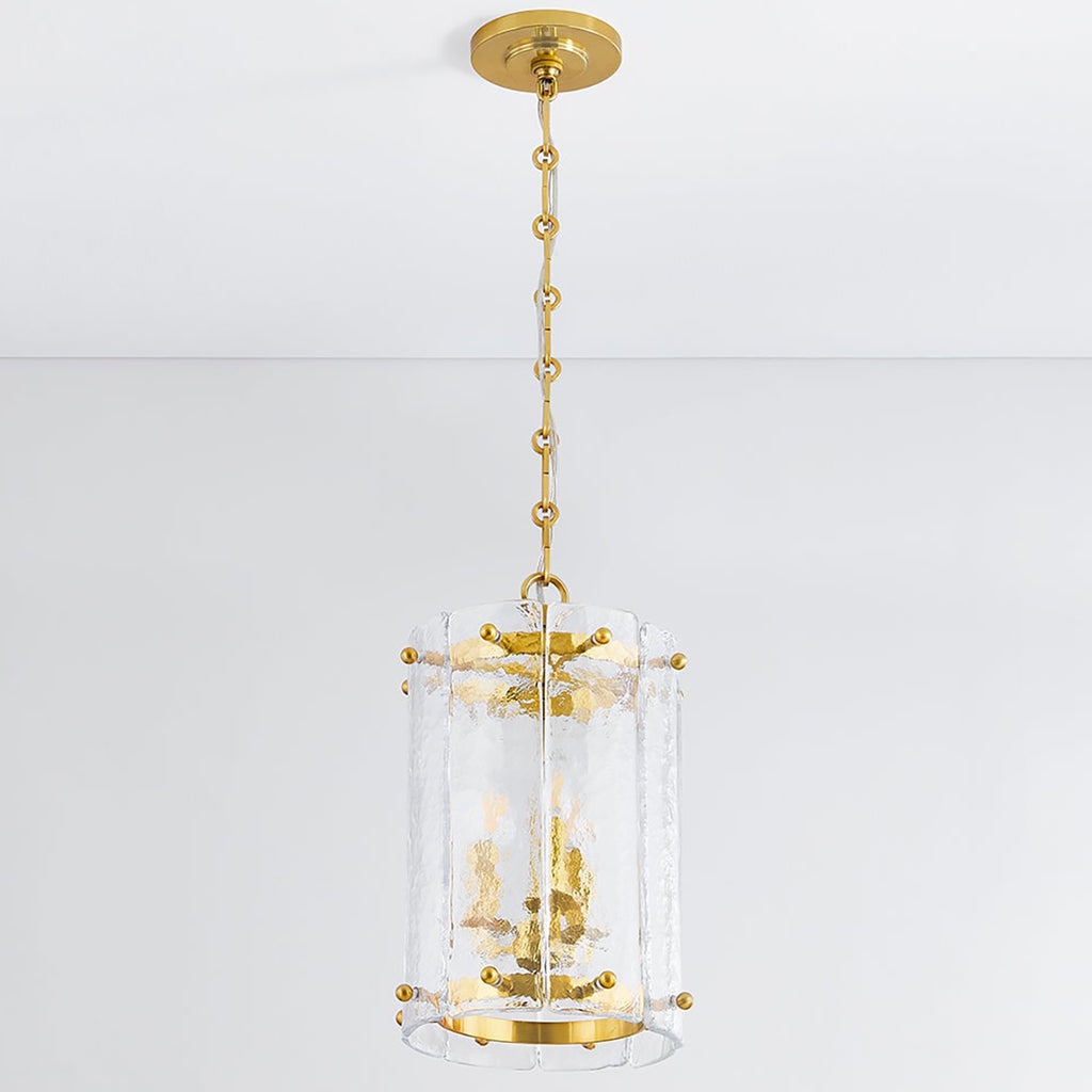 With hand-blown Piastra glass, this statement pendant reimagines a traditional lantern as an aquatic vision. Resembling water, the rippled glass silhouette diffuses and reflects the light coming from within. Vintage Brass pins and chains suspend the fixture, bringing a sense of the old world to the contemporary materiality. Available in three sizes as a lantern or as a flush mount.