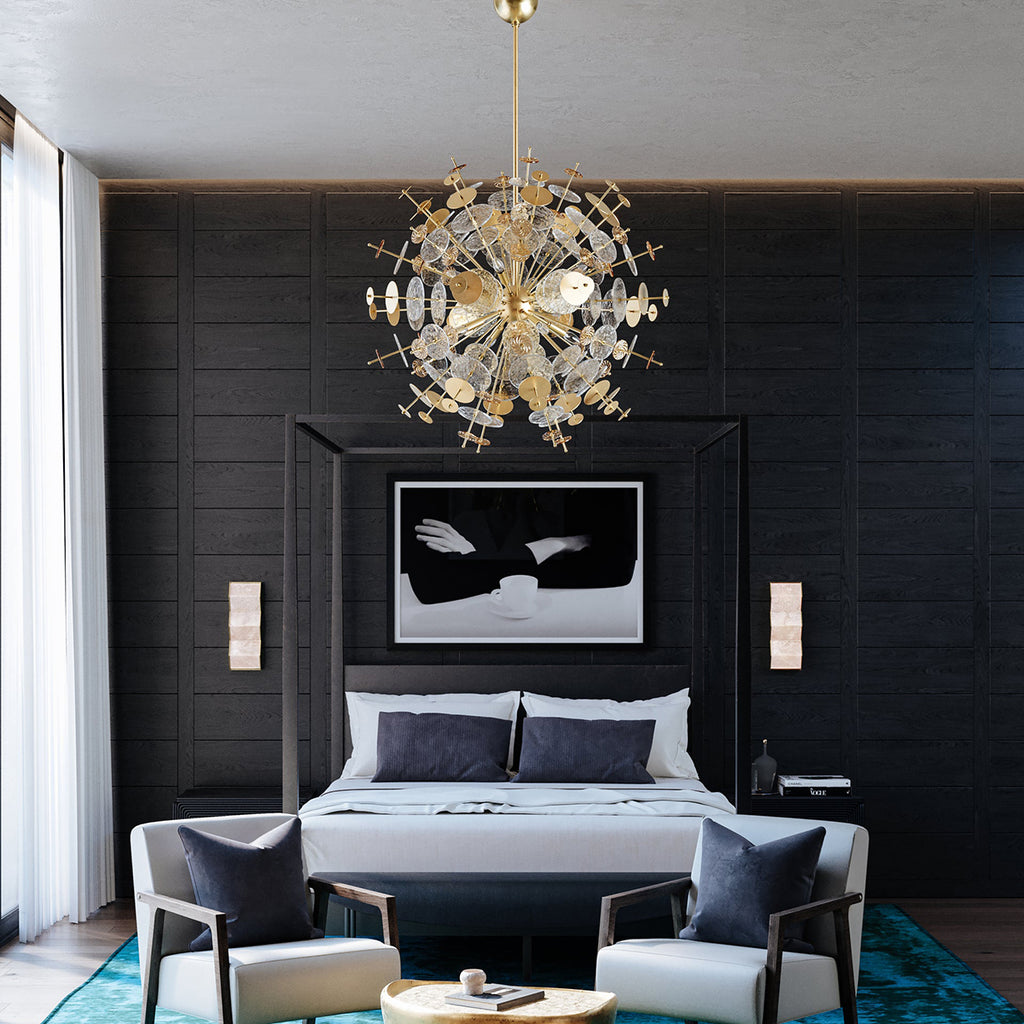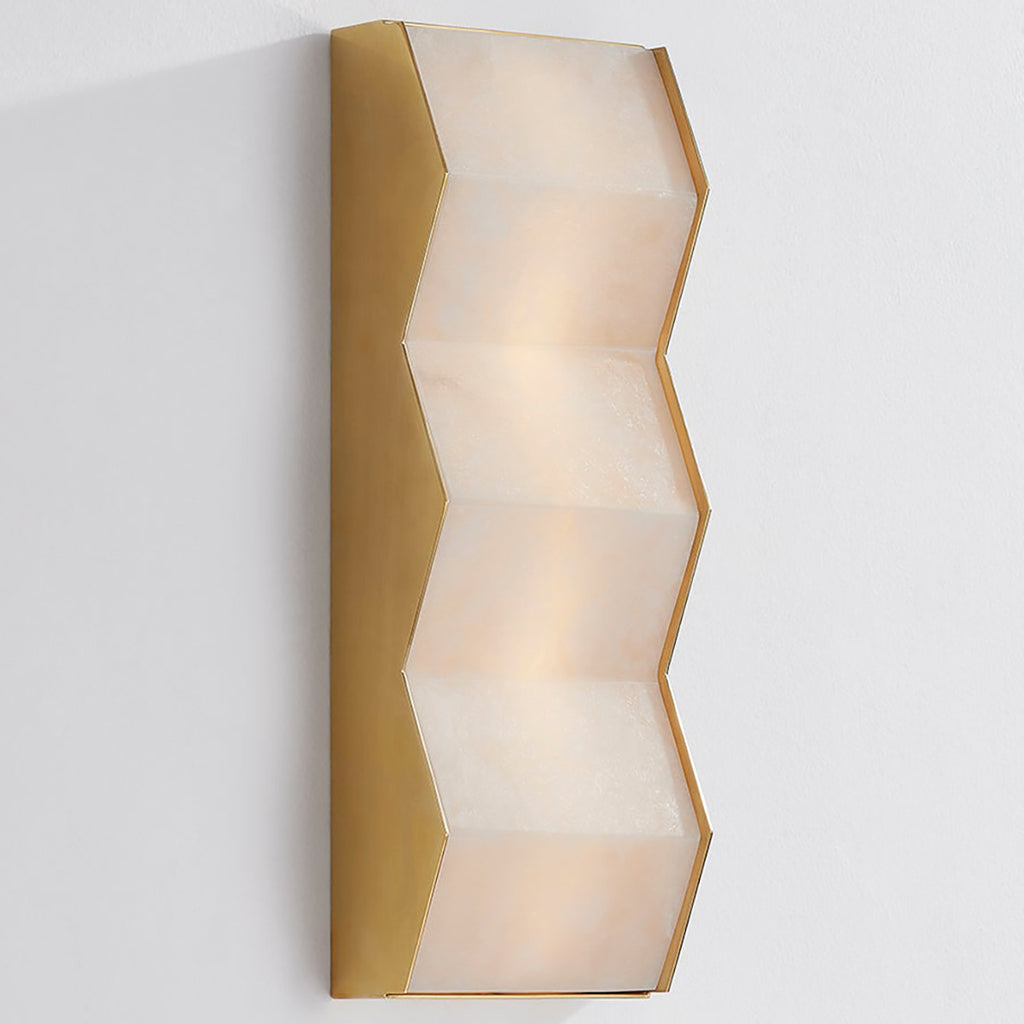 A distinctive geometric wall sculpture, Corbett Lighting Tanzanite features a folded motif of translucent alabaster. The Vintage Brass frame brings out the warm tonal variations found in the alabaster while adding a metallic contrast to the natural stone. Whether the sconce is illuminated or not, the juxtaposition of materiality makes a poetic statement.
