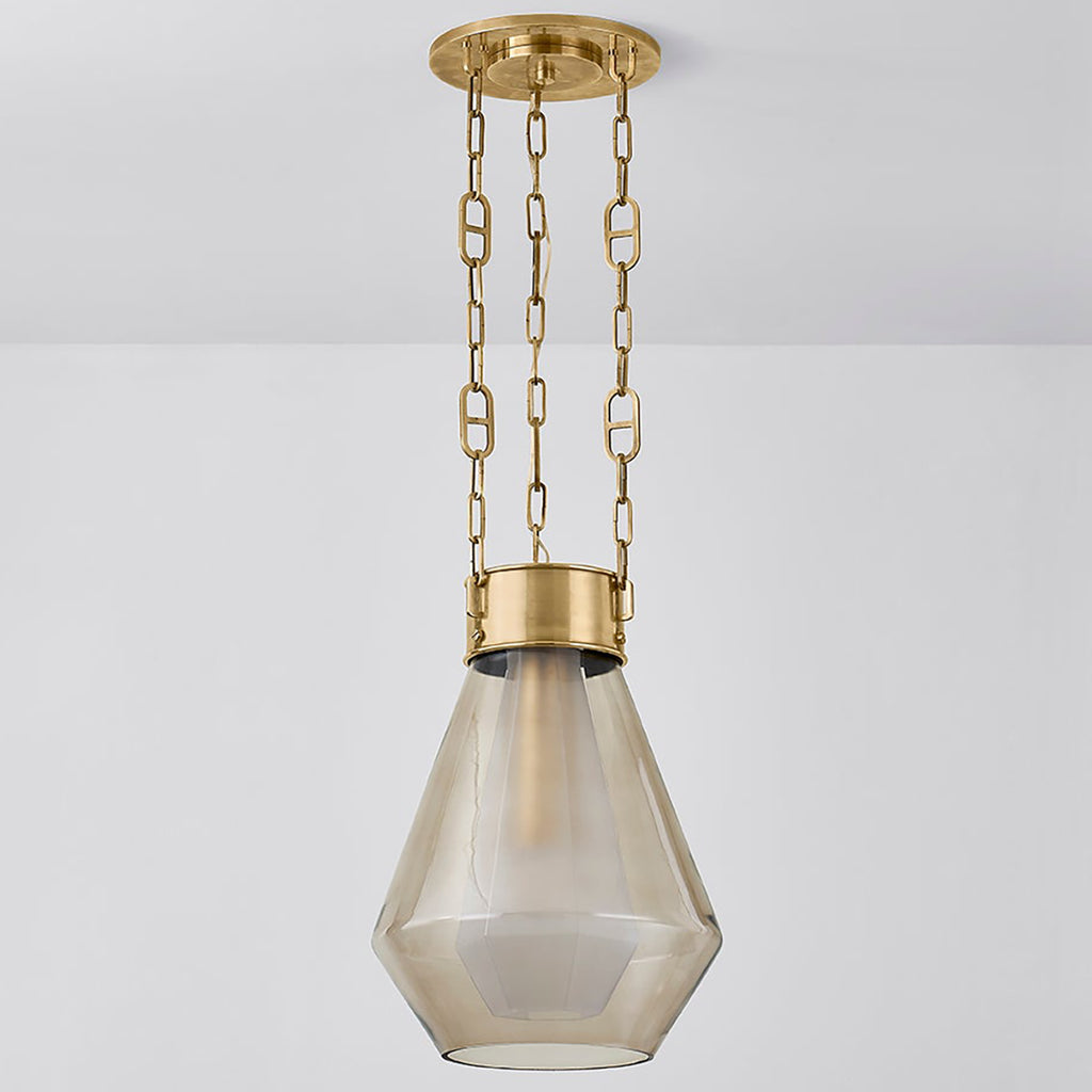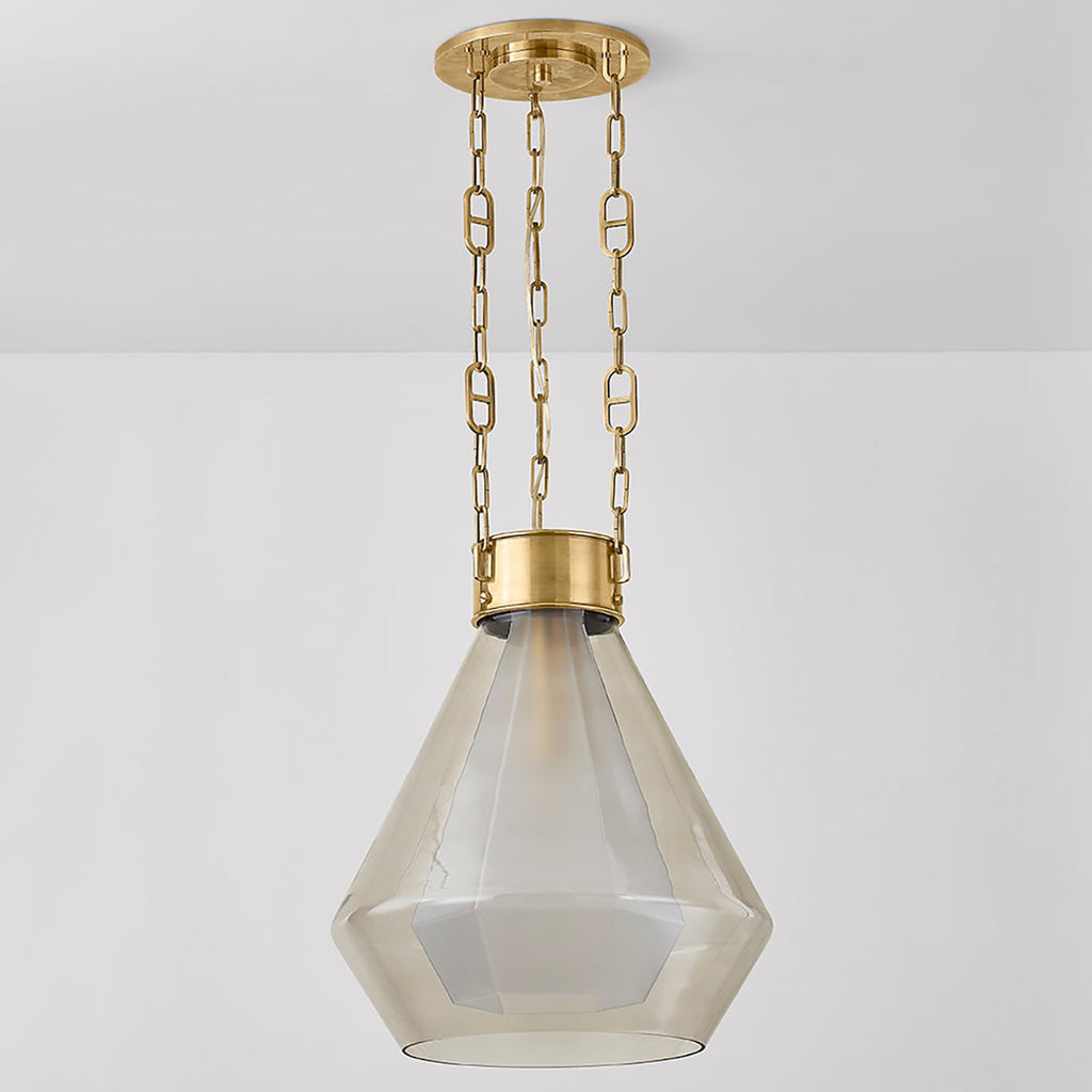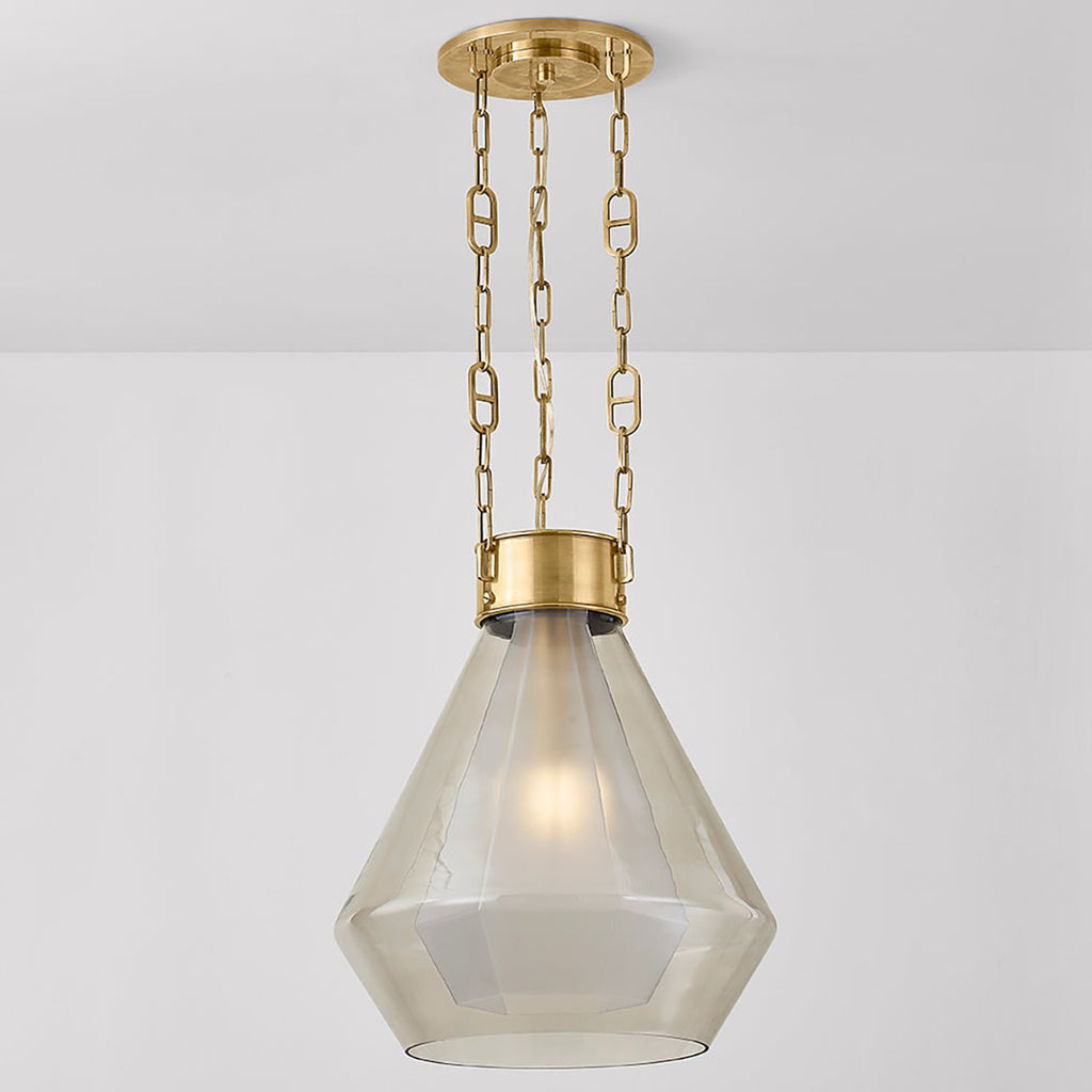 Taking cues from the faceted shapes found in Noz Nozawa's jewelry design sketches, Corbett Lighting Tragus resembles a gem suspended on a necklace. The design features a faceted inner clear glass shade and a curved outer glass in light bronze, striking a balance between intrigue and approachability. The inclusion of decorative metal detailing and a mariner chain, developed specifically for Noz, enhances the illusion. Corbett Lighting Tragus is available in two sizes in a Vintage Brass finish. Part of our Noz Nozawa collection.
