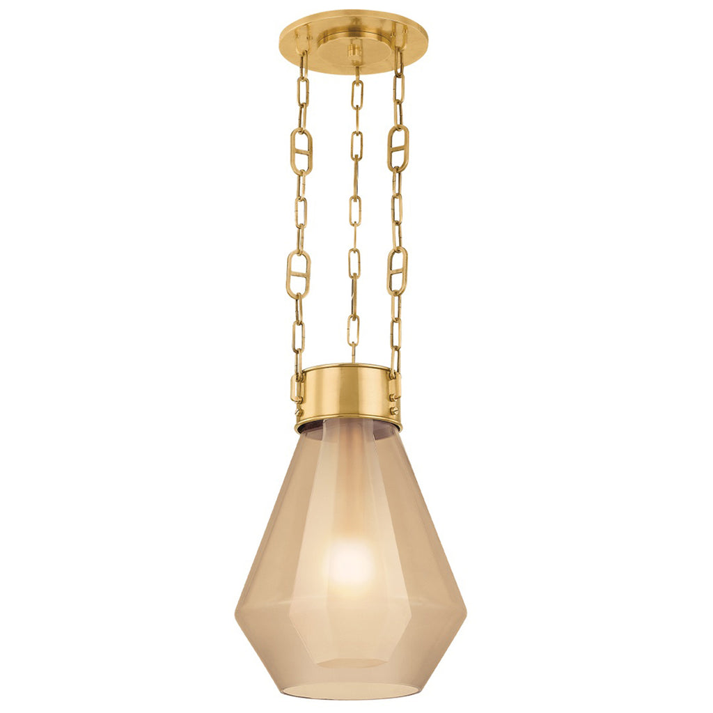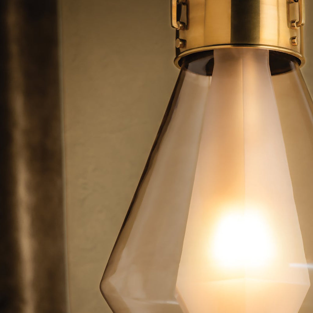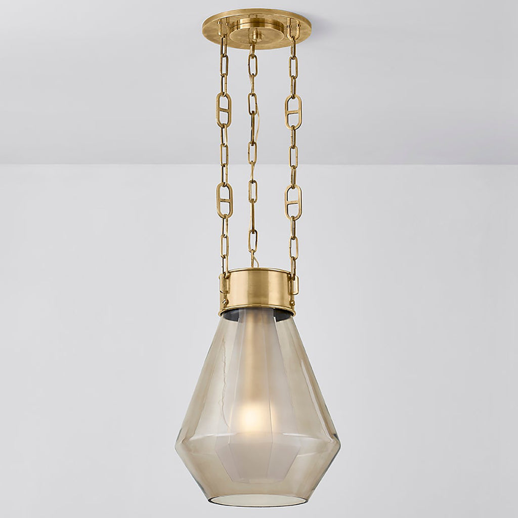 Taking cues from the faceted shapes found in Noz Nozawa's jewelry design sketches, Corbett Lighting Tragus resembles a gem suspended on a necklace. The design features a faceted inner clear glass shade and a curved outer glass in light bronze, striking a balance between intrigue and approachability. The inclusion of decorative metal detailing and a mariner chain, developed specifically for Noz, enhances the illusion. Corbett Lighting Tragus is available in two sizes in a Vintage Brass finish. Part of our Noz Nozawa collection.