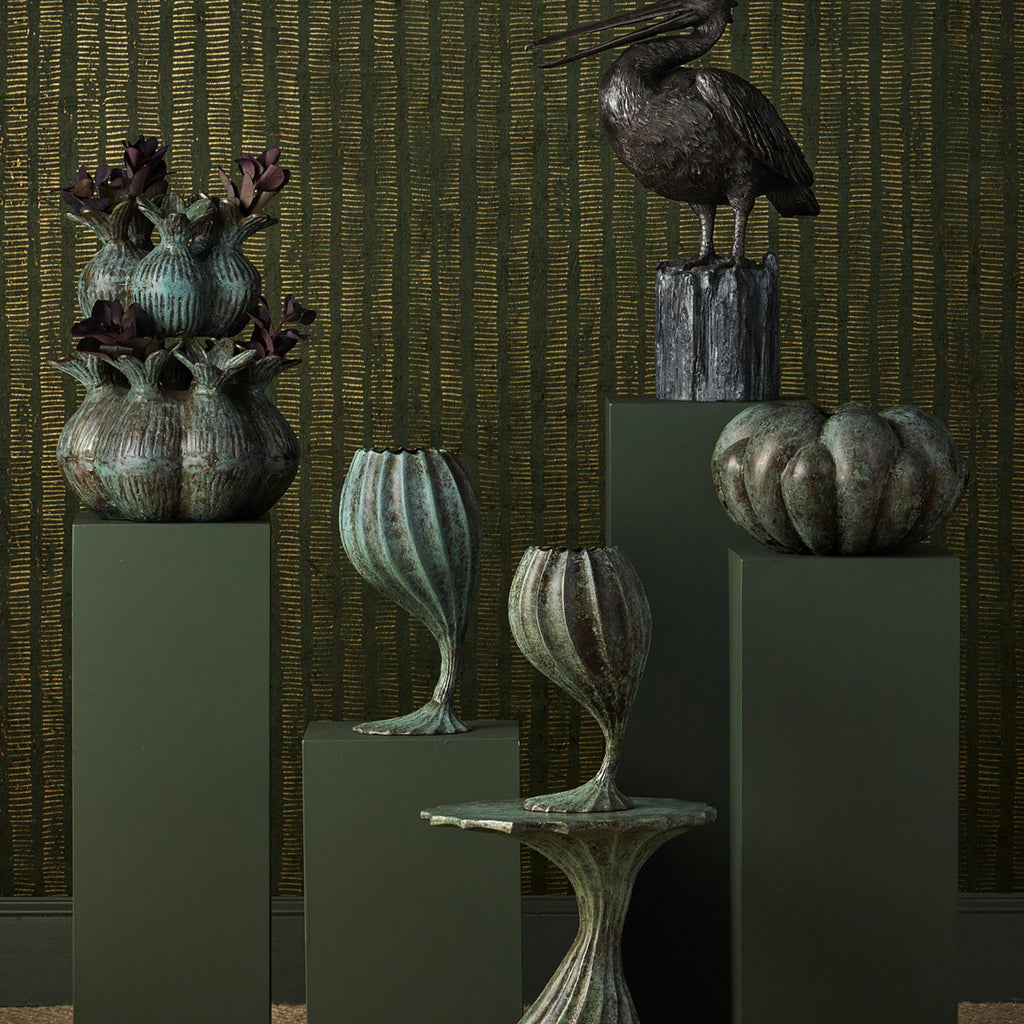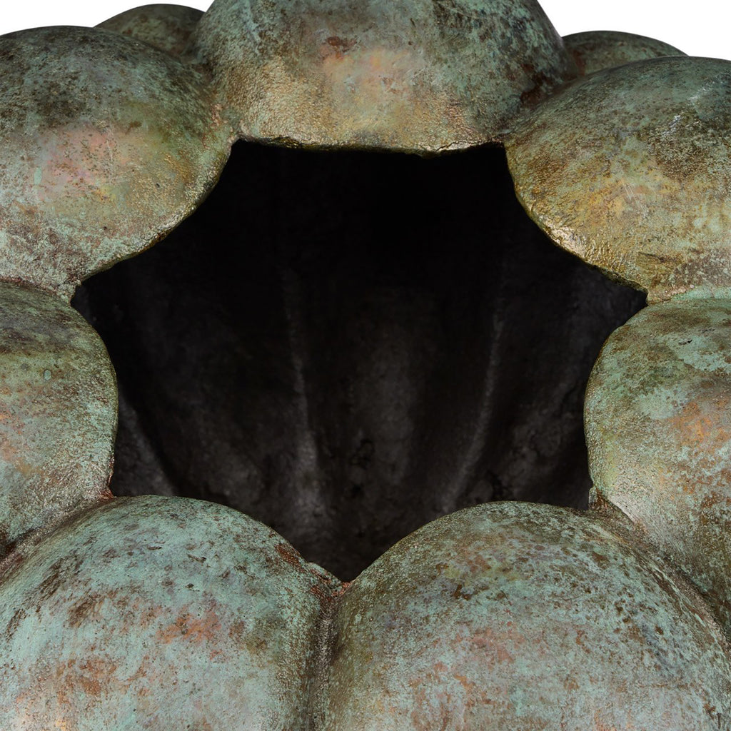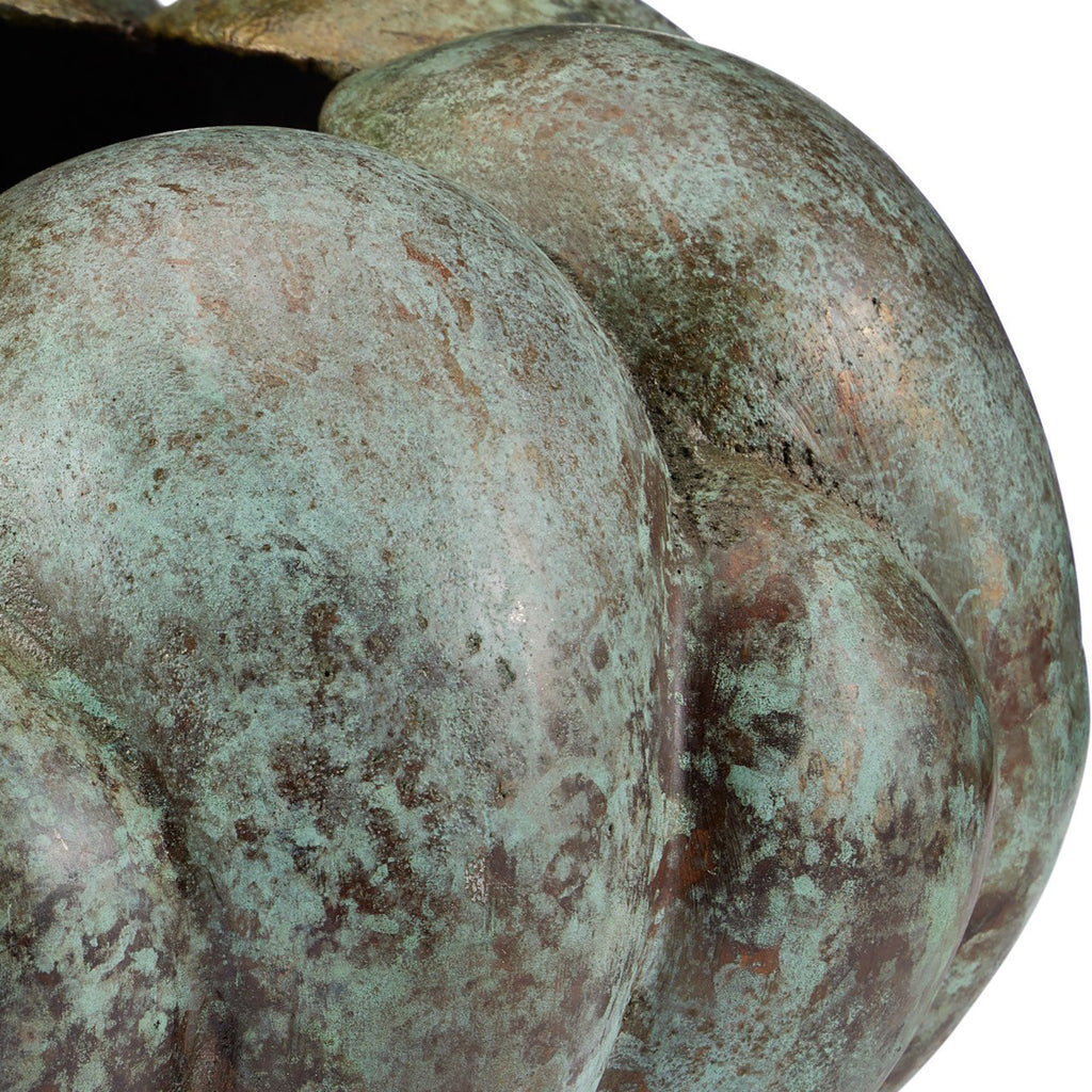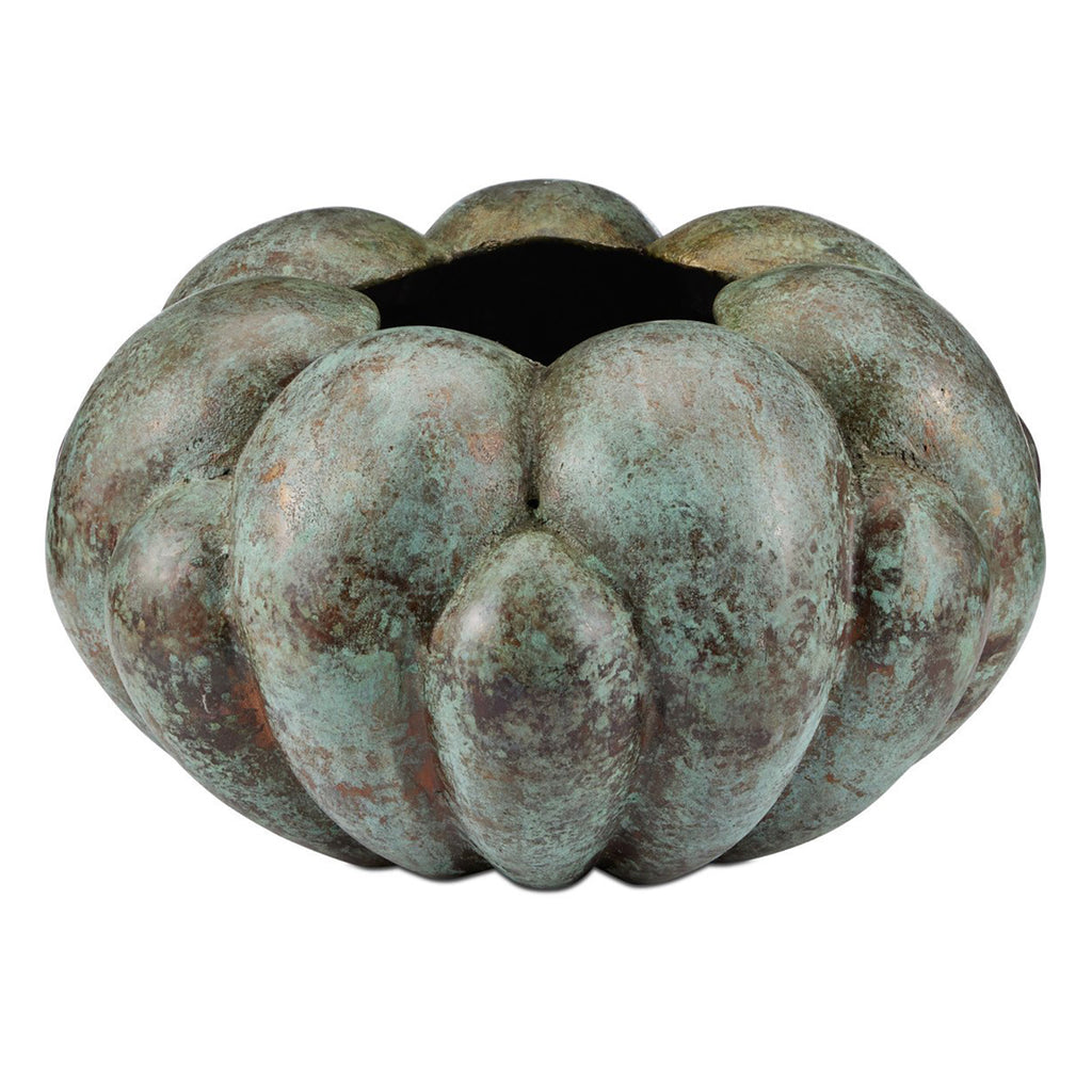 The Currey & Co Rotterdam Bowl is a decorative vessel made of cast aluminum with surfaces covered in an incredible raw patina. Once this scalloped bowl is pulled from the mold, it is oxidized to make it appear naturally aged like a fine antique. The coppery-green vessel will bring interest to any vignette.