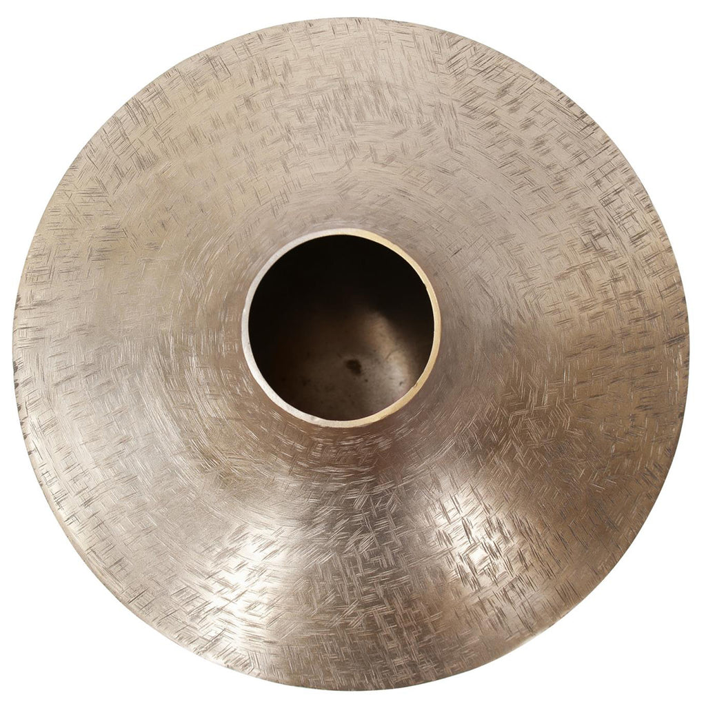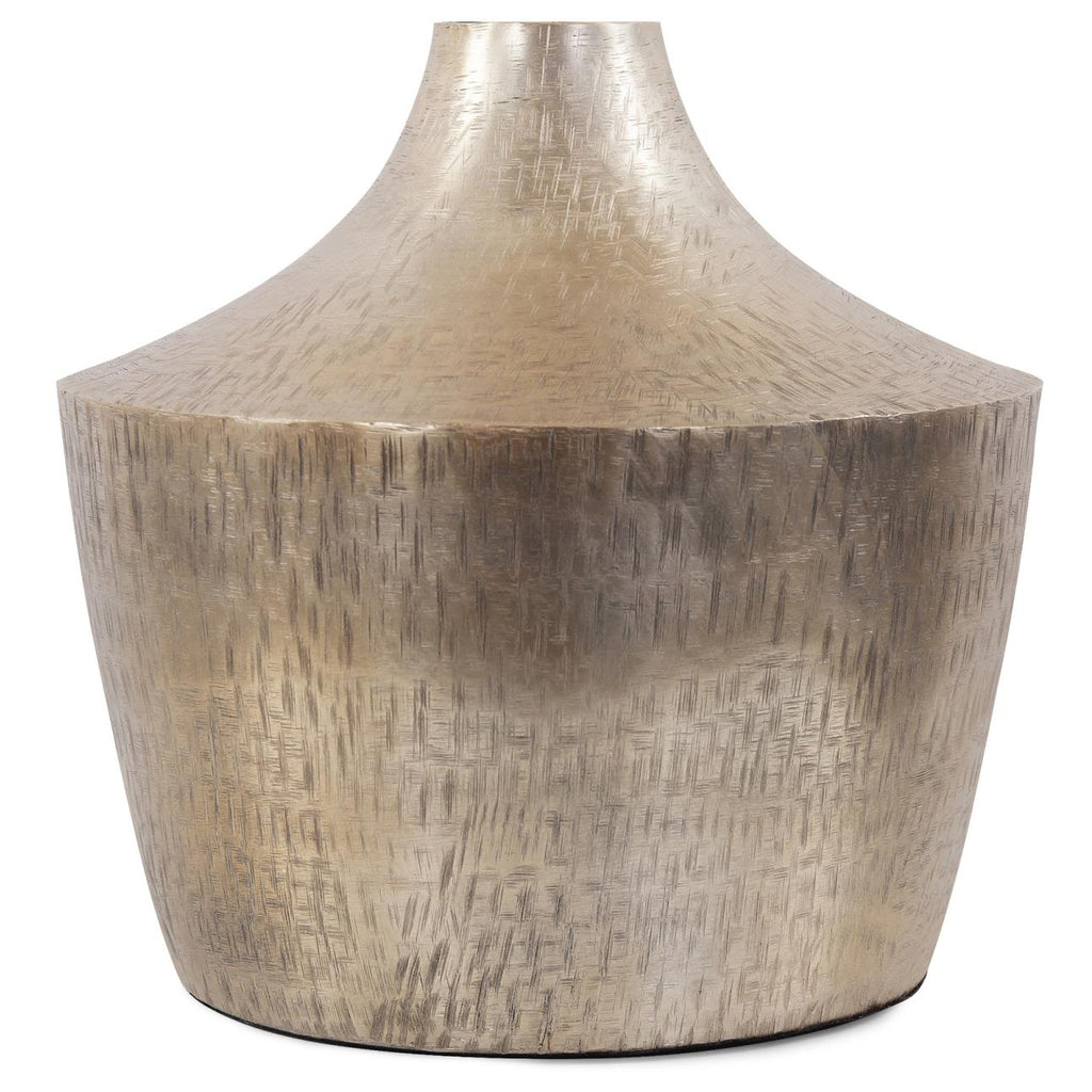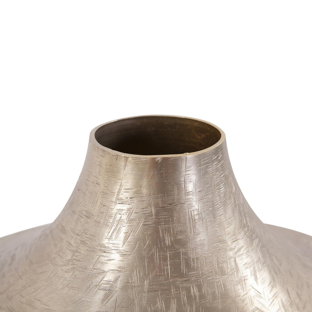 Beautifully forged and crafted by hand, the intricate etched crossway pattern helps to bring each shape to life with added dimension and texture. The curved neck large vase in a lustrous champagne finish makes a great accent piece all alone or filled with a few artificial sprigs to lighten up a room.