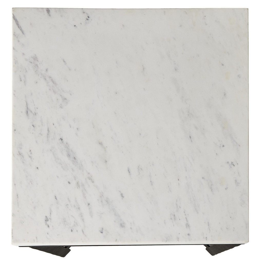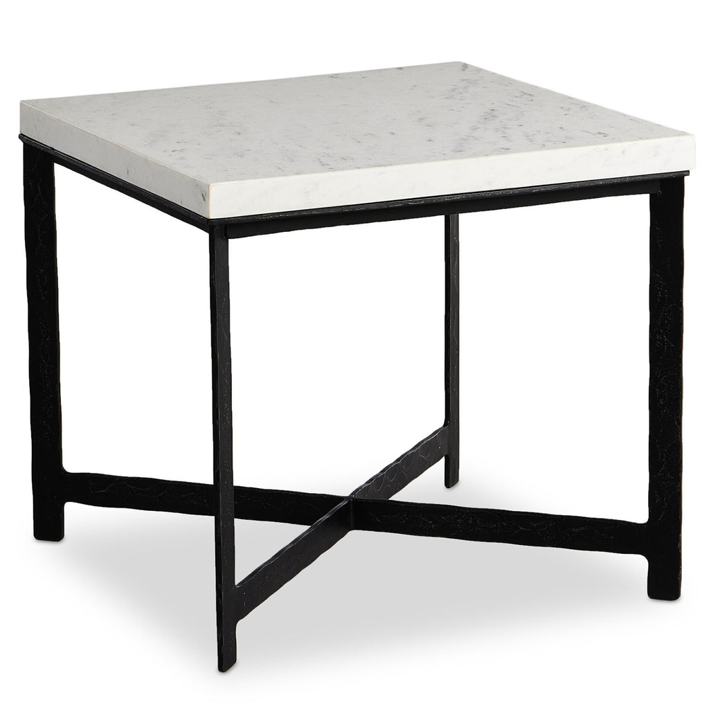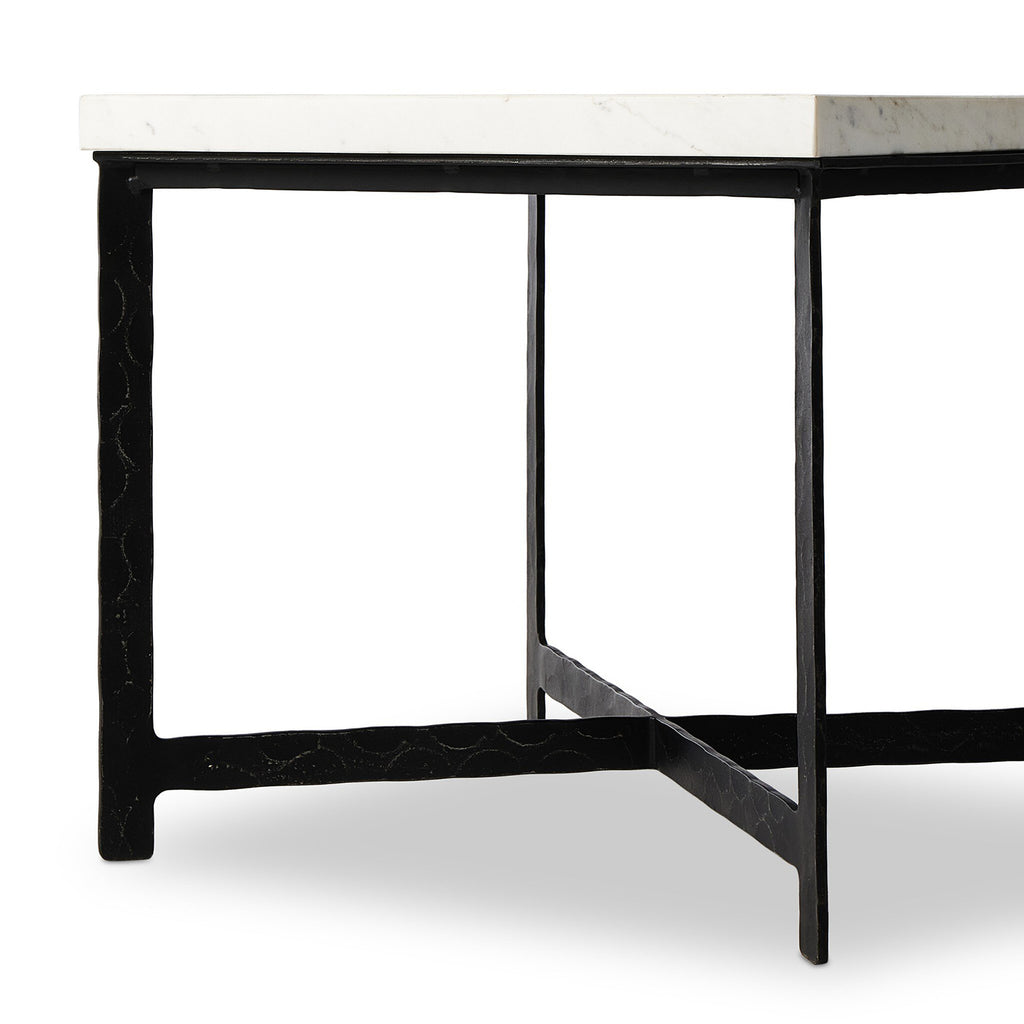 An open, hand-hammered base of black iron supports a squared top of white marble, for a beautifully streamlined look with rustic vibes.