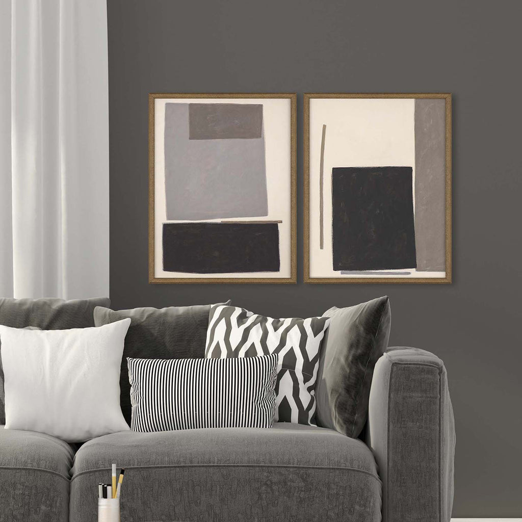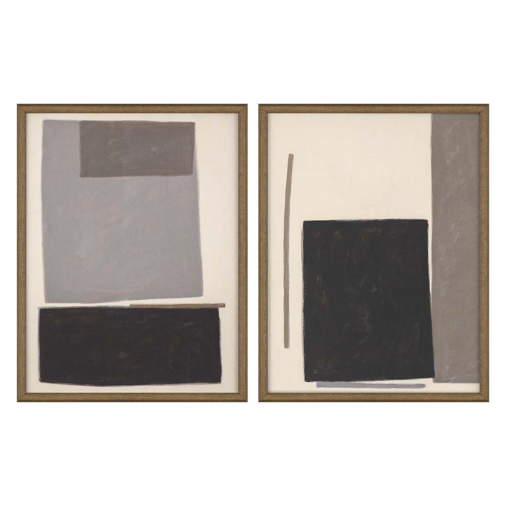 Color blocks are artfully arranged. Framed in an antique gold wood molding with an embossed weave pattern. Sold as set of two.