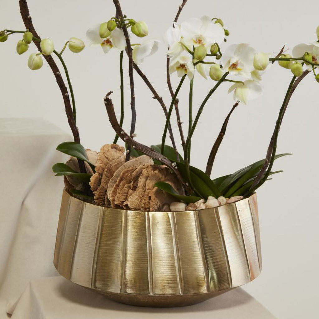 Overflowing florals & lush orchids are all that's missing from the stunning, extra-large, gold metal Helena Bowl. This versatile, watertight florist staple is ideal for greeting guests in a lobby, hotel space, or any wedding & event that needs a showstopping display. Vertical surface ridging & a wide oval shape offers a modern take on classic design.