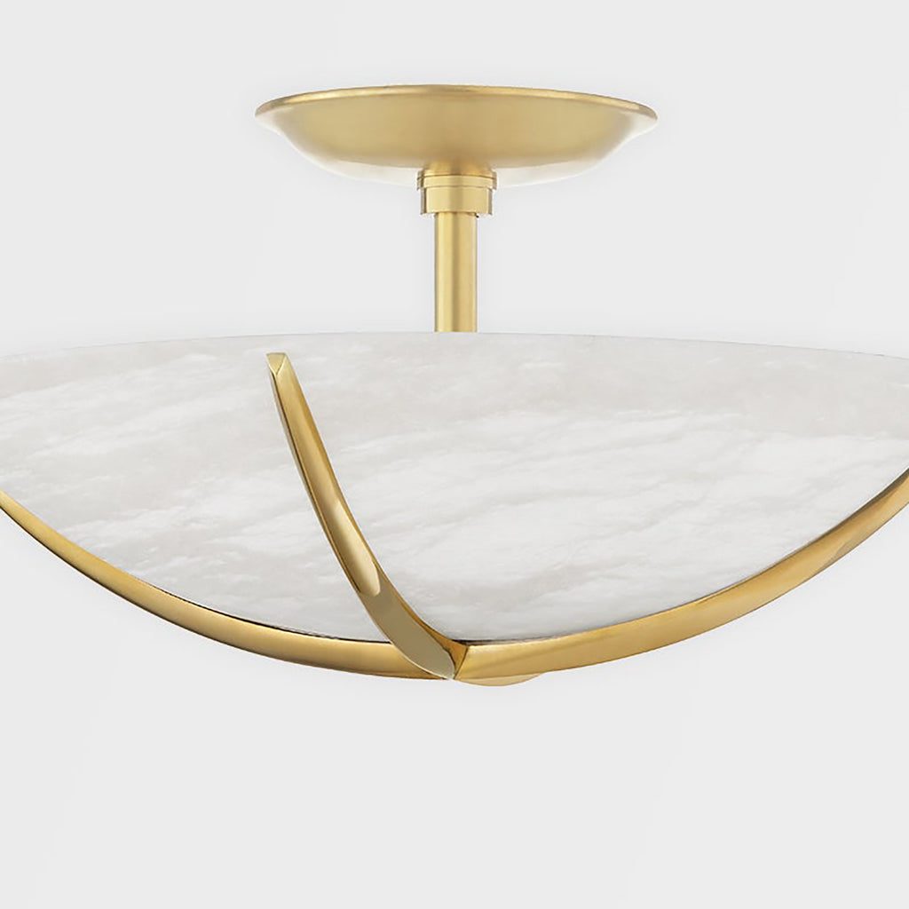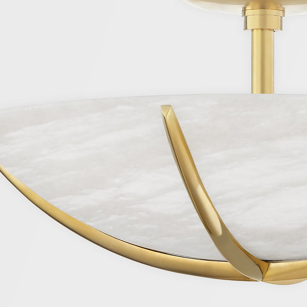 Smooth, curved metal arms cradle Spanish white alabaster shades giving Hudson Valley Lighting Wheatley a soft, subtleness that works with any design style. Candelabra LEDs illuminate the alabaster and cast light down from the 7" pendant or up from the 22" pendant, semi-flush and sconce. Choose Aged Brass or Polished Nickel.