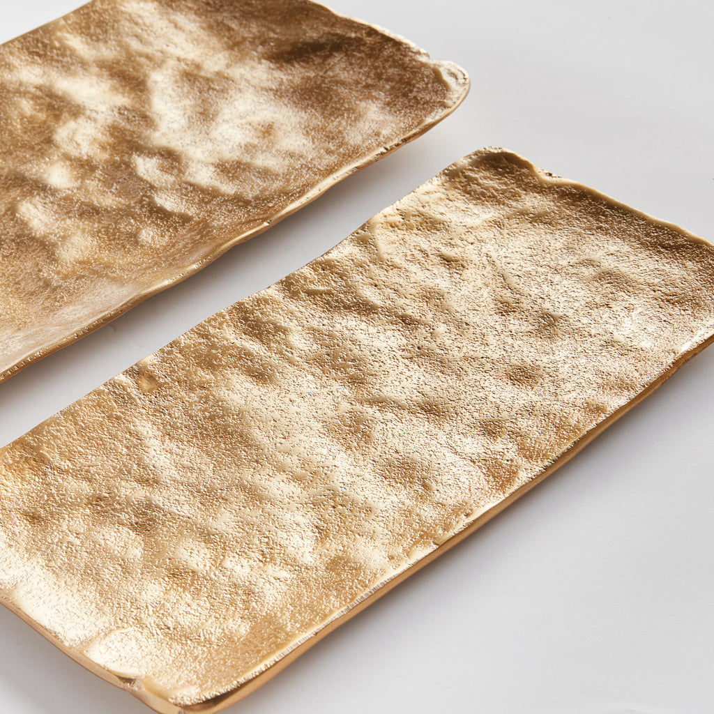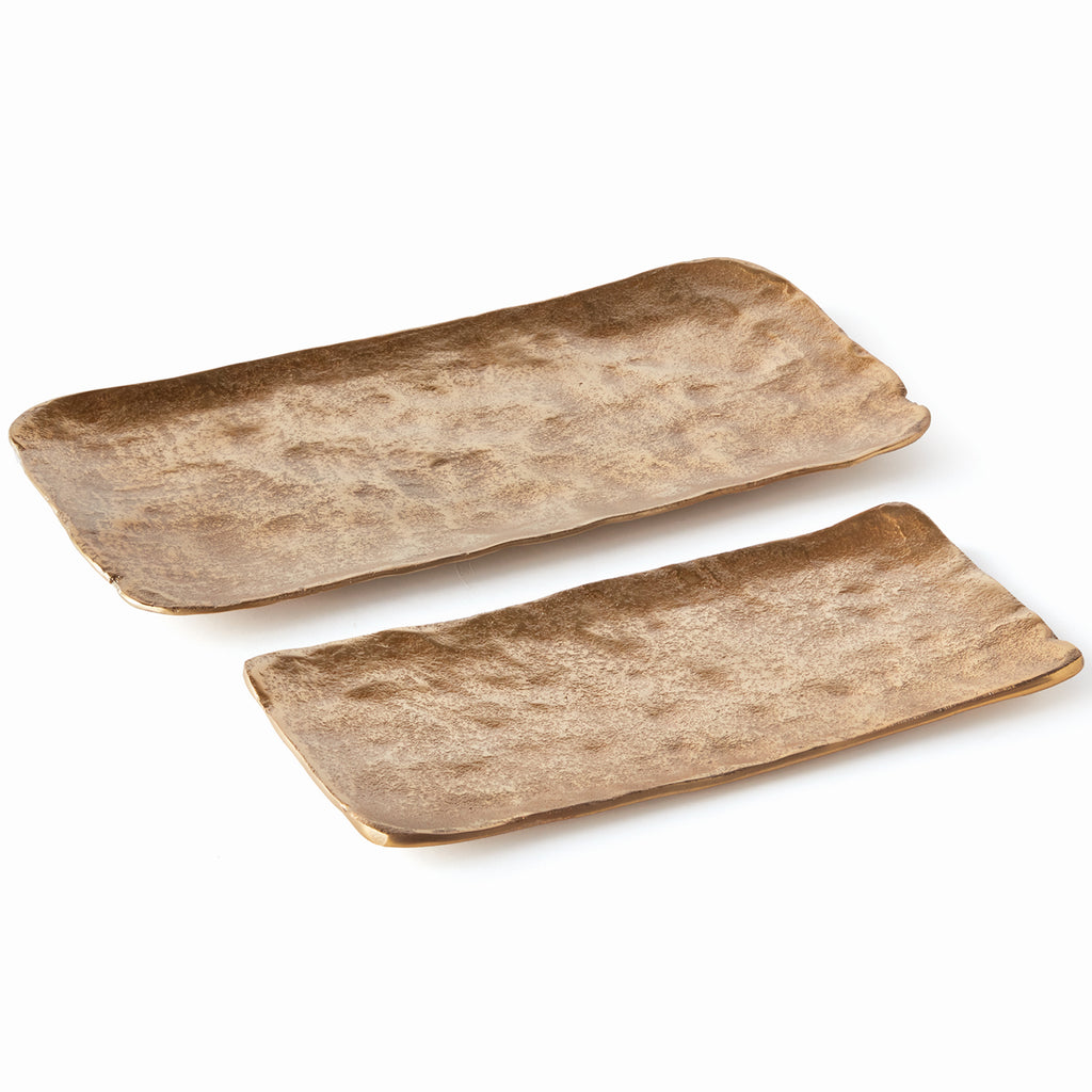 Modern, rectangle forms and rounded edges make this pair of cast aluminum trays unique. Line with a collection of candles, or accessorize with whatever fits your style for a contemporary touch.