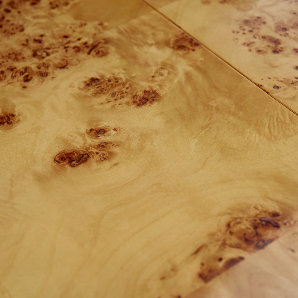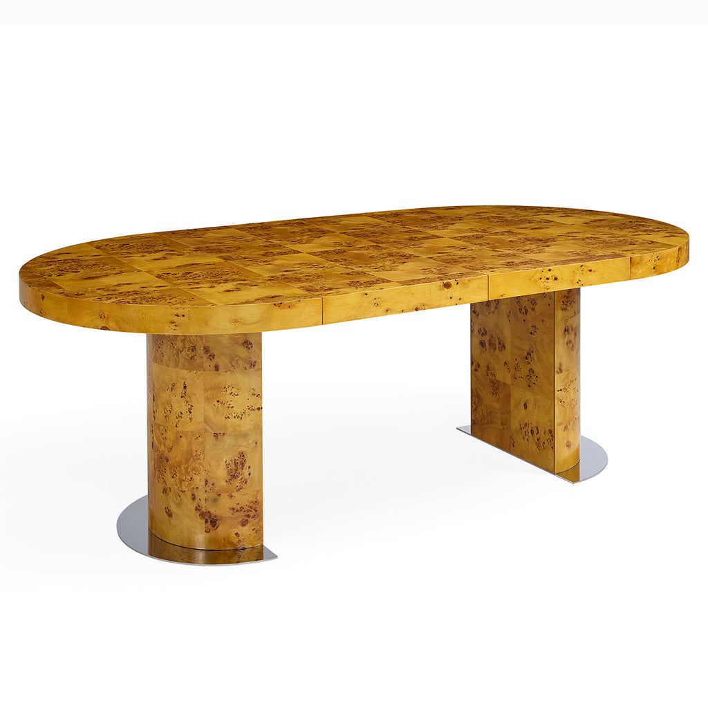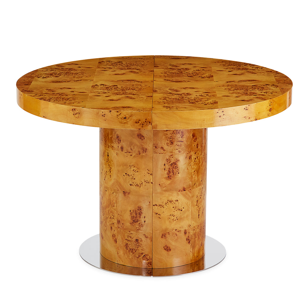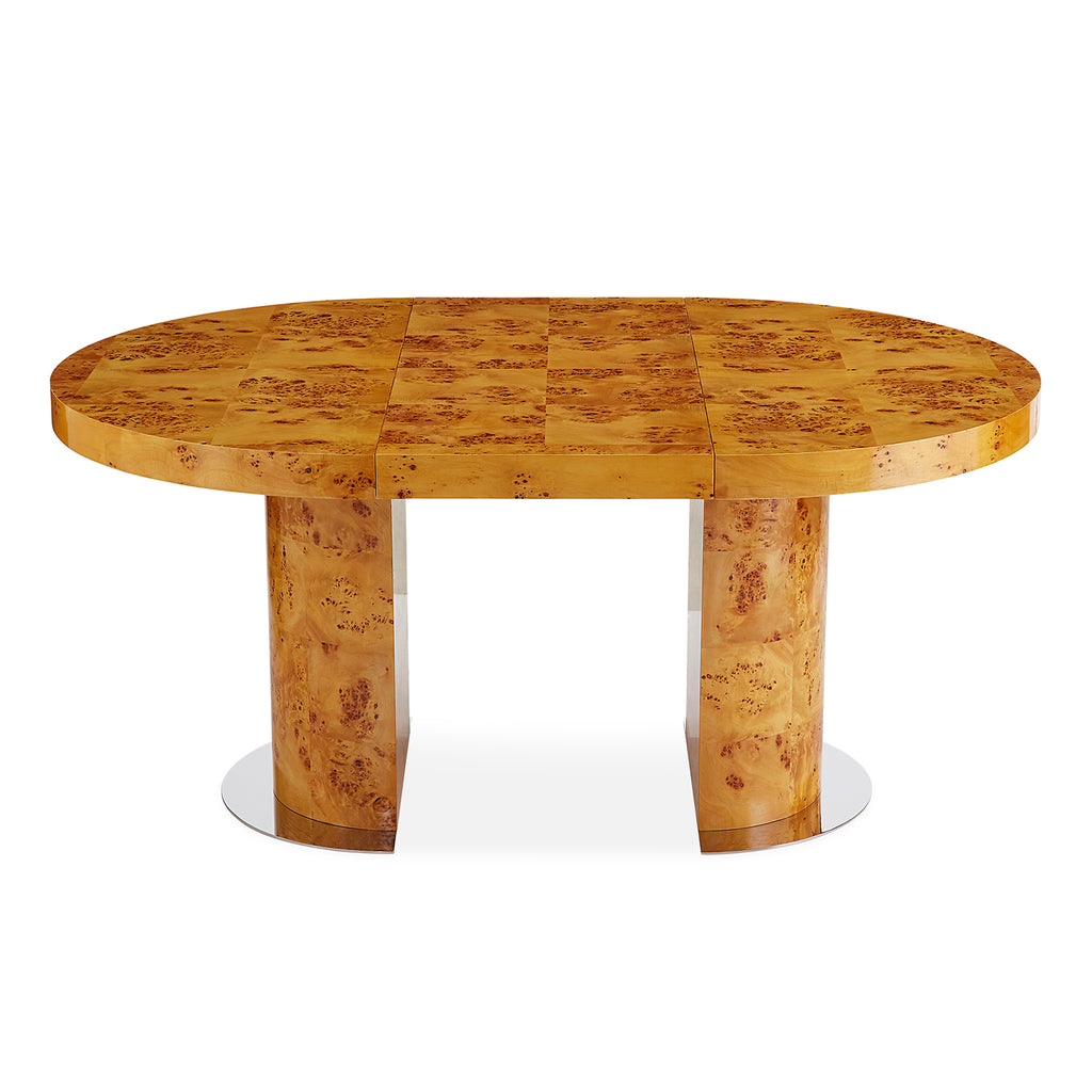 Architectural rigor meets the warmth of burled wood in our Bond collection. Organic, worldly, and wonderfully warm, our Bond Round Dining Table is crafted from naturally honey-hued, pieced mappa wood treated to a durable satin matte finish. Featuring a nickel accented cylindrical base which splits to accommodate a two-leaf expansion, totaling 40" extra inches for comfortably seating up to 10. Perfect for a posh Park Avenue penthouse or a louche Tribeca loft.