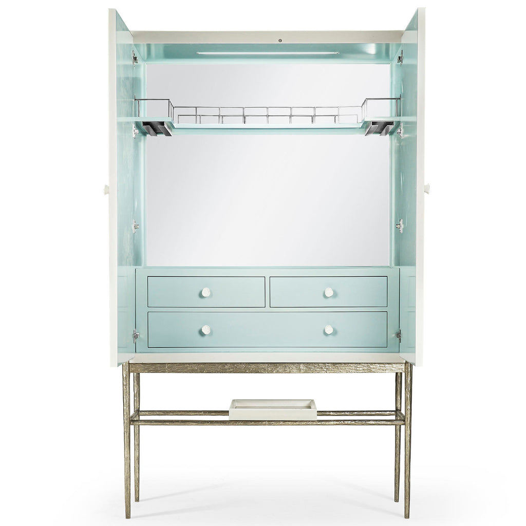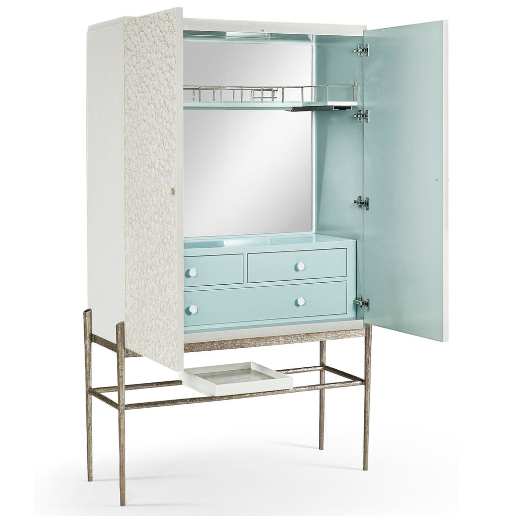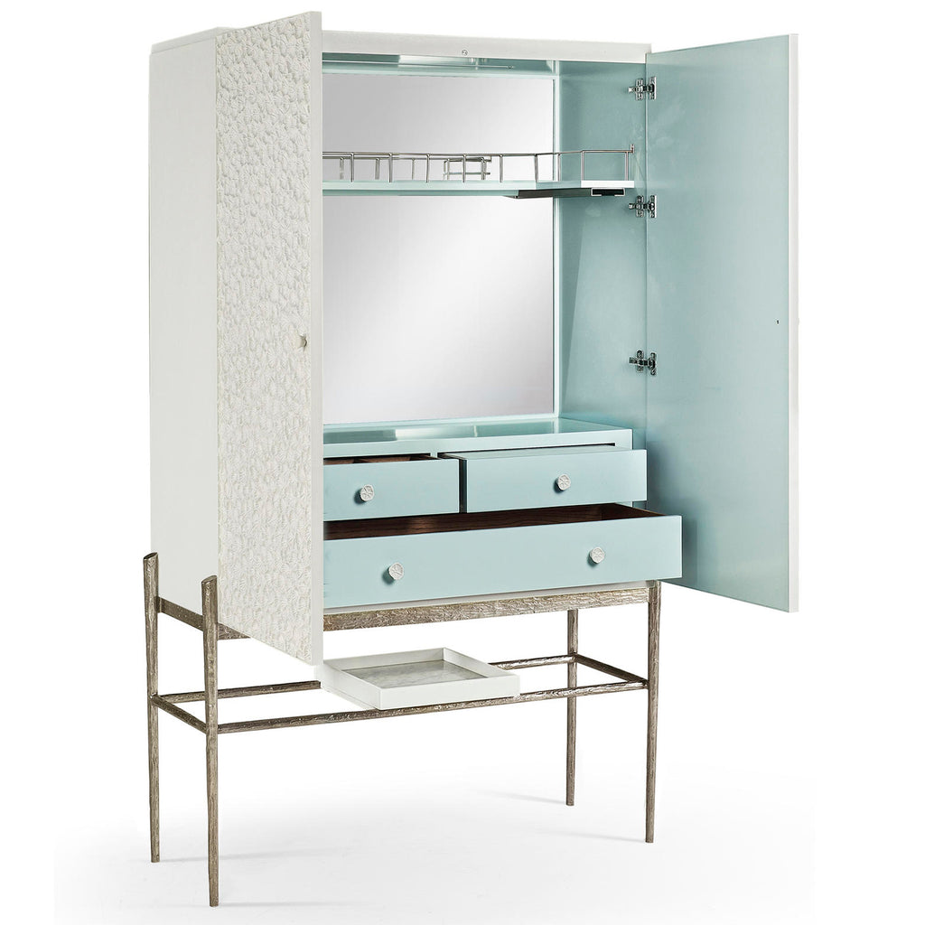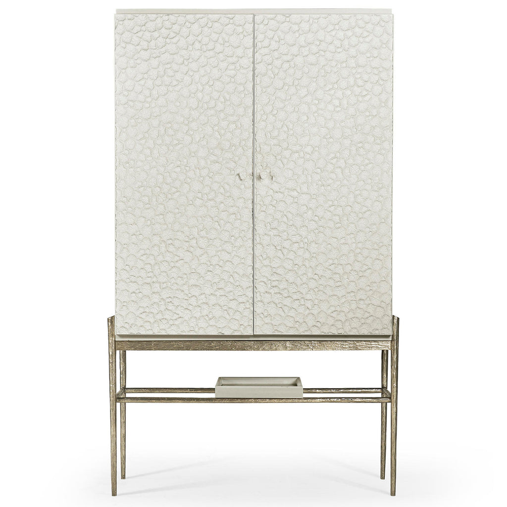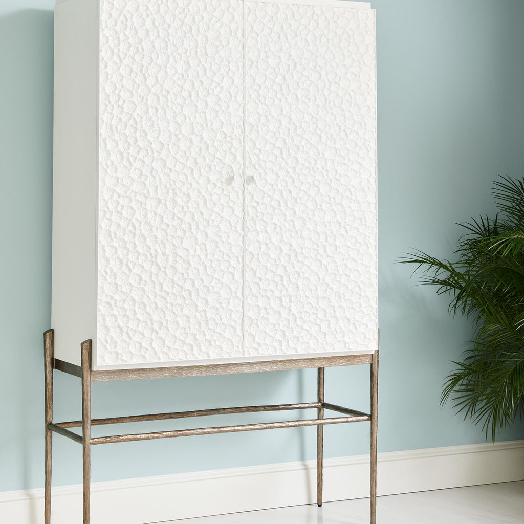Inspired by fossilized coral, the Jonathan Charles Water Pelagic Cast Metal Bar boasts an intricate pattern on metal doors produced by lost wax casting. A white oak case perches on dramatically tapered cast metal legs with a lower glass shelf for additional storage. With an interior swathed in Nebula Azul, Pelagic makes a statement open or closed.