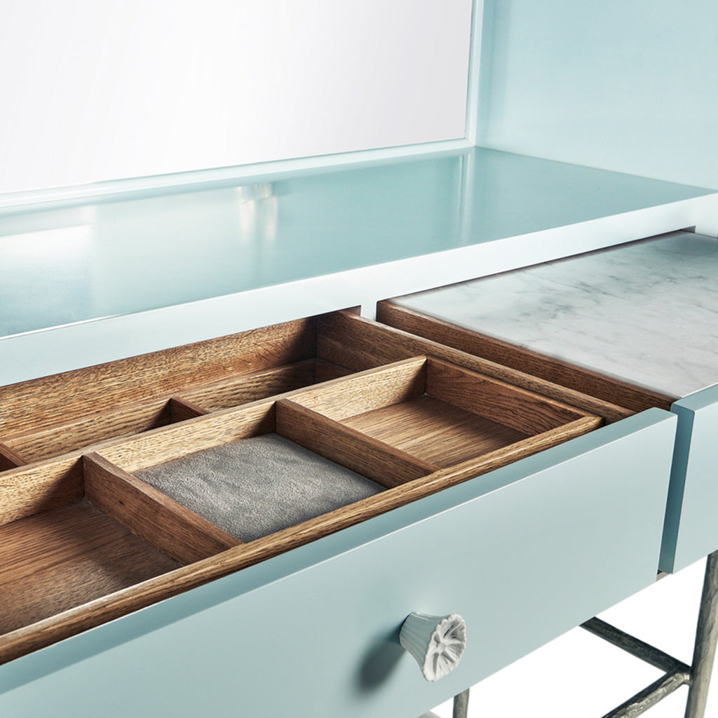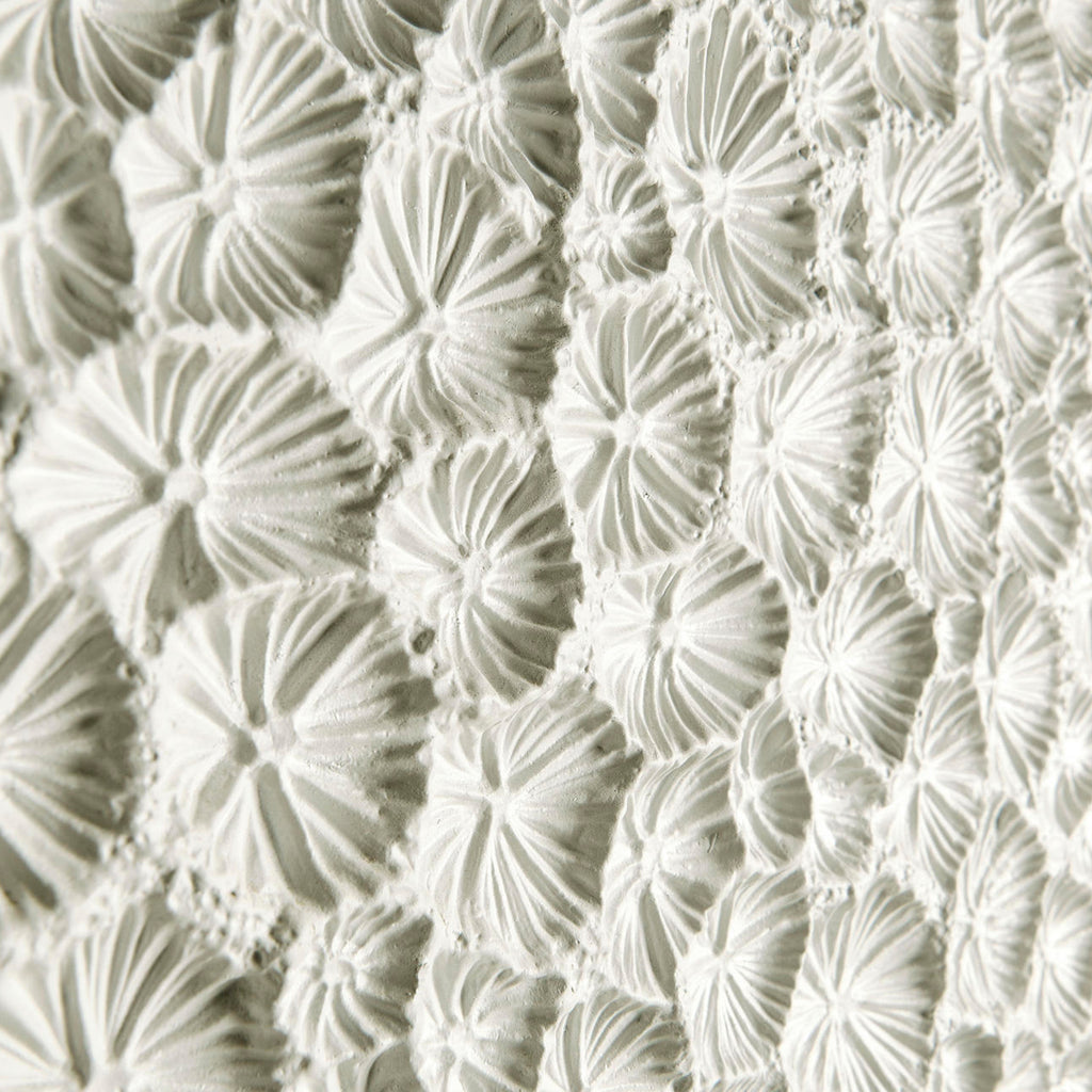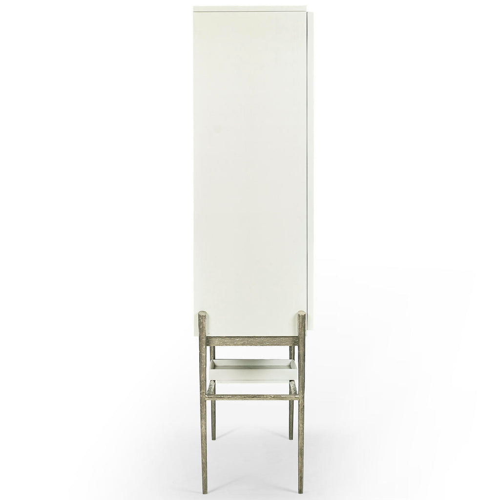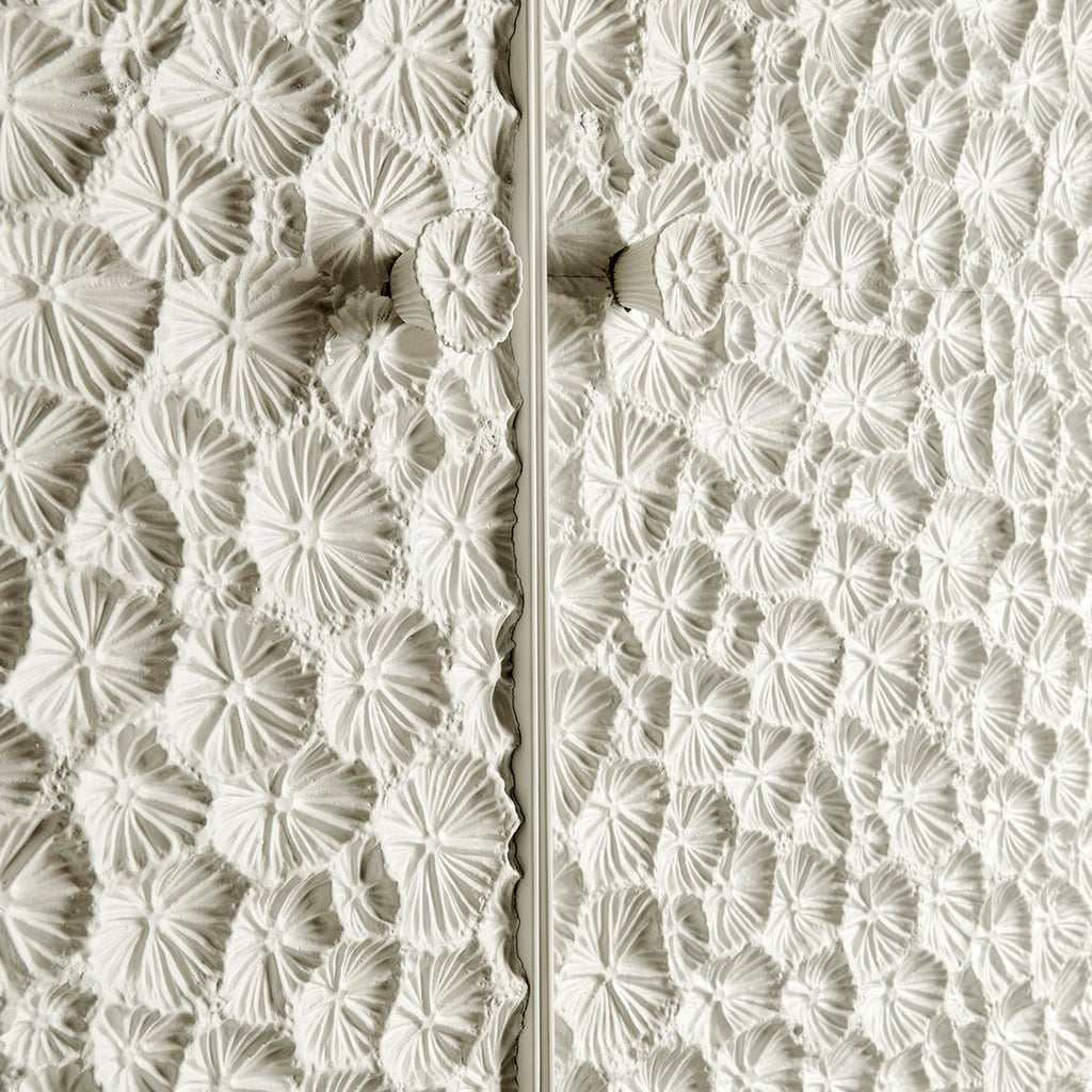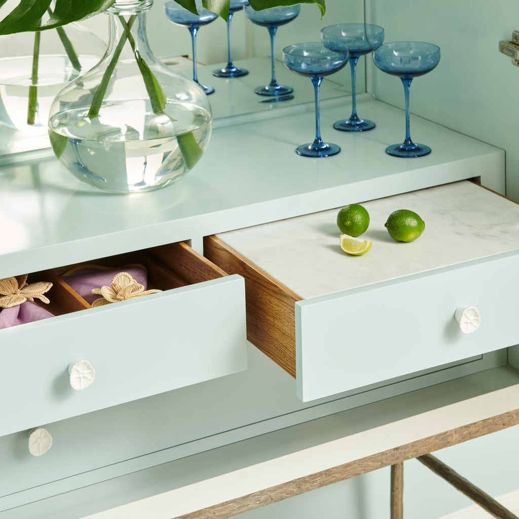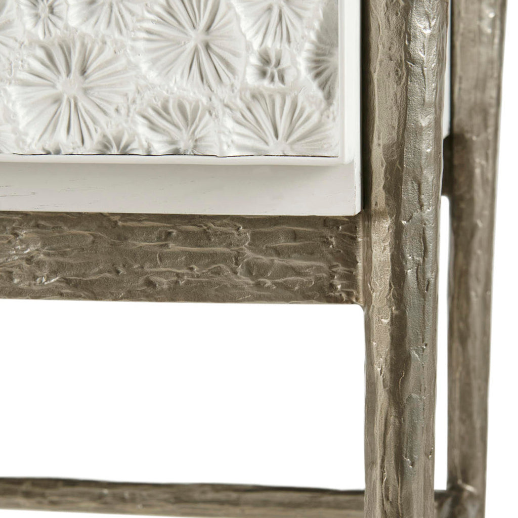 Inspired by fossilized coral, the Jonathan Charles Water Pelagic Cast Metal Bar boasts an intricate pattern on metal doors produced by lost wax casting. A white oak case perches on dramatically tapered cast metal legs with a lower glass shelf for additional storage. With an interior swathed in Nebula Azul, Pelagic makes a statement open or closed.